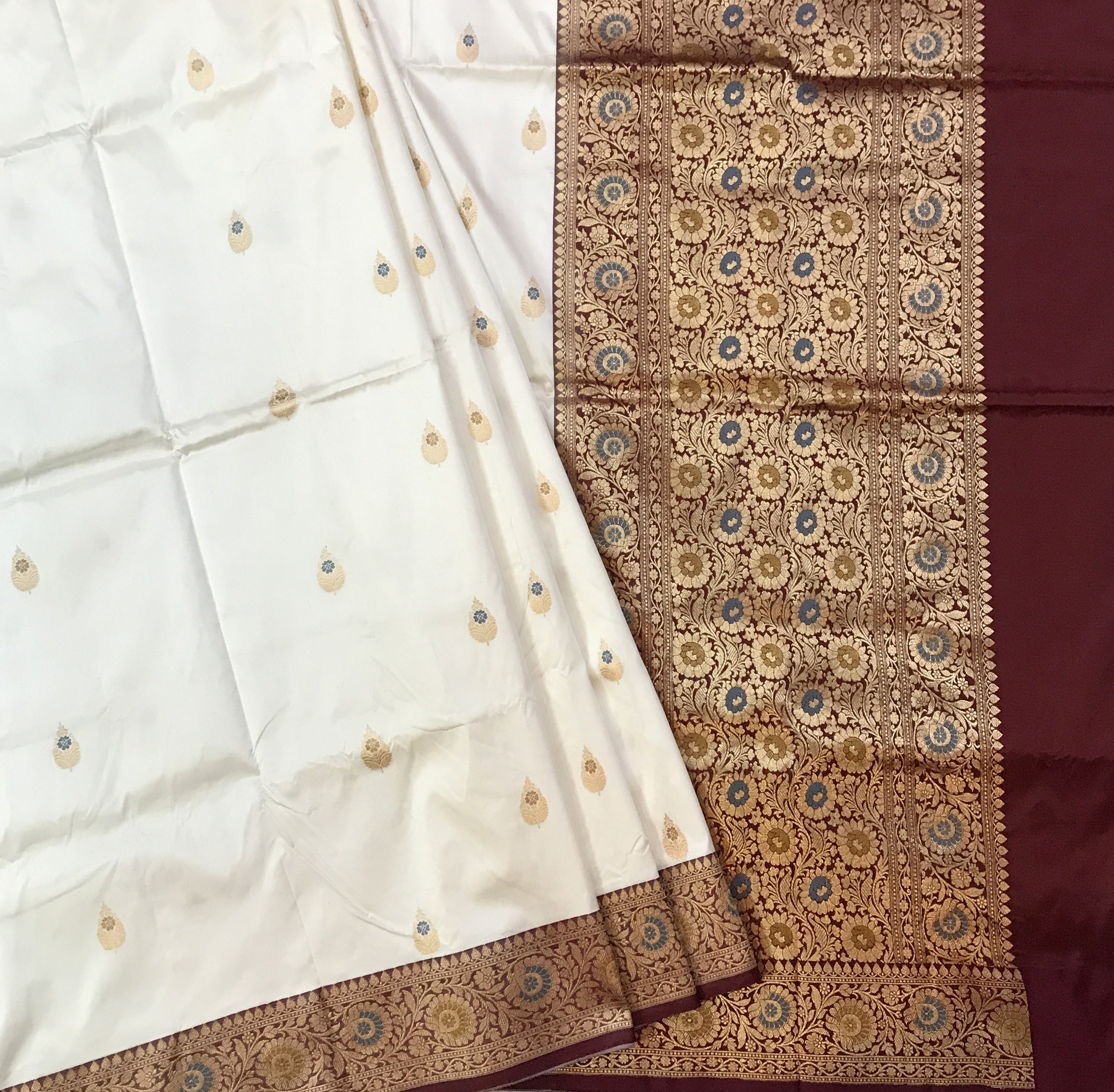A lovely shade of white colour with contrast maroon colured zari border gives this traditional Banarasi a beautiful look. This unusual combination, the intricate floral shaped-inspired meenakari butti ( motifs), in zari - all these add to the beauty of this saree . The specialty of this saree is that it has a intricated floral design on border and pallu in multicolor with beautiful meenakari, look distinctives and complementing each other.