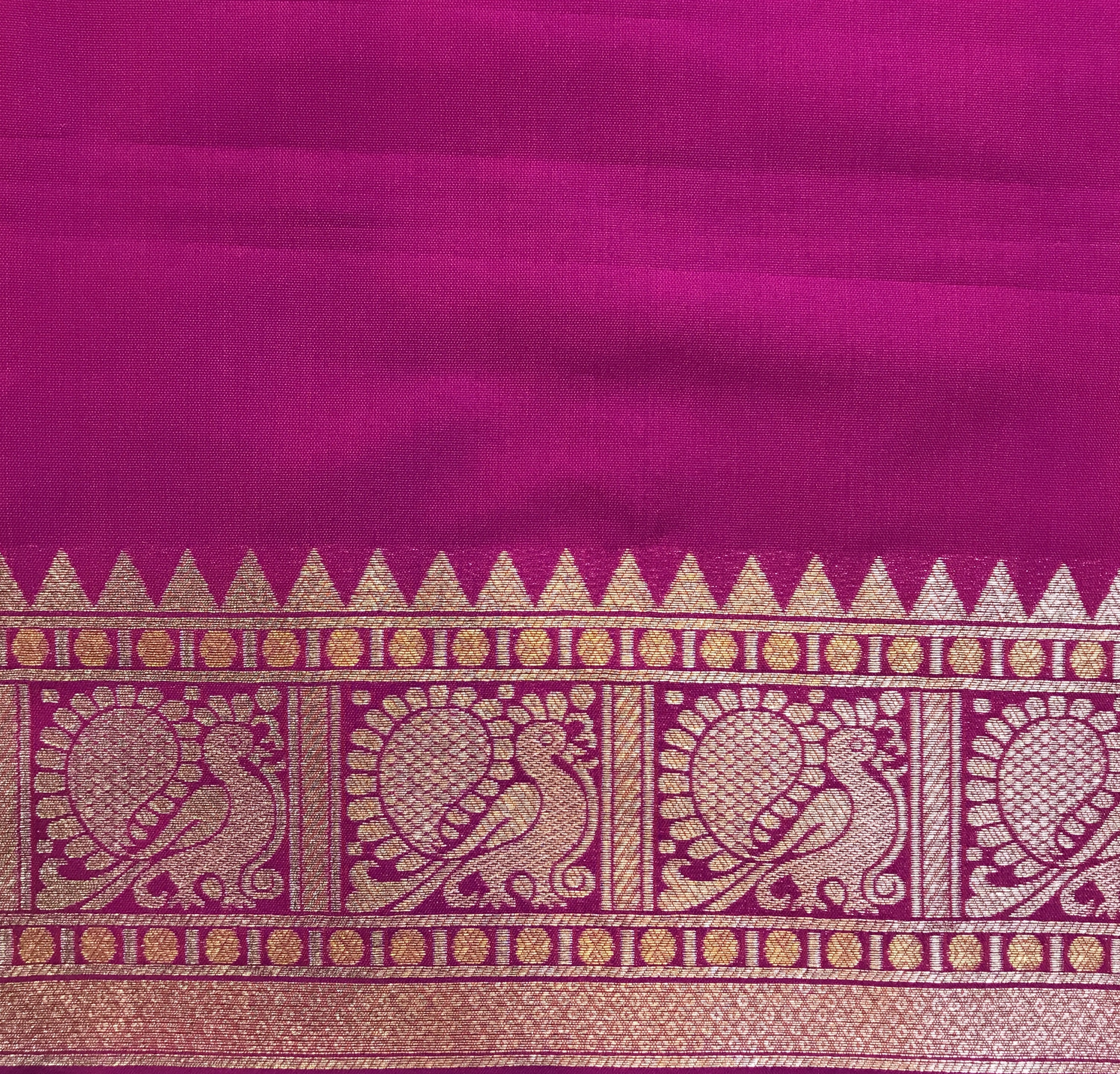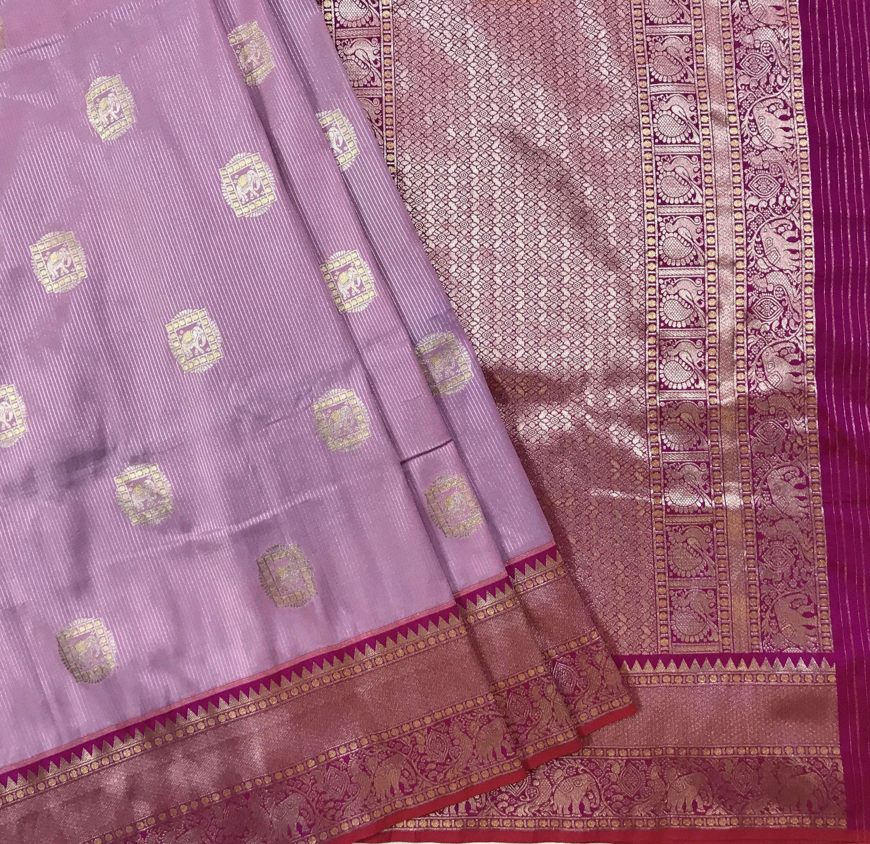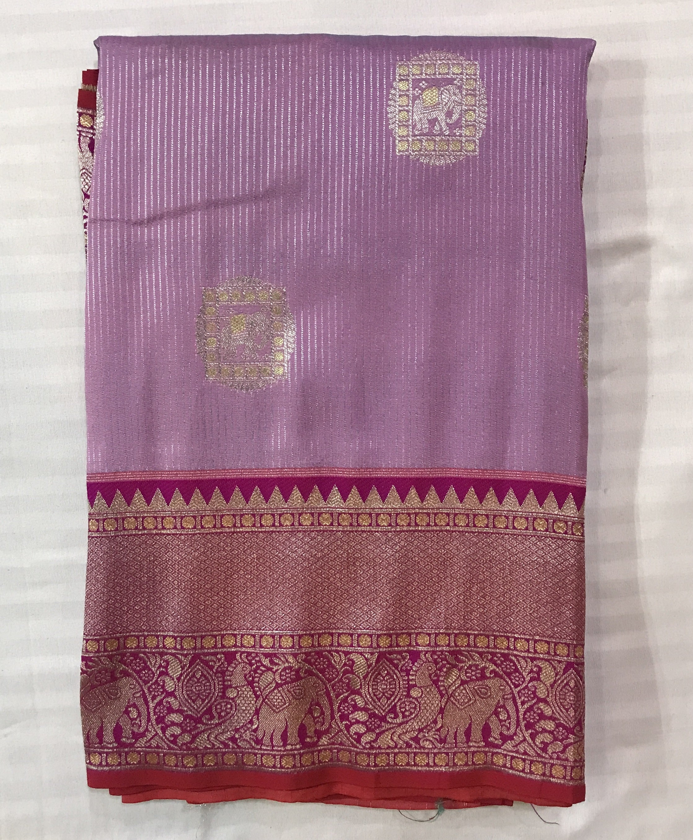 A resplendent blend of tradition and elegance, this saree embodies opulence in every drape. Crafted from pure silk, elephant motifs intricately woven with golden and silver zari, it marries the grandeur of Kanjeevaram with the allure of Banarasi. Adorned with small and large butta motifs, it exudes timeless charm and grace, making it a quintessential ensemble for any celebratory occasion.