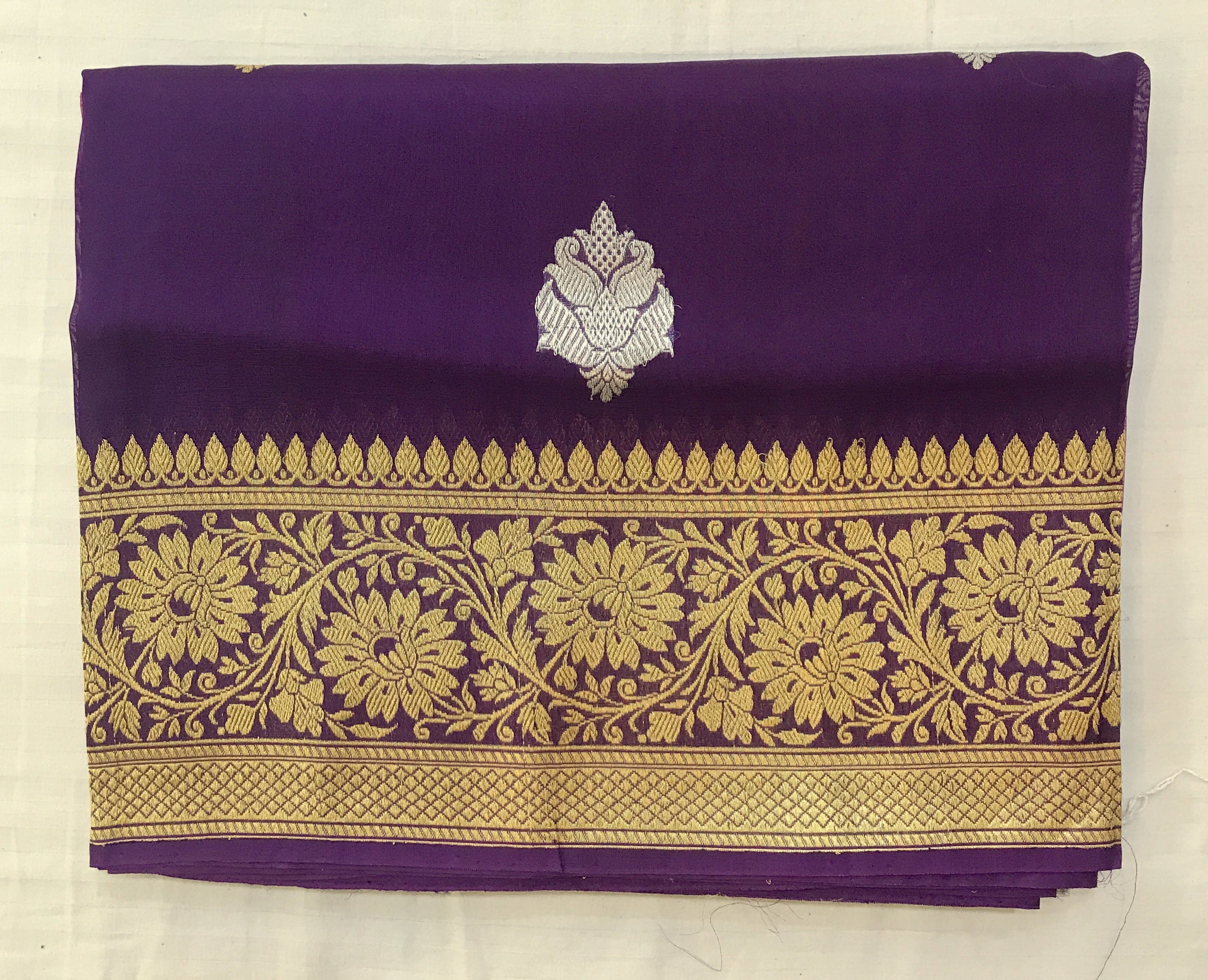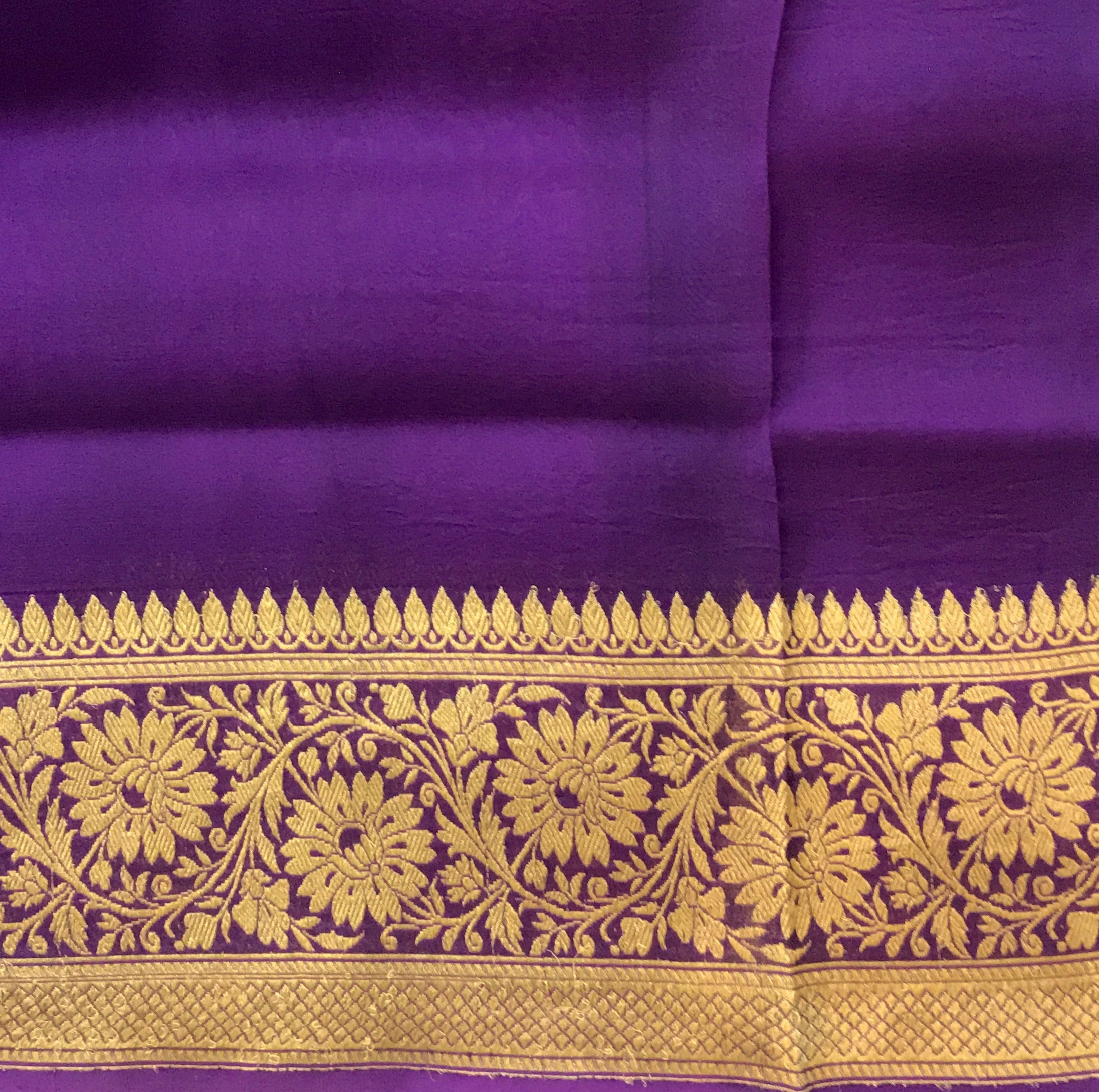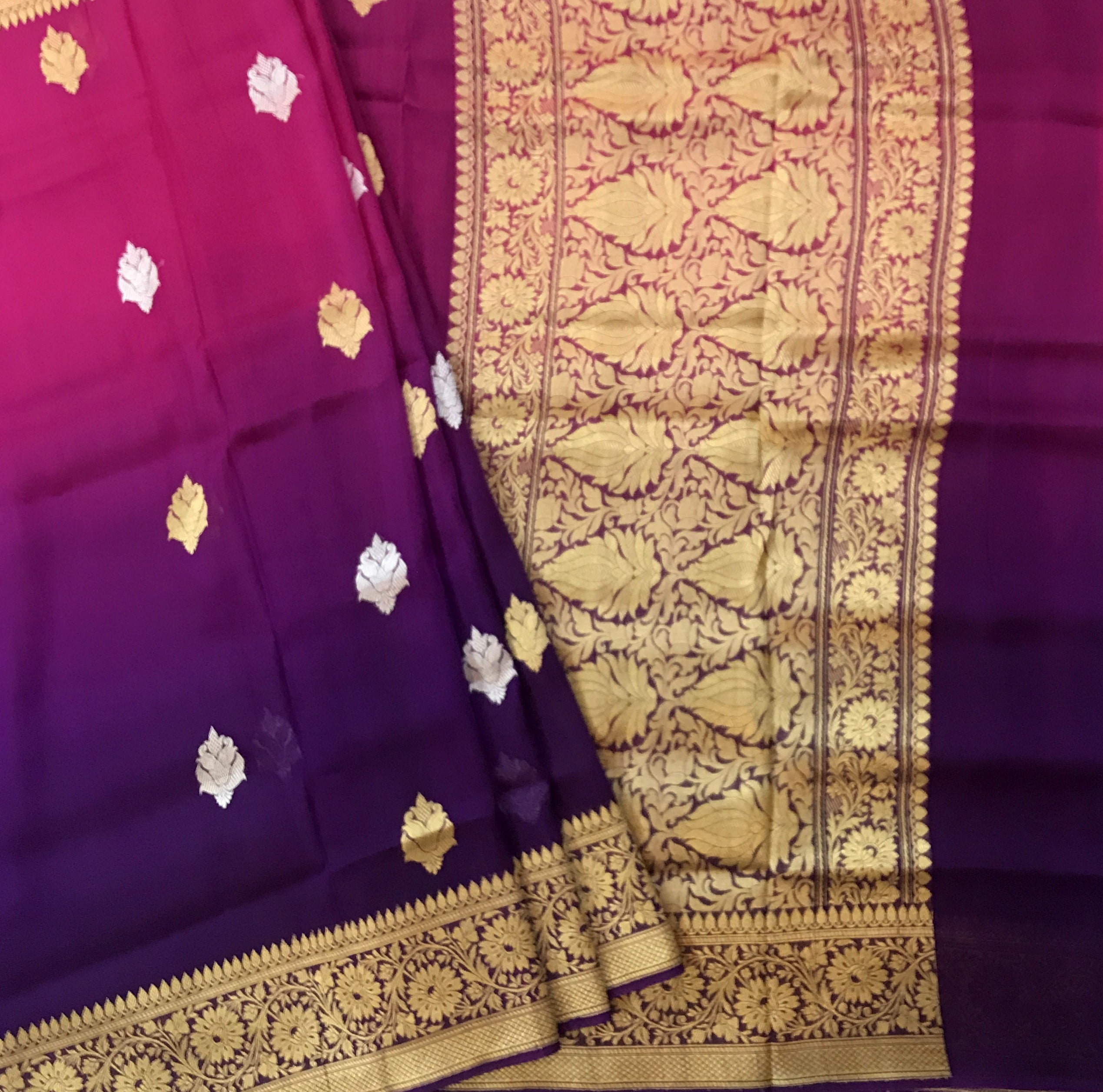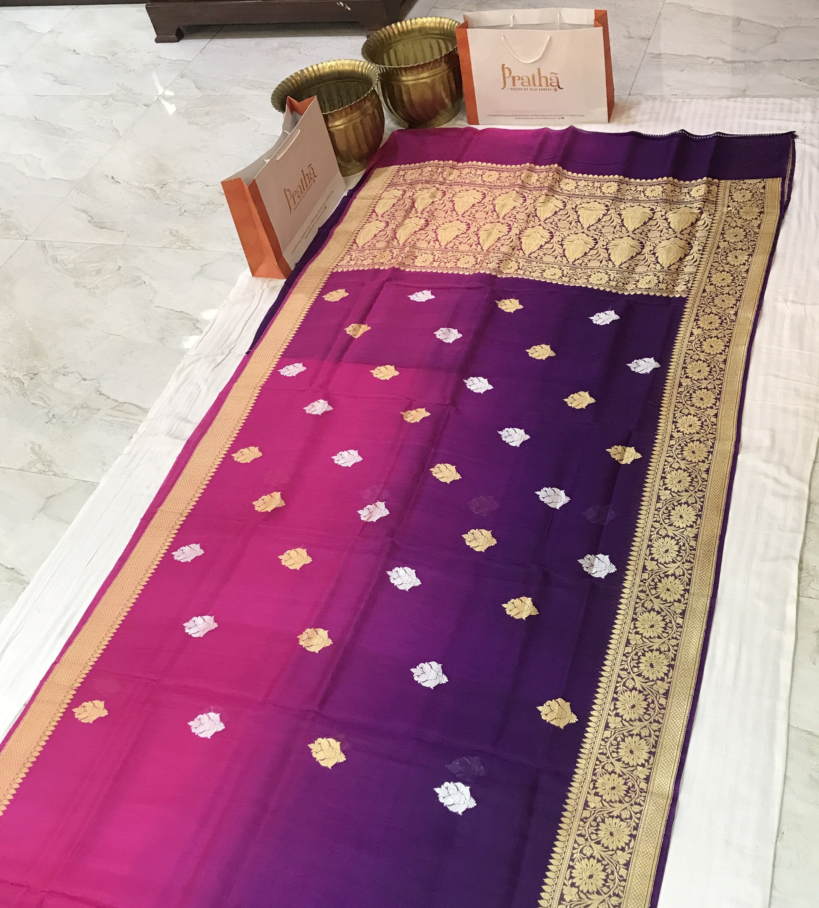 This saree truly embodies elegance and richness! The beautiful blend of deep purple and magenta creates a luxurious base, enhanced by the exquisite golden and silver zari buttis scattered gracefully across the body. The richly woven golden zari border, featuring intricate floral motifs, adds a regal touch that elevates the entire look. The highlight of this weave is its breathtaking pallu, adorned with detailed and lavish golden zari craftsmanship, giving it a timeless and majestic appeal. This gorgeous Banarasi saree is perfect for weddings, festive celebrations, and grand occasions, showcasing traditional artistry in its finest form.