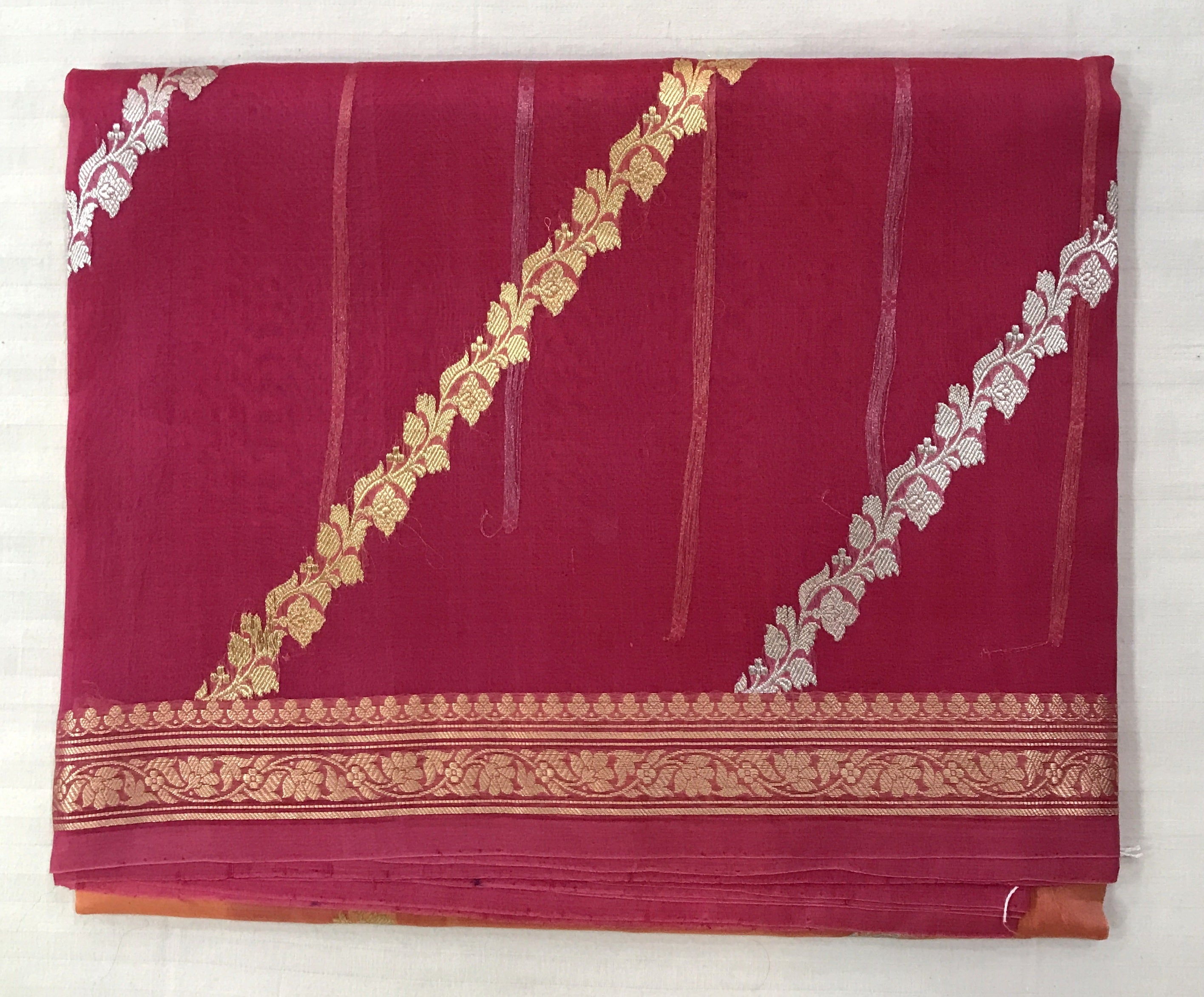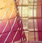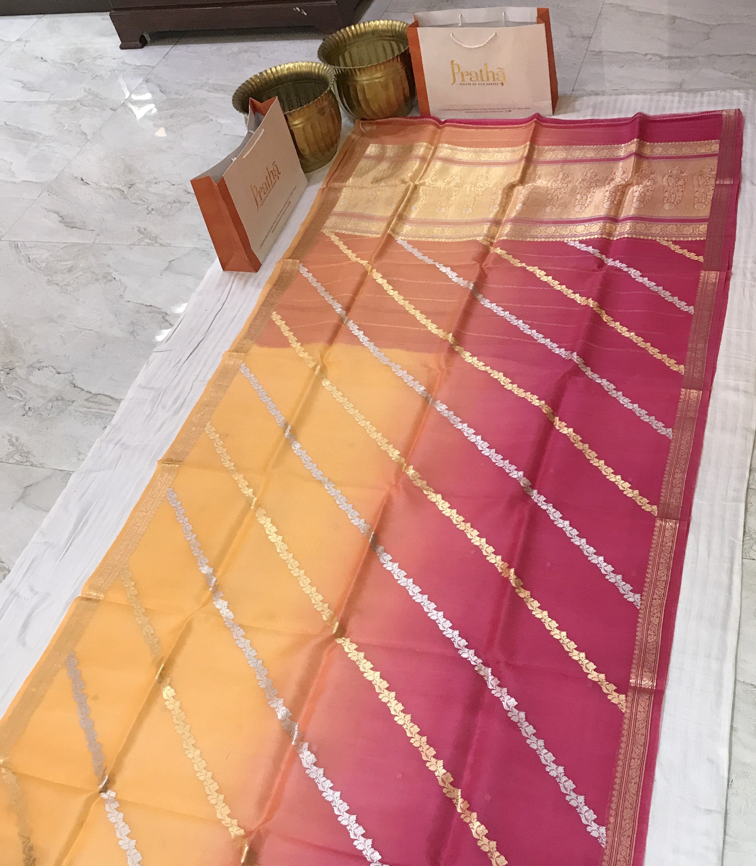 This exquisite Kora Banarasi saree features a breathtaking dual-tone ombré shading from warm golden-yellow to rich raspberry pink. The sheer yet lustrous texture of kora silk gives it a graceful and airy drape. The body is adorned with elegant diagonal floral zari vines, lending a refined and contemporary appeal. The highlight lies in the grand Banarasi pallu woven in intricate golden zari with floral motifs and fine detailing, exuding richness without being overpowering. Traditional yet stylish, this saree is perfect for festive celebrations, weddings, and occasions where understated elegance shines the most.