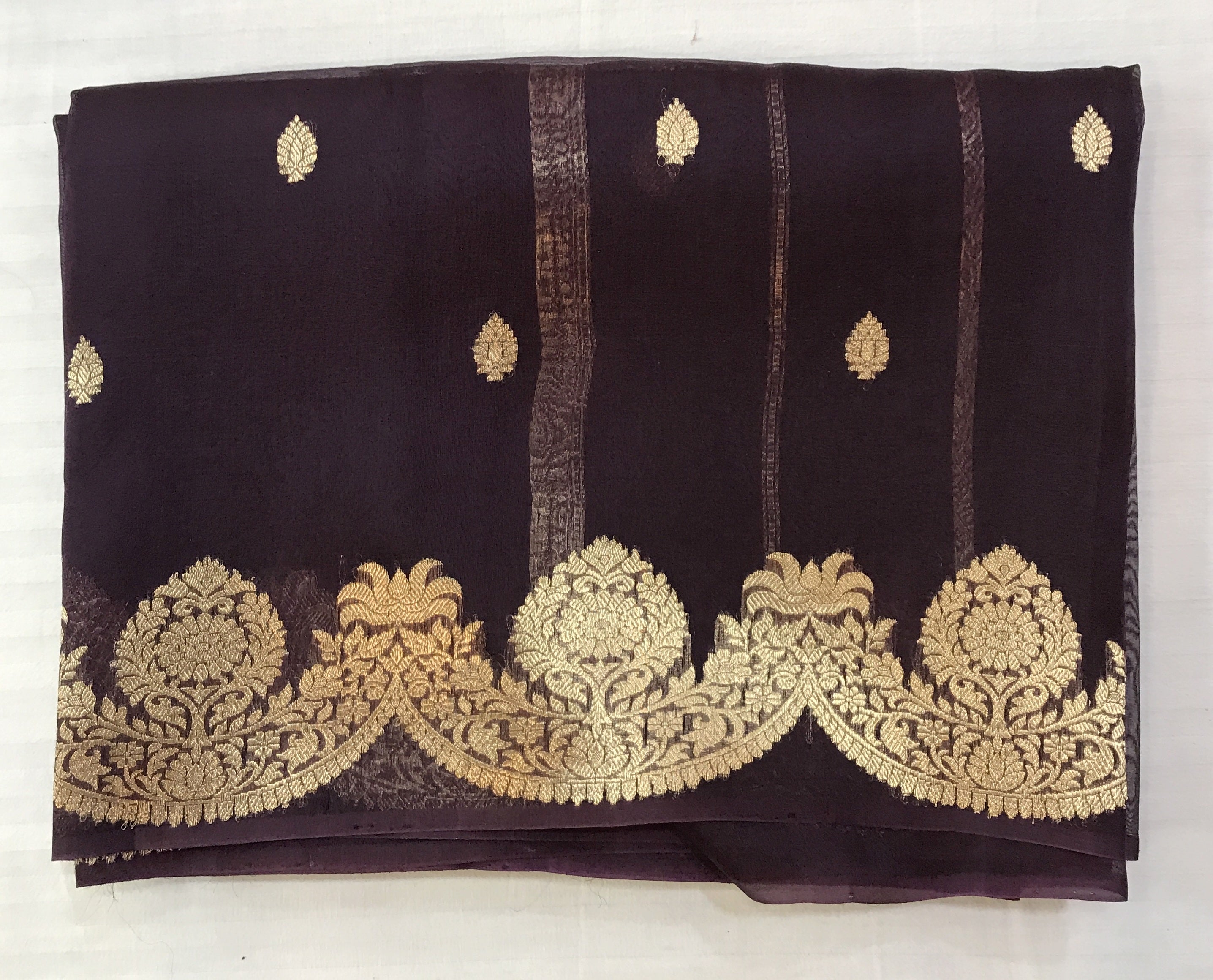 This brown Kora Banarasi saree exudes elegance with its exquisite golden zari work. The luxurious fabric. Adding to its charm, the saree is adorned with grand golden zari buttis, creating a regal appeal. The highlight of this masterpiece is its breathtaking pallu, embellished with an intricate design that enhances its timeless beauty. A richly woven zari border lends the saree a splendid wedding and festive allure, while the classic Banarasi golden hue on the border adds an element of sophistication.