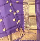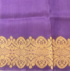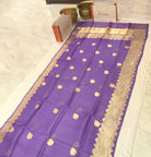 This lavender Kora Banarasi saree exudes elegance with its exquisite golden zari work. The luxurious fabric, akin to organza silk. Adding to its charm, the saree is adorned with grand golden zari buttis, creating a regal appeal. The highlight of this masterpiece is its breathtaking pallu, embellished with an intricate design that enhances its timeless beauty. A richly woven floral zari border lends the saree a splendid wedding and festive allure, while the classic Banarasi golden hue on the border adds an element of sophistication.