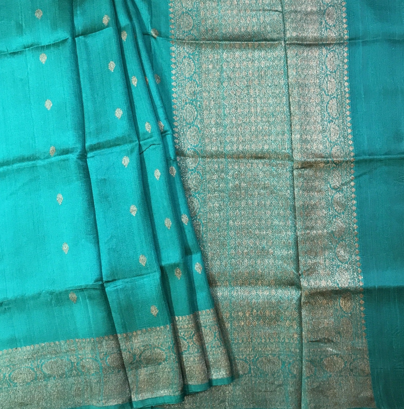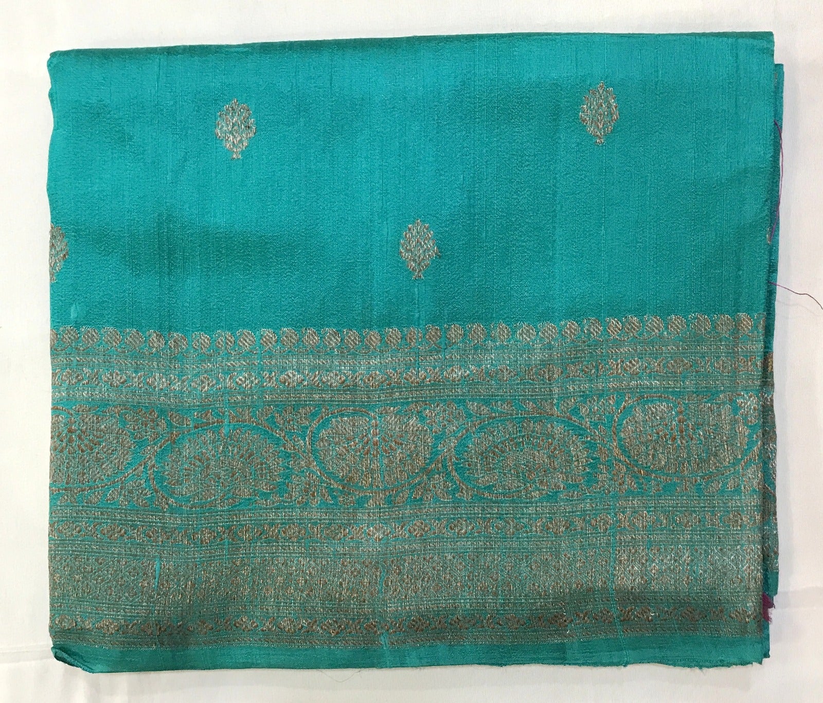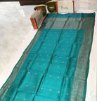 This Banarasi Tussar Silk saree, is a very new variety of Banarasi saree which is very unique and attractive. This fabric of saree is similar to tussar silk. A fresh soothing turquoise-green saree with self coloured border , this Banarasi saree is a treat to the eyes! The lovely leaf shaped motifs and the subtle design on the pallu add to the grace of this weave. Do not miss that, this saree has a very beautiful intricate design border which looks great! For those who are on the lookout for something different, this one is just for you!