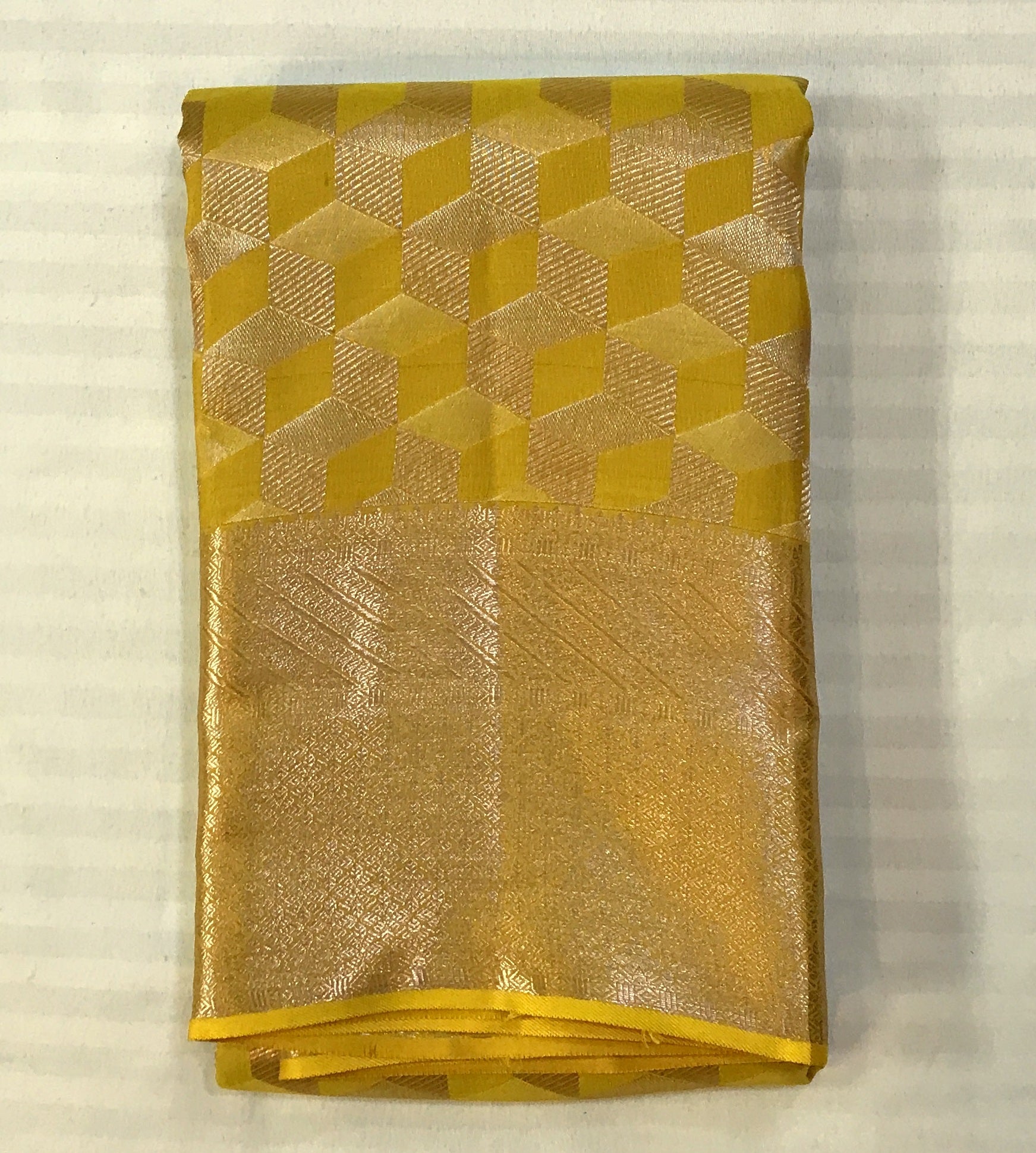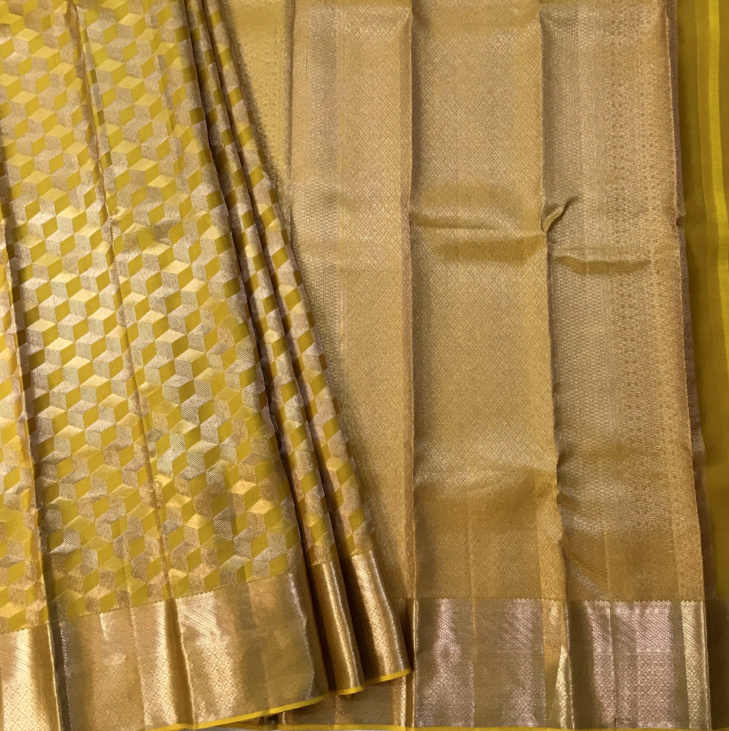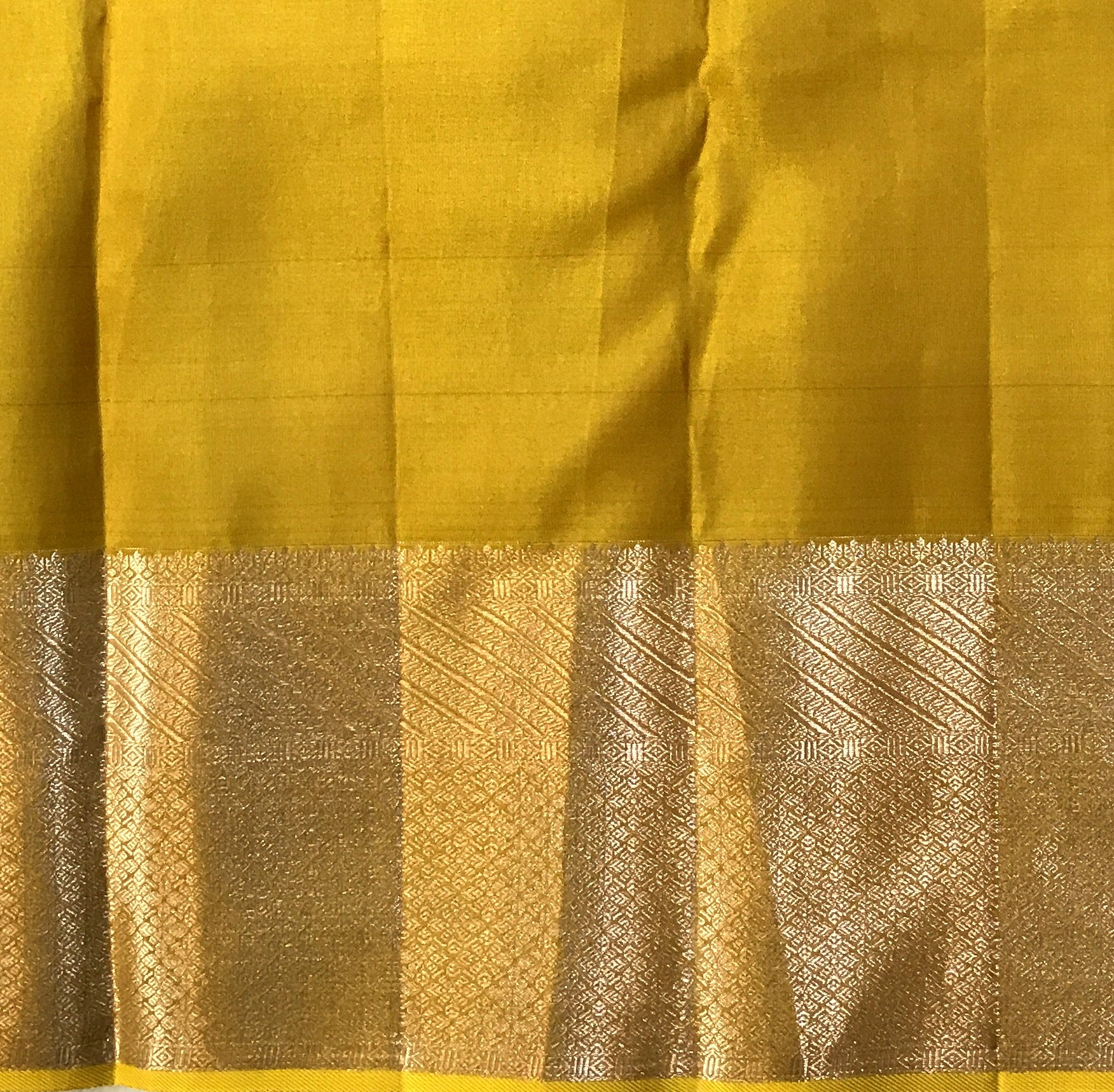 For those who adore yellow in all its glory, this exquisite Kanjeevaram saree is a perfect choice. Showcasing a captivating shade of mango-yellow it features an elegant golden zari brocade pattern woven with finesse, making it an extraordinary piece. The saree is accentuated by a self-colored border adorned with intricate zari work, seamlessly blending tradition and modernity. Paired with a matching blouse in the same wine and zari border, this saree boasts a luxurious finish and impeccable craftsmanship, ensuring it stands out as a true masterpiece.