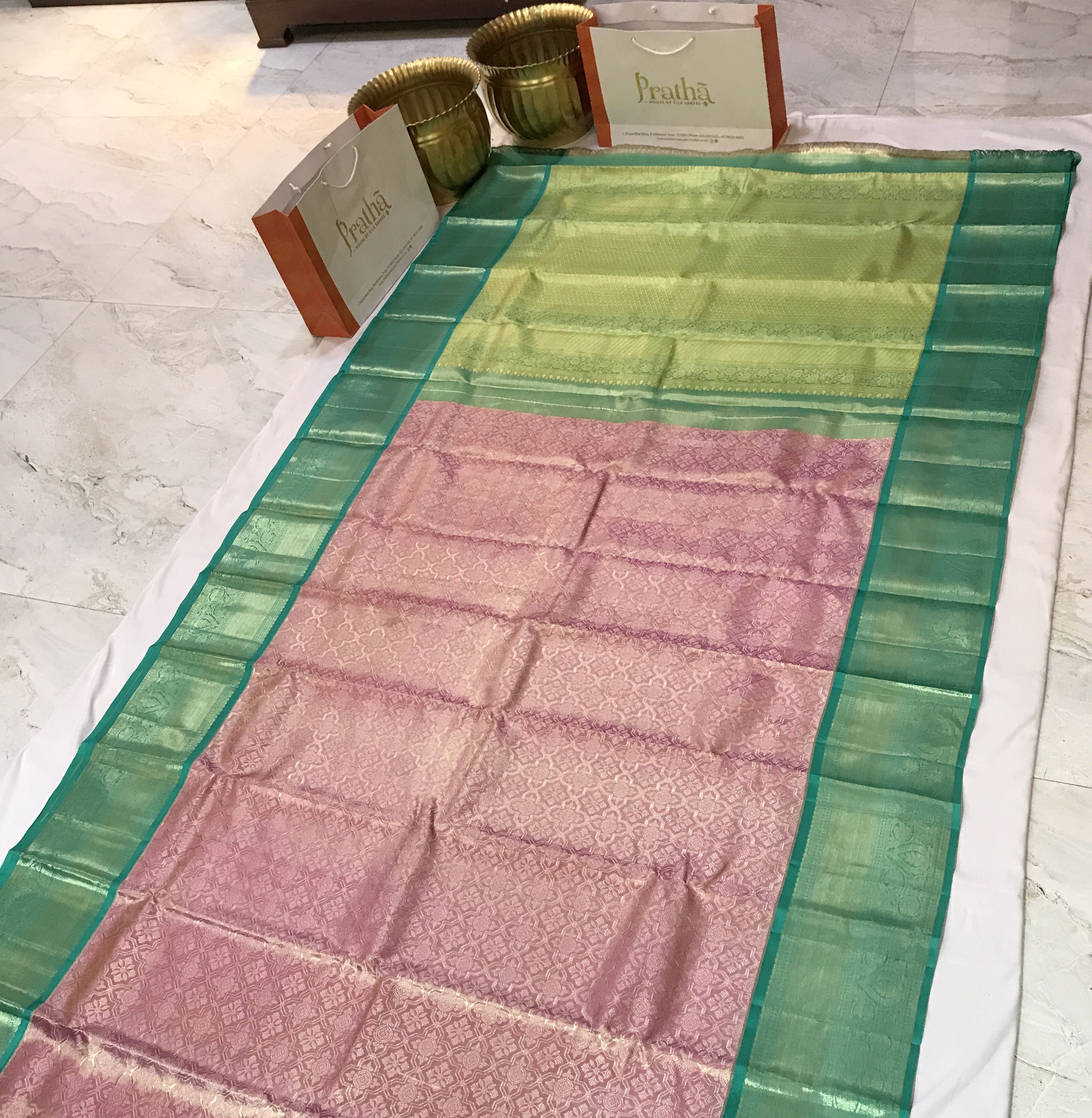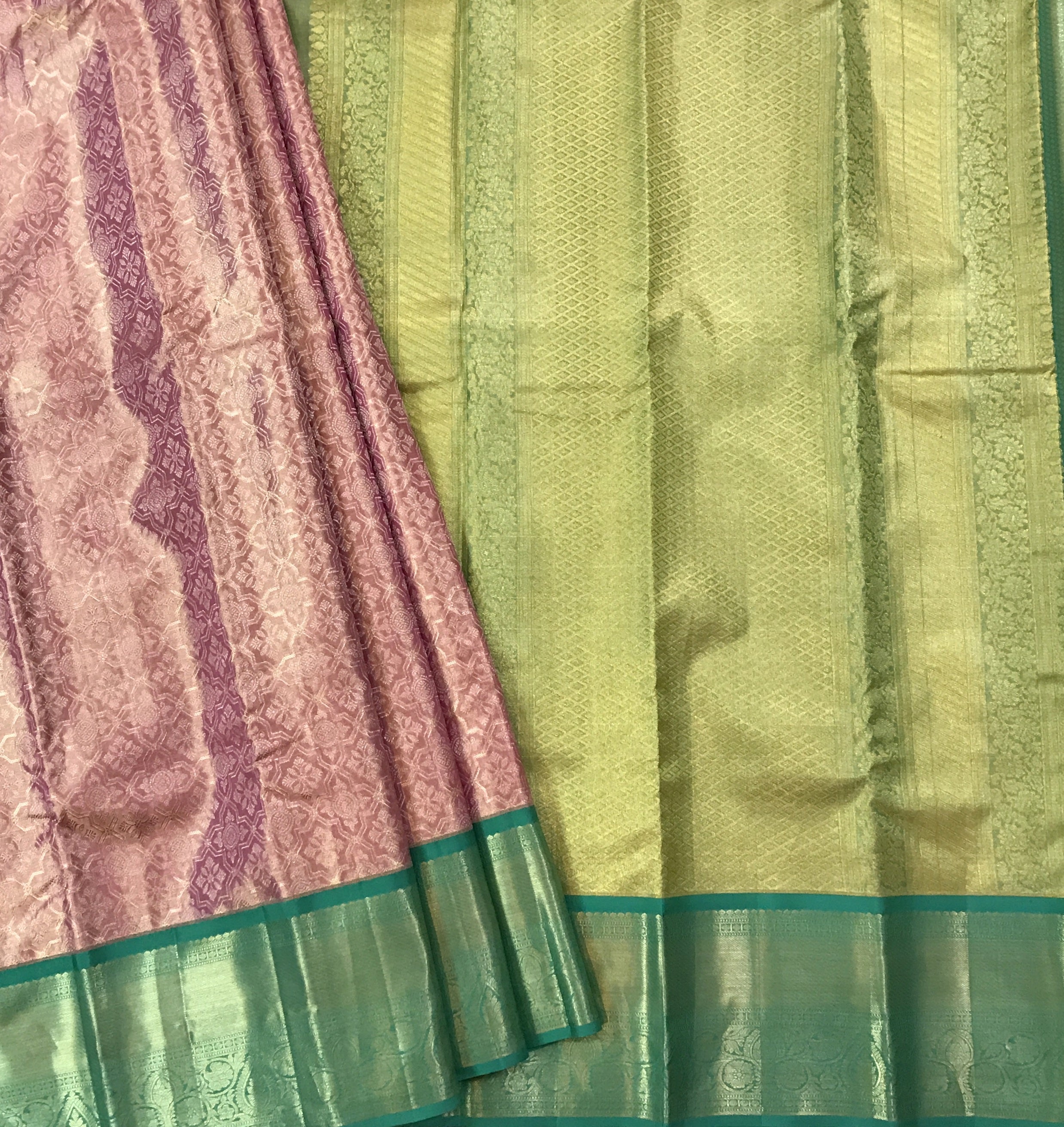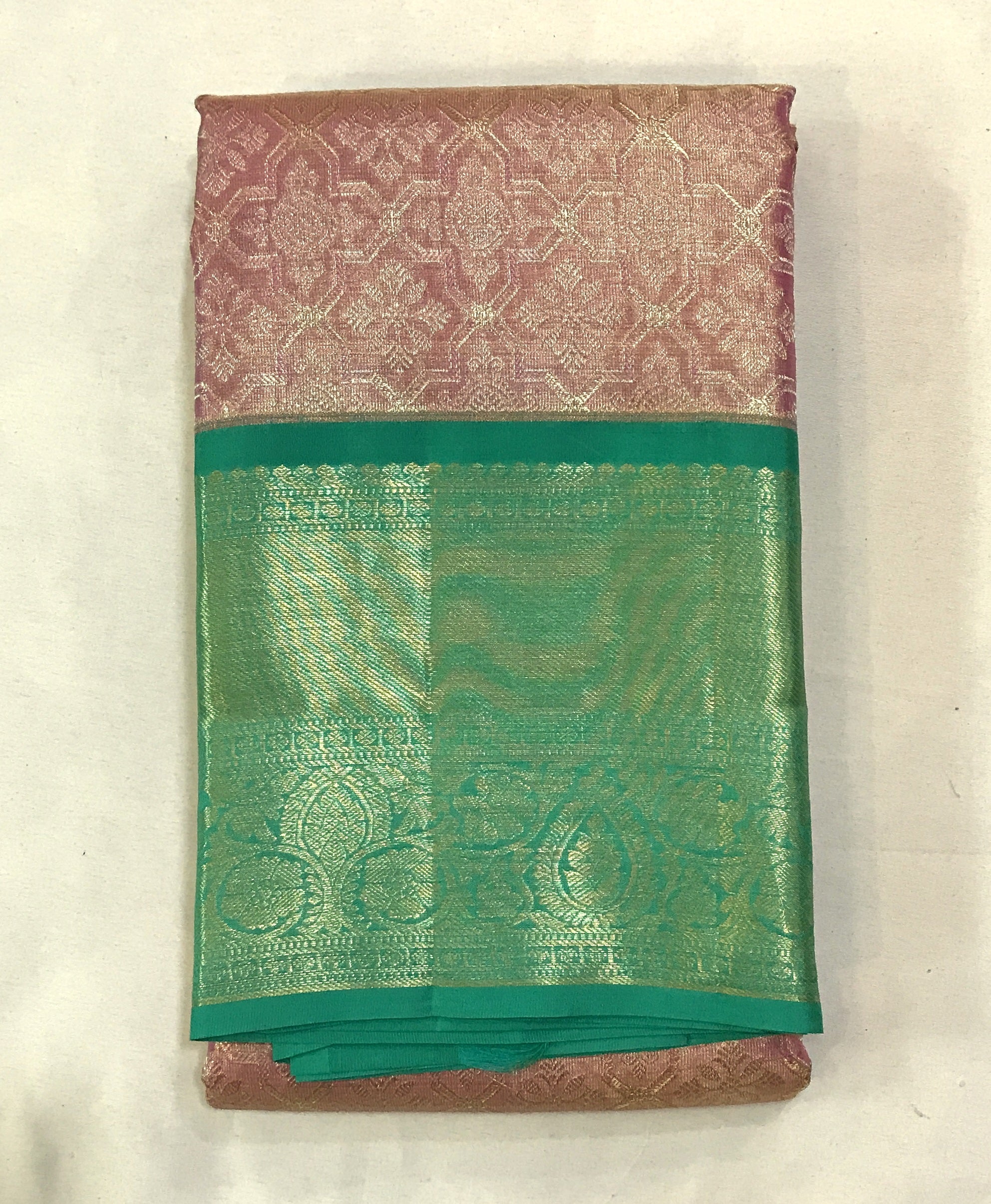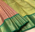 This is a lovely rose-pink Kanjeevaram with a intricately woven border. This combination looks incredible! This uniformly woven silver brocade Kanjeevaram that looks very elegant. Do not forget to check out the intricate design in the border along with the self coloured zari pallu make this one perfect of be worn in weddings or other festive occasions! The silver zari of the brocade weaving makes this saree look great! They give a beautiful festive vibe to this Kanjeevaram.