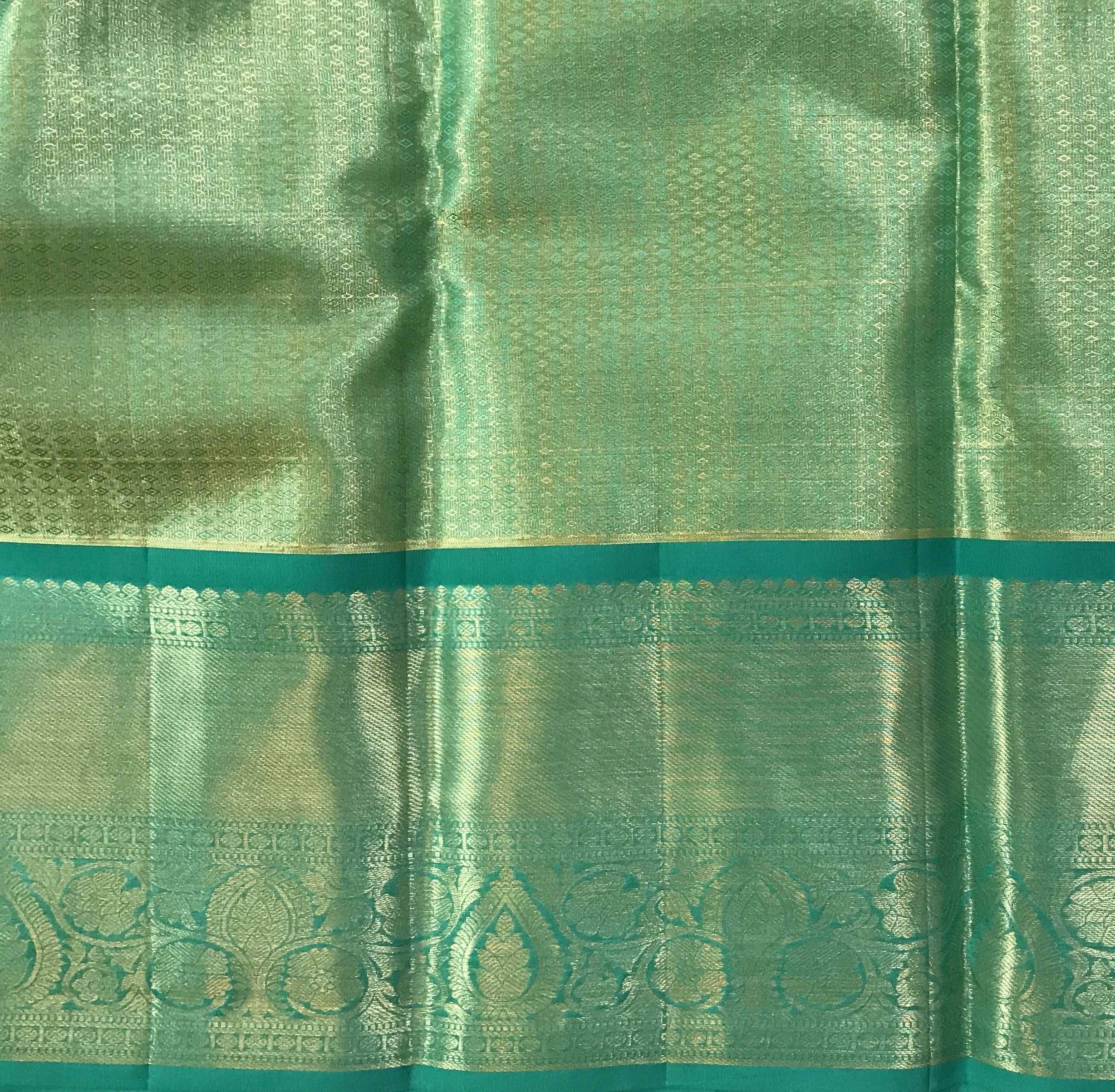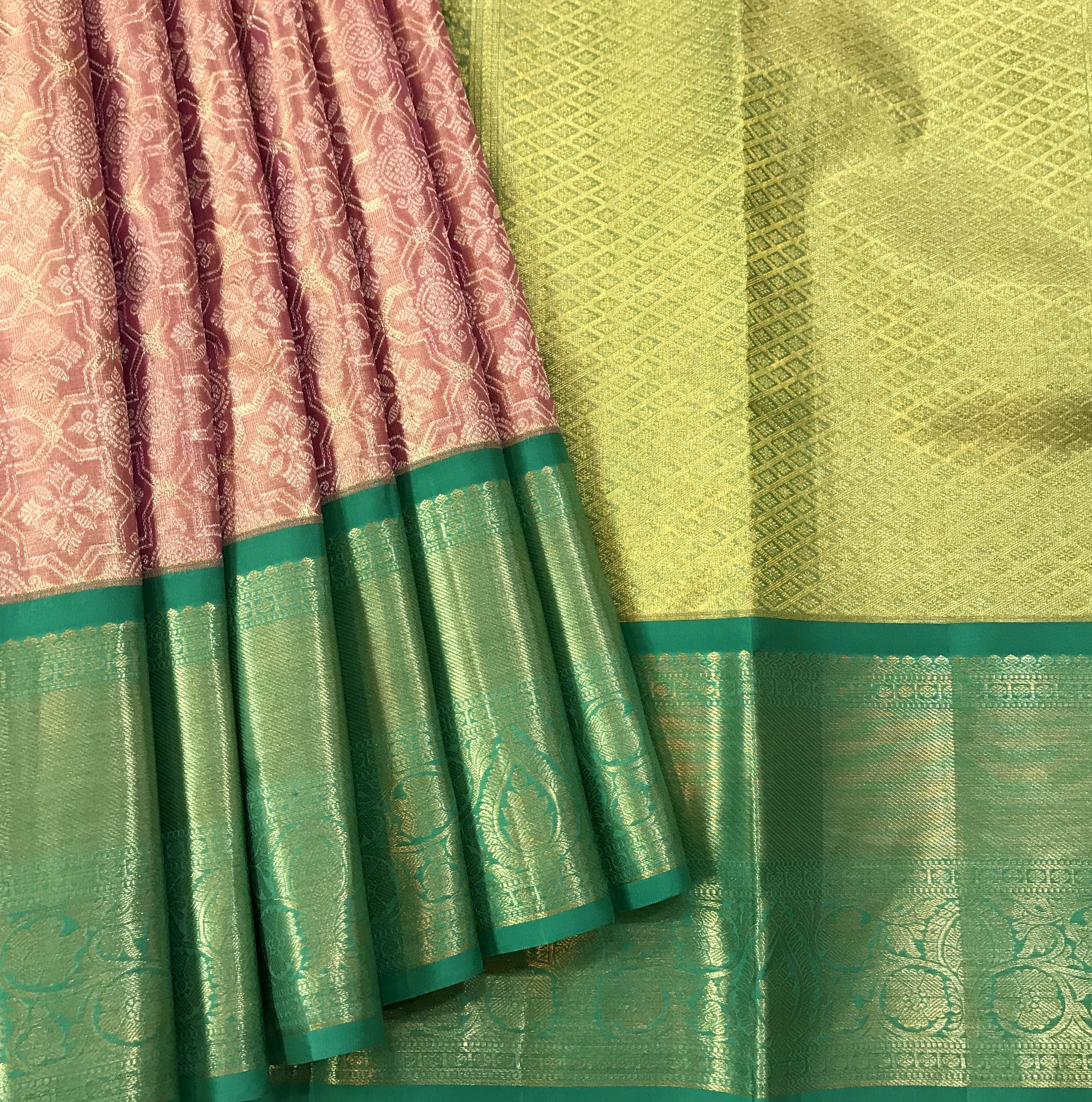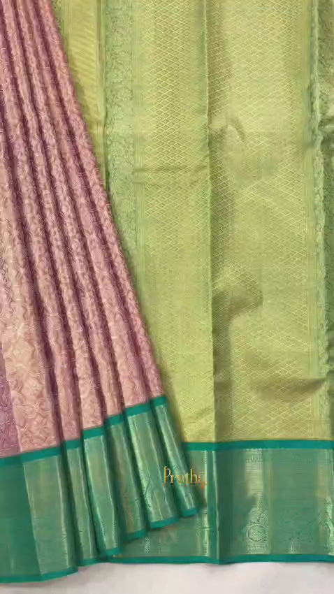 This is a lovely rose-pink Kanjeevaram with a intricately woven border. This combination looks incredible! This uniformly woven silver brocade Kanjeevaram that looks very elegant. Do not forget to check out the intricate design in the border along with the self coloured zari pallu make this one perfect of be worn in weddings or other festive occasions! The silver zari of the brocade weaving makes this saree look great! They give a beautiful festive vibe to this Kanjeevaram.
