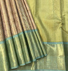 This is a lovely peach Kanjeevaram with an intricately woven border. This combination looks incredible! This uniformly woven silver-golden brocade Kanjeevaram that looks very elegant. Do not forget to check out the intricate design in the border along with the green coloured zari pallu make this one perfect of be worn in weddings or other festive occasions! The silver zari of the brocade weaving makes this saree look great! They give a beautiful festive vibe to this Kanjeevaram.