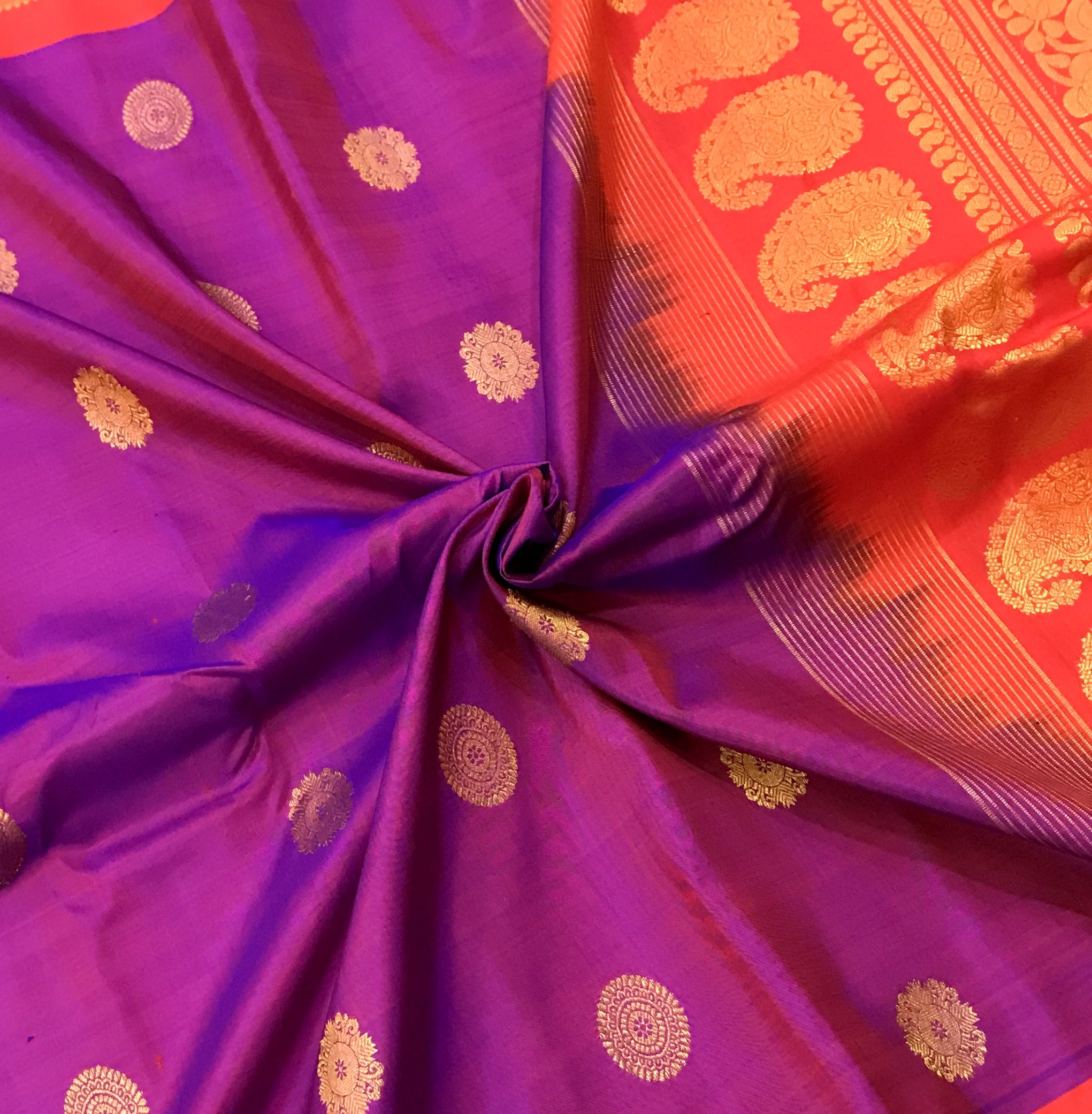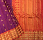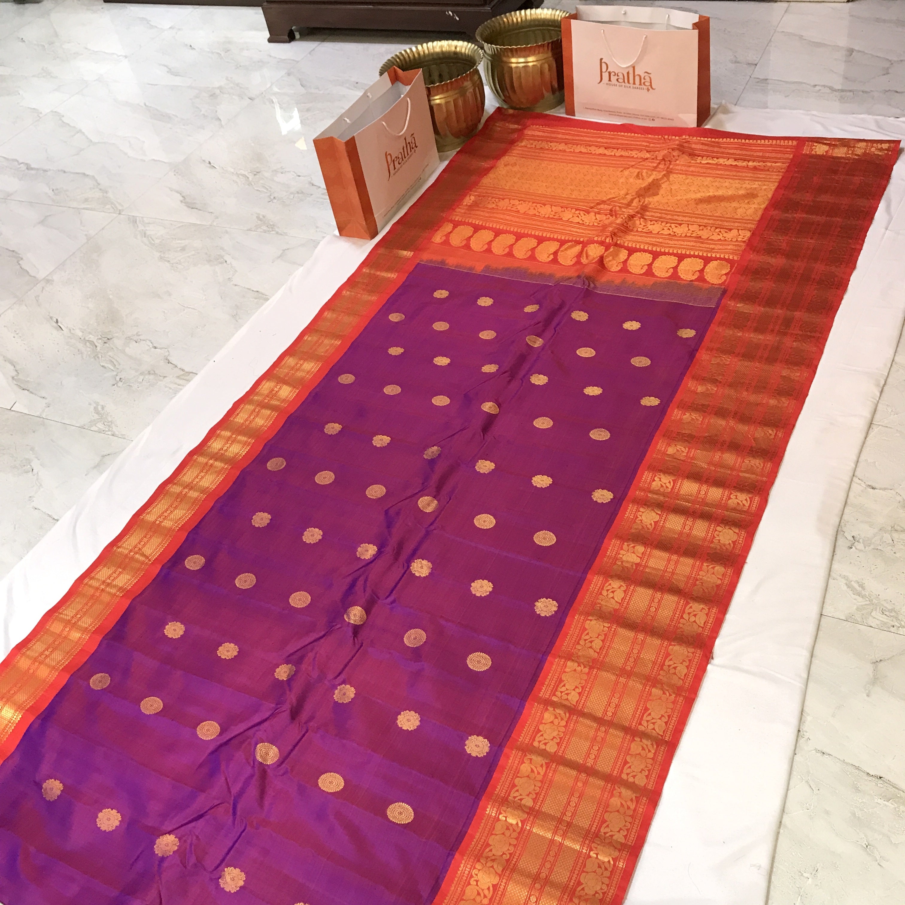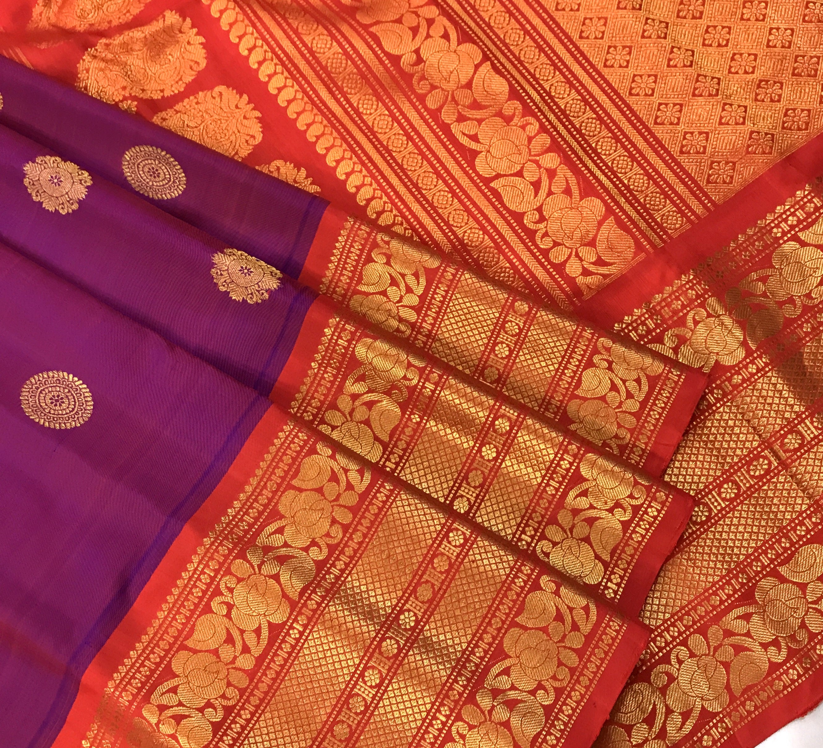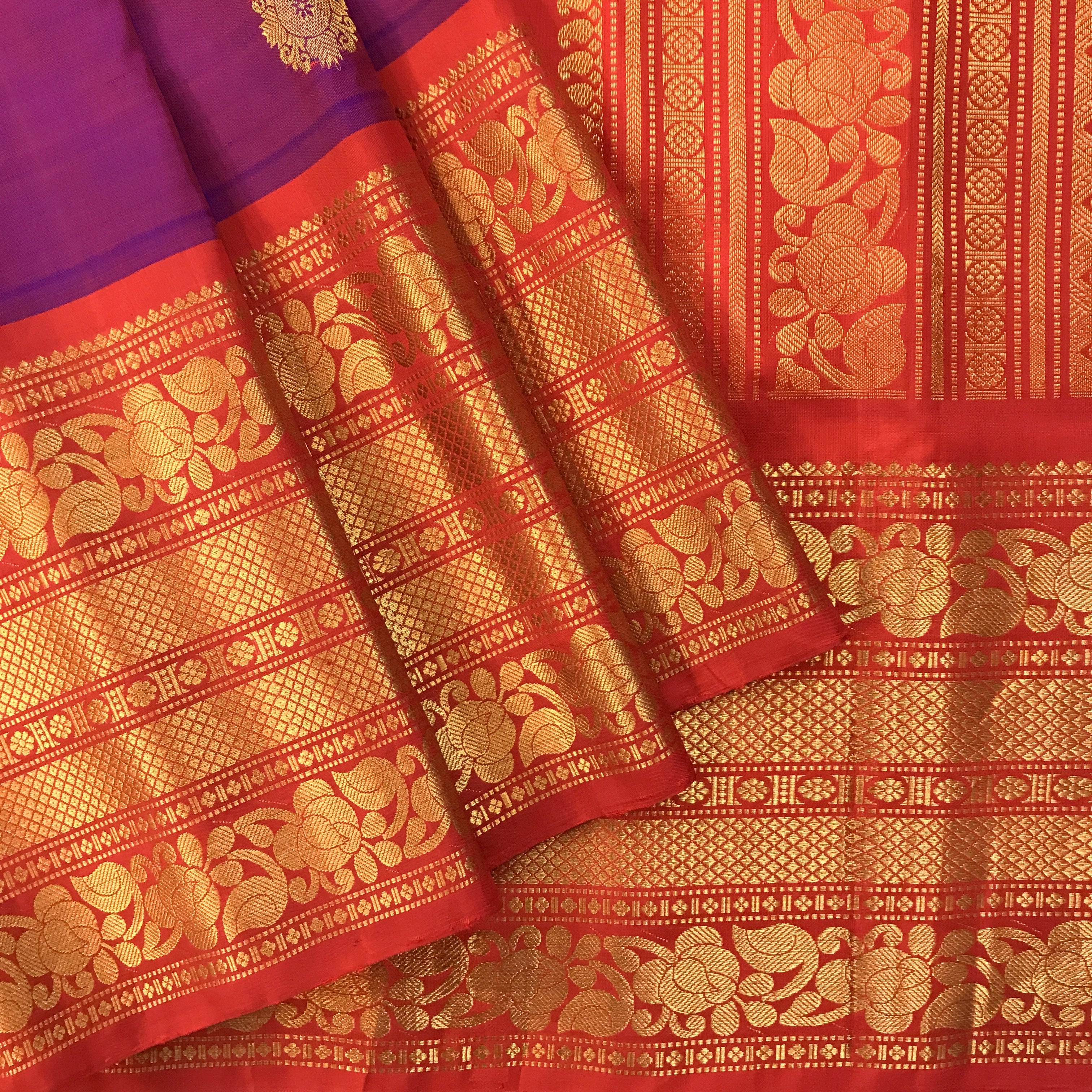 The soothing shade of Magenta and red combination wins hearts across traditions and cultures! This beautiful Gadhwal, the 'floral' design intricate butti woven in zari ,the red golden zari border with an elaborate temple design make this weave a charmer! The intricately woven pallu adds to the beauty of this saree!