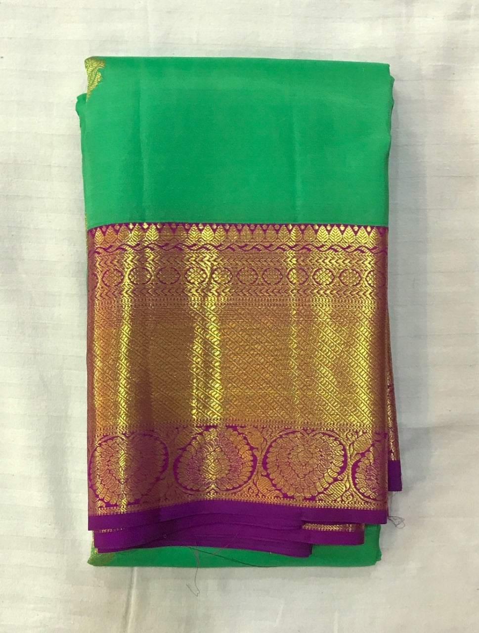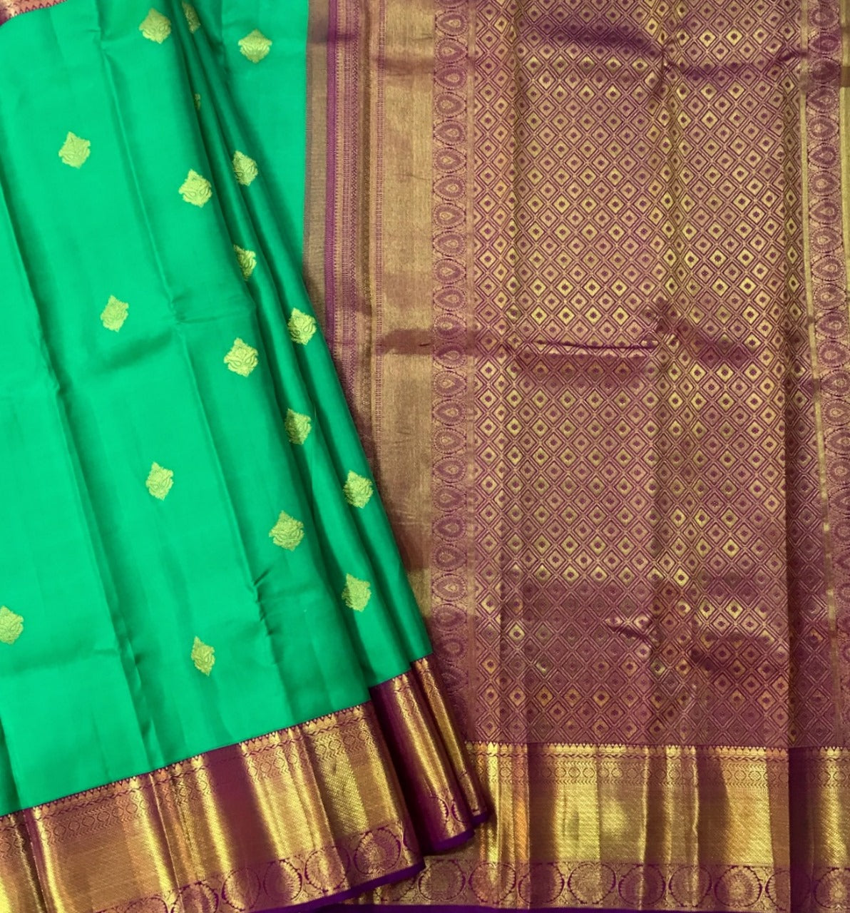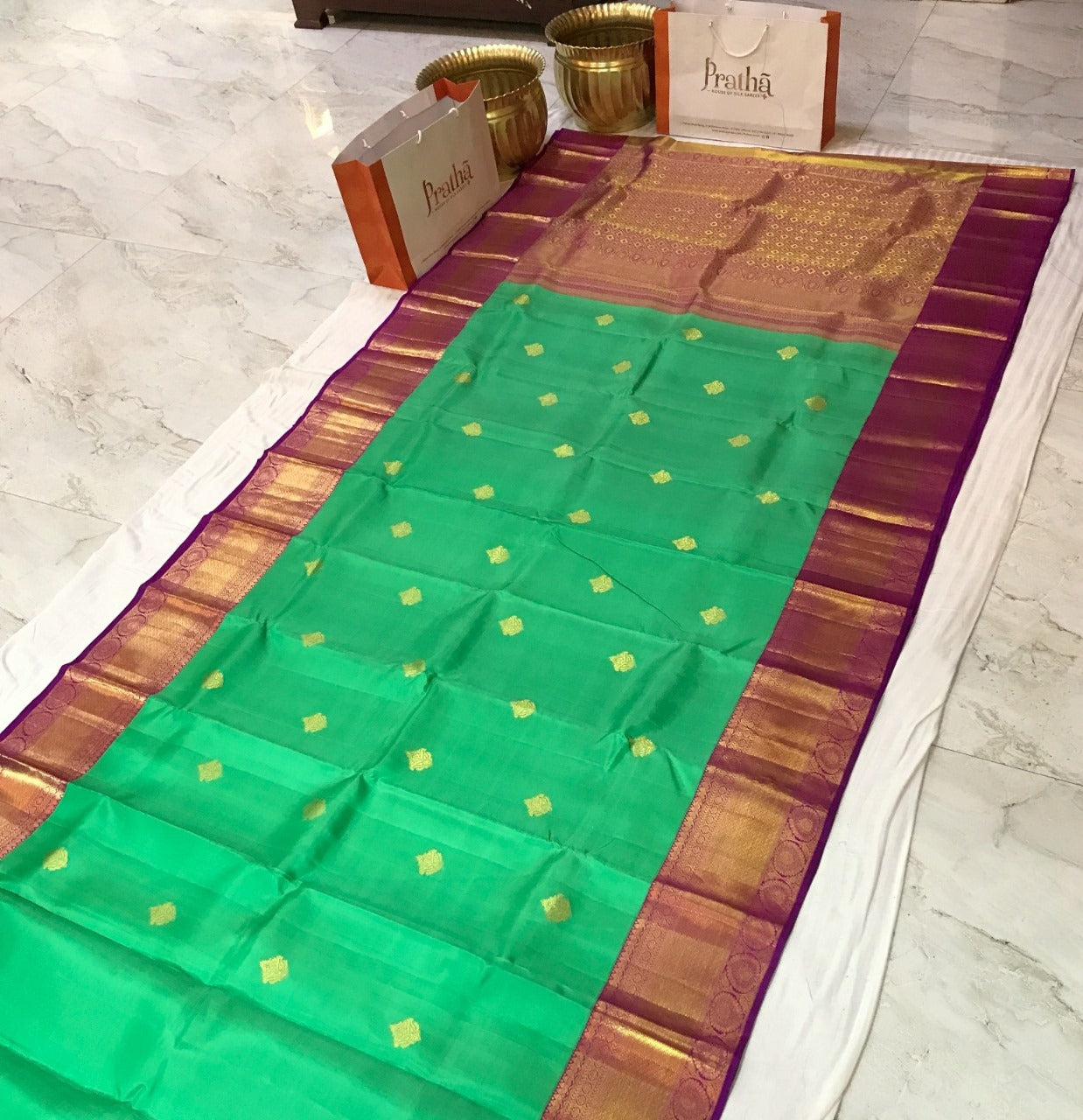 This unique shade of green pure silk handwoven Kanjeevaram, this one is perfectly traditional. The delicate butti designs, golden zari border and richly woven Pallu make this weave a classic! Thanks to its beautiful colour with the combination of gold, this Kanjeevaram will look great in the day as well as at night! Do not miss that, this saree has a very beautiful golden zari border looks outstanding when we wear.