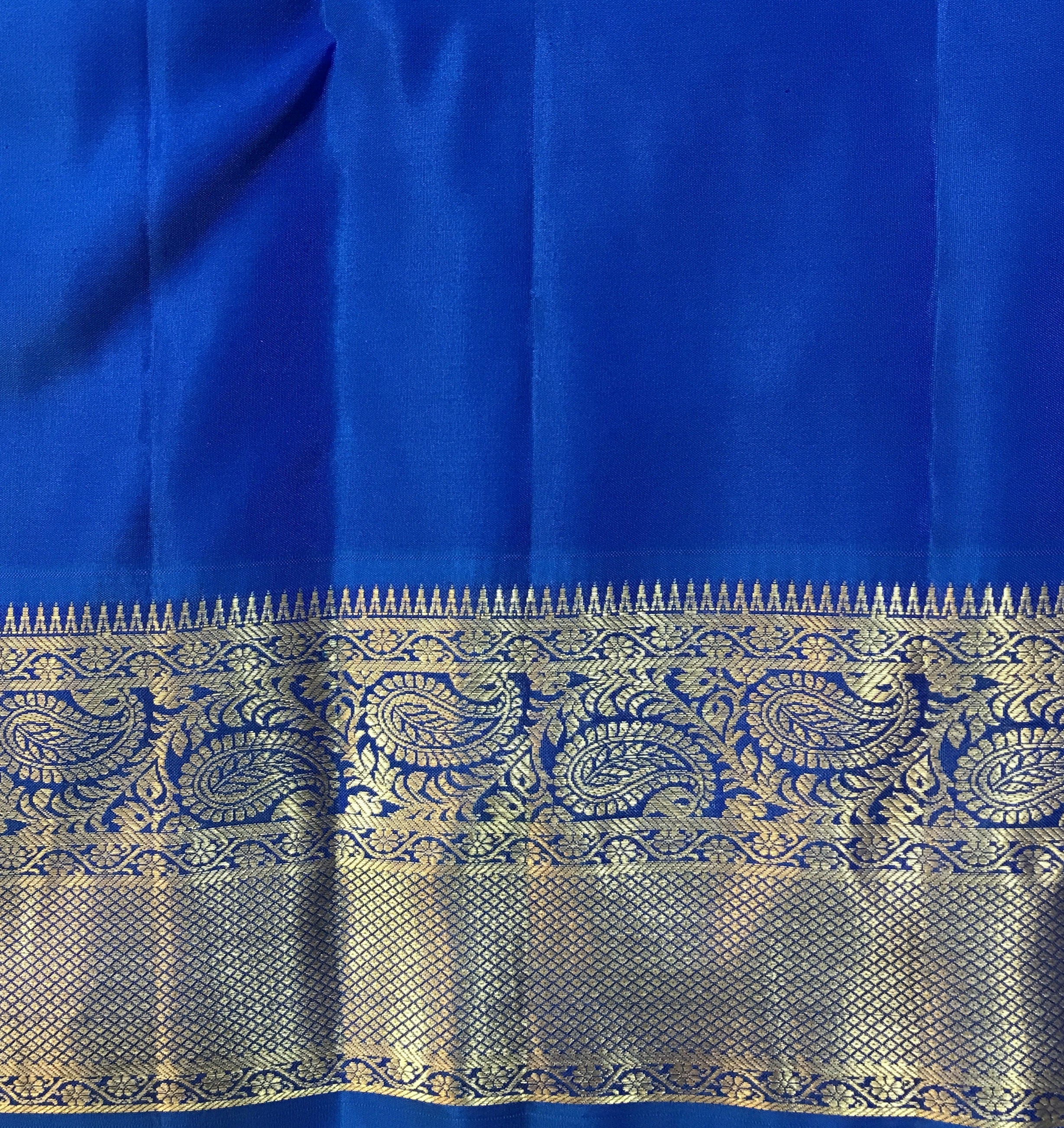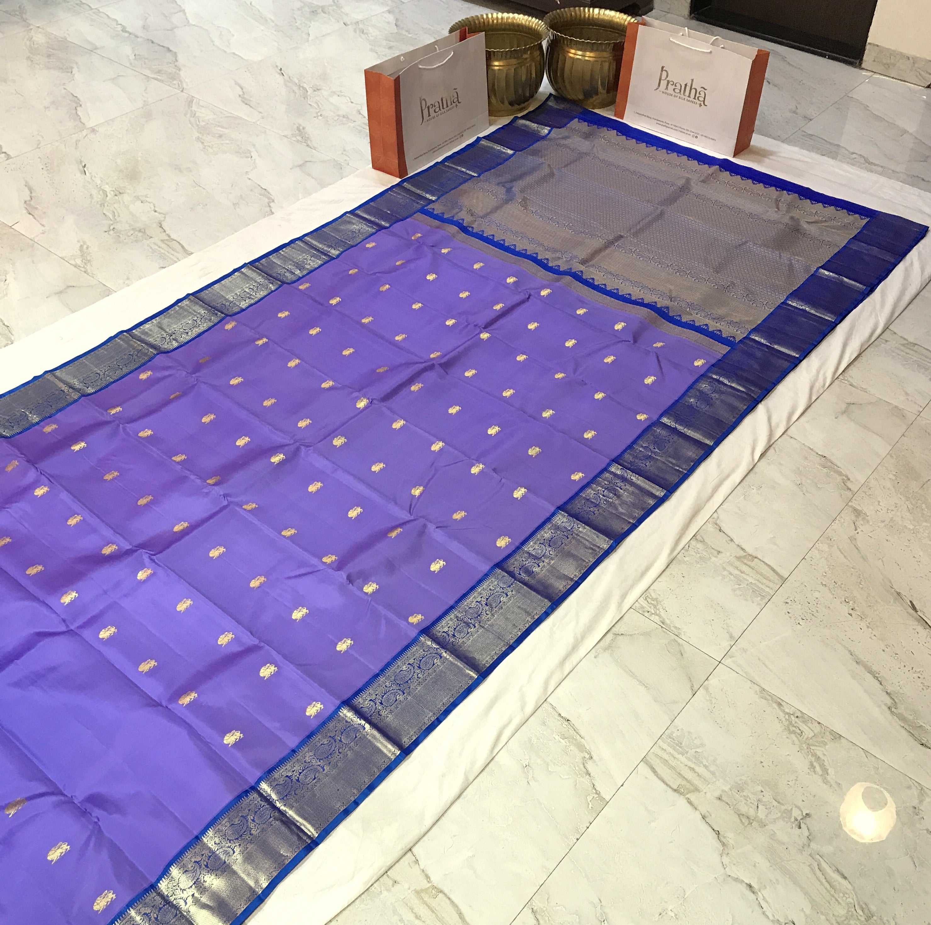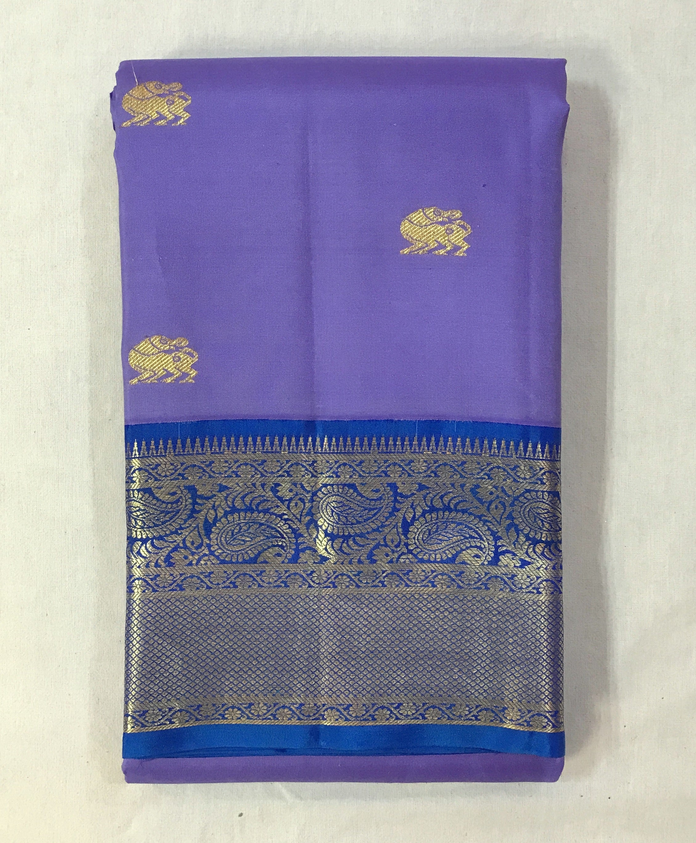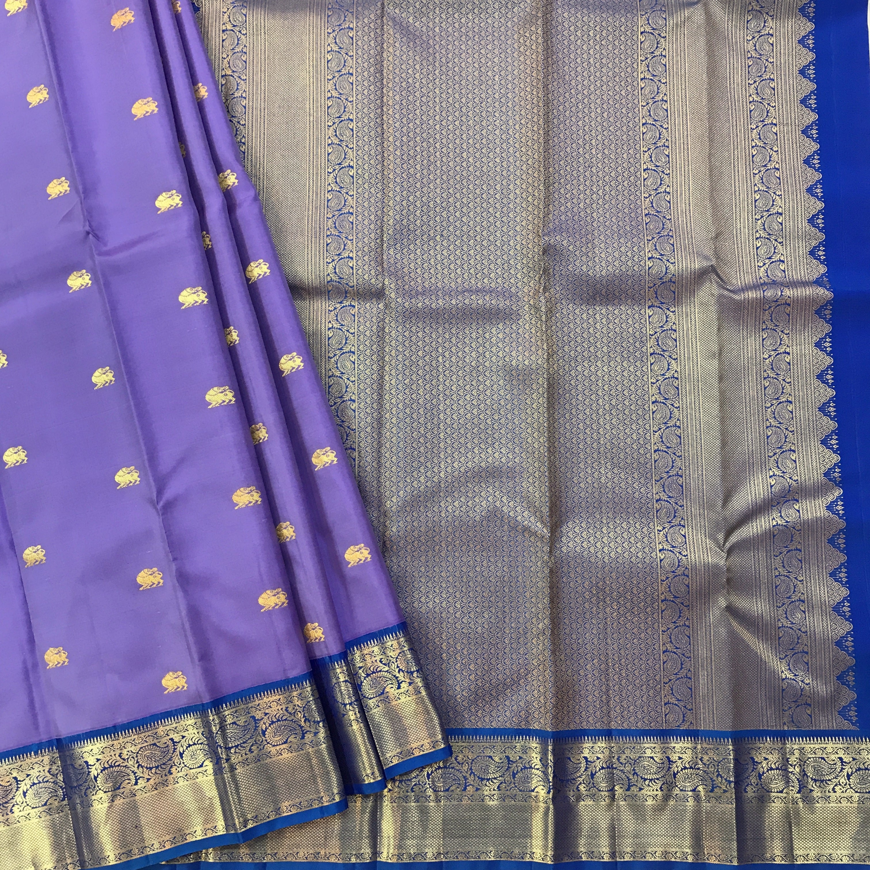 This unique combination of lavender and blue pure silk handwoven Kanjeevaram, this one is perfectly traditional. The delicate butti designs, golden zari border and richly woven Pallu make this weave a classic! Thanks to its beautiful colour with the combination of gold, this Kanjeevaram will look great in the day as well as at night! Do not miss that, this saree has a very beautiful golden zari border looks outstanding when we wear.