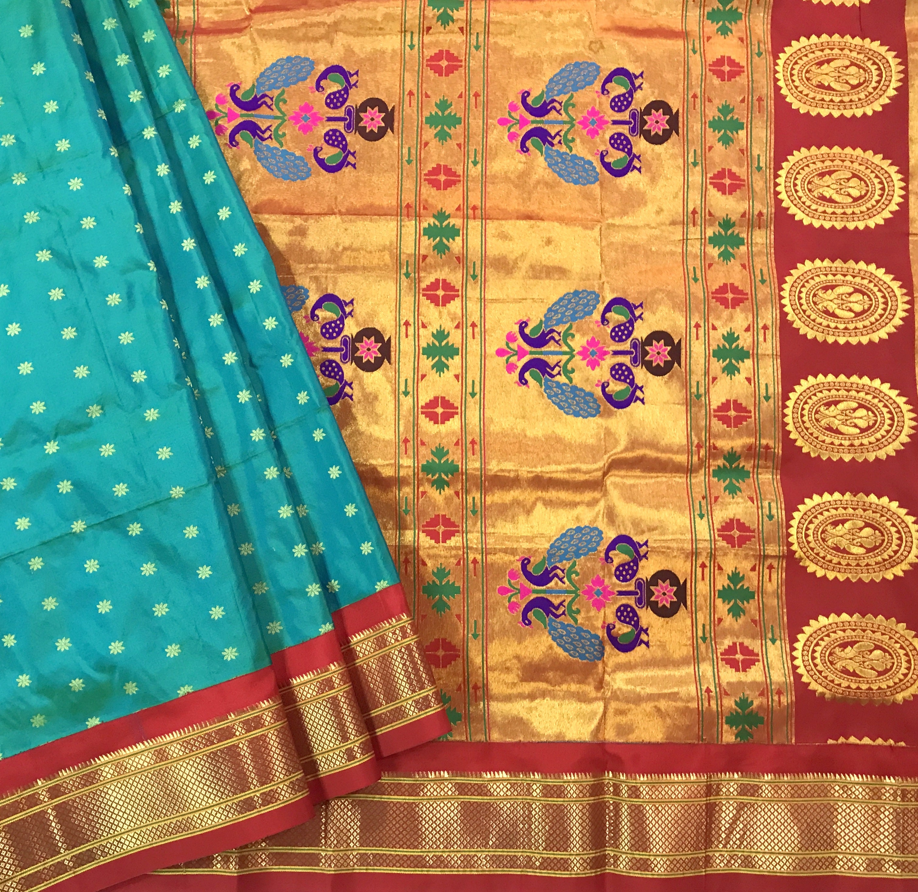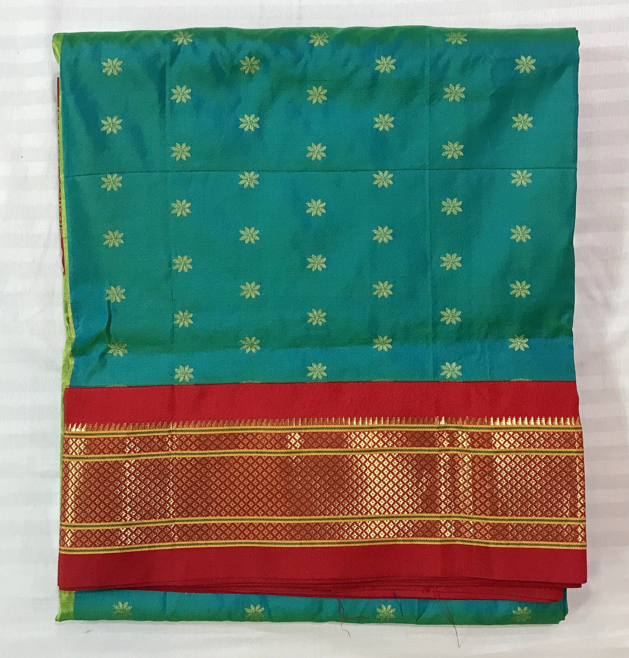 This is one of the most unique colour combination one can see in a power loom Paithani saree. A very beautiful shade of rama green which looks great when teamed up with a golden zari border and pallu. The classic flower shaped butti and the authentic tissue based pallu give this Paithani a festive touch! If you are a person for unique colour combinations, this one should be your pick!