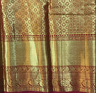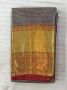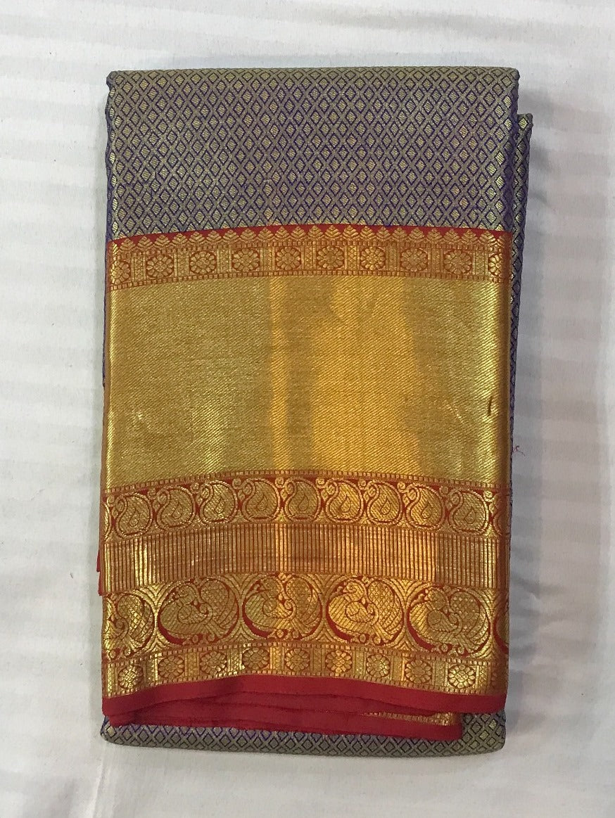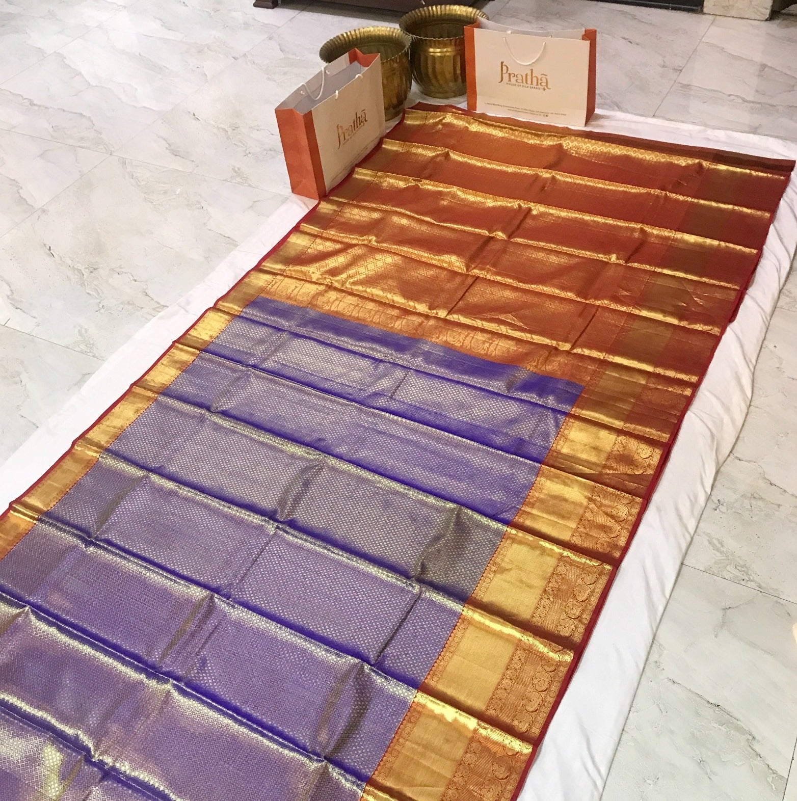 This saree truly embodies elegance and splendor! With its rich shade of purplish-blue, intricate brocade patterns, and the exquisite red golden zari adorning the border, it’s a masterpiece meant to be treasured across generations. The golden zari pallu adds a vibrant touch, enhancing its timeless appeal. This pure zari Kanjeevaram is undoubtedly a jewel in Pratha's collection.