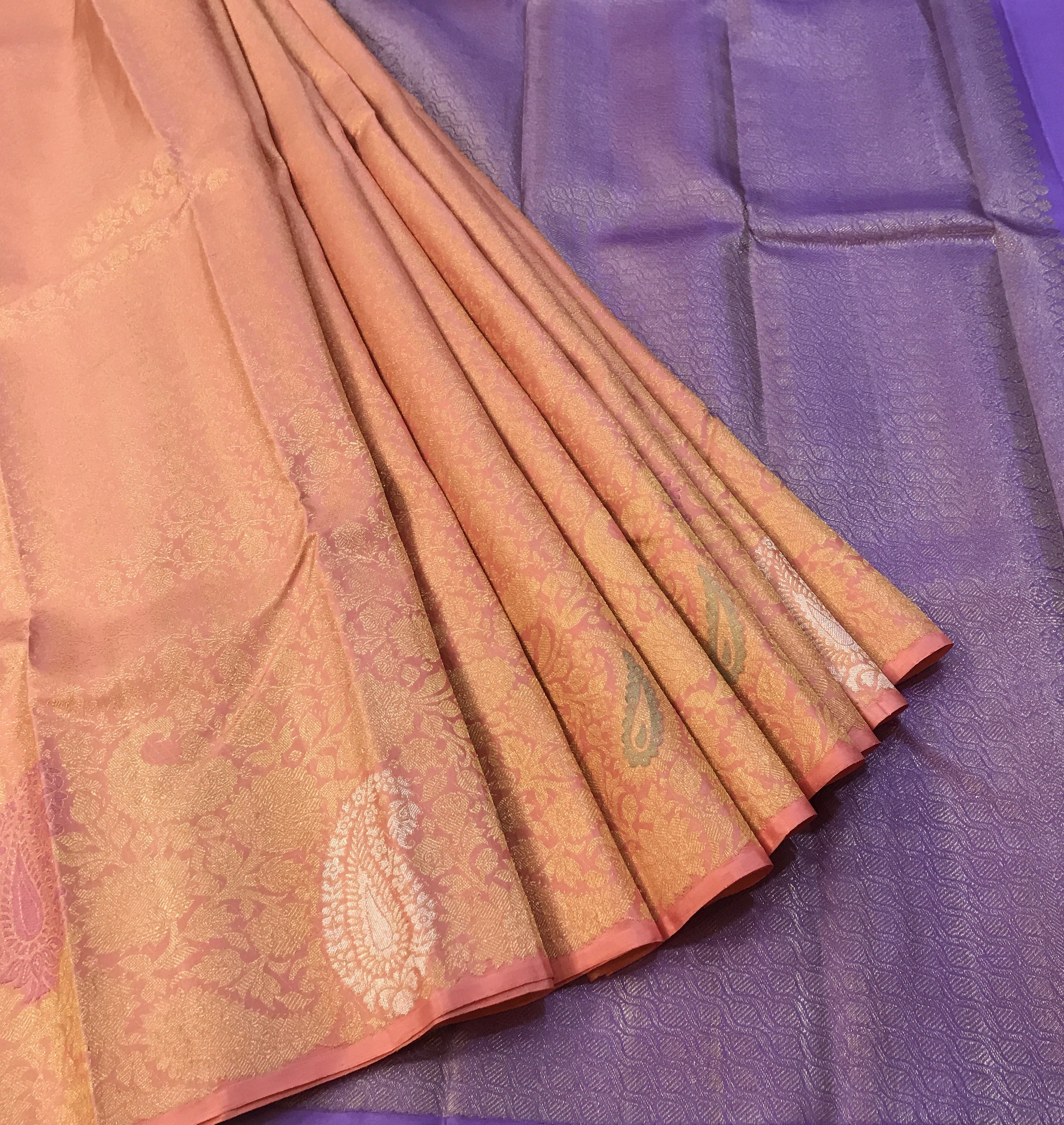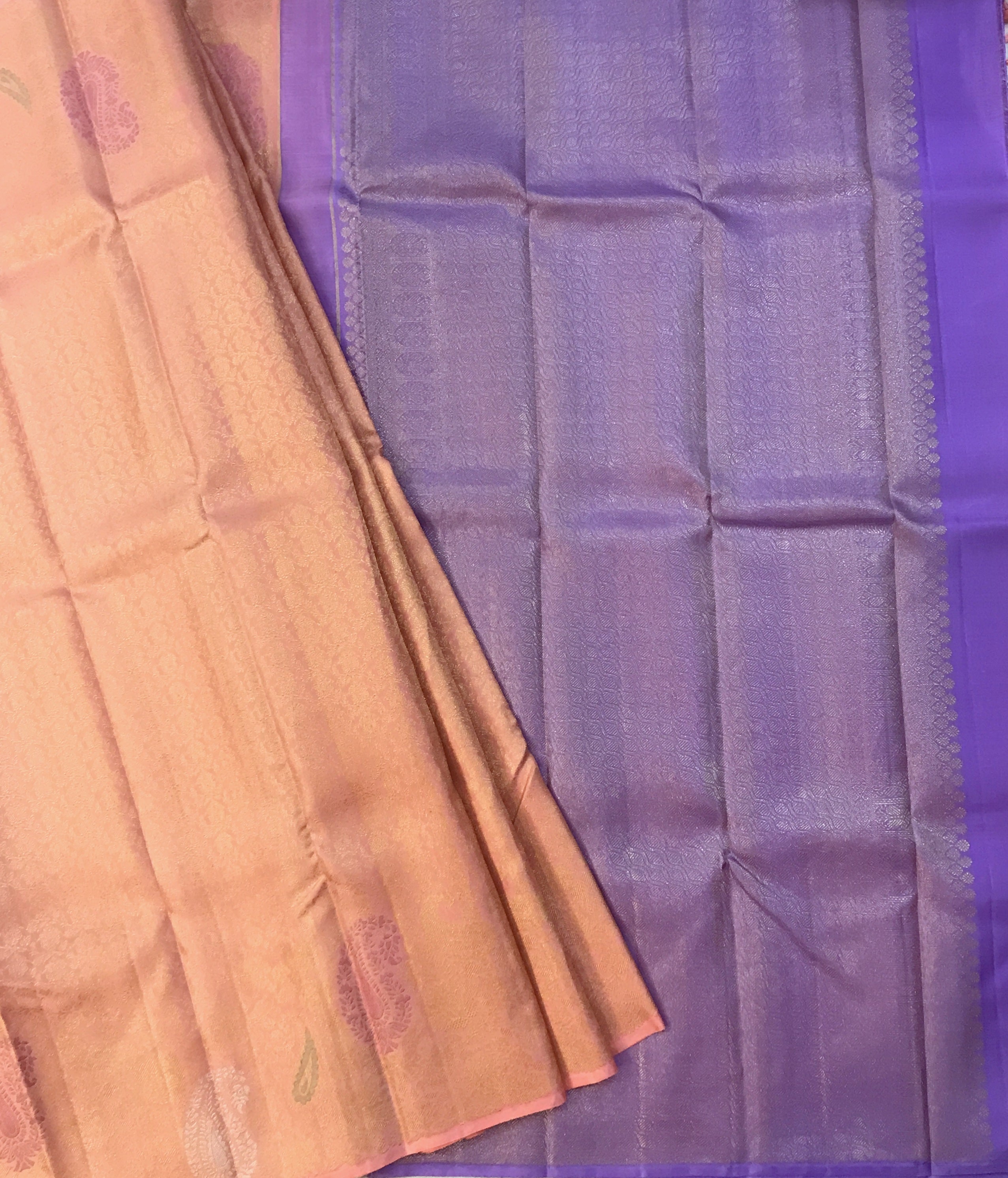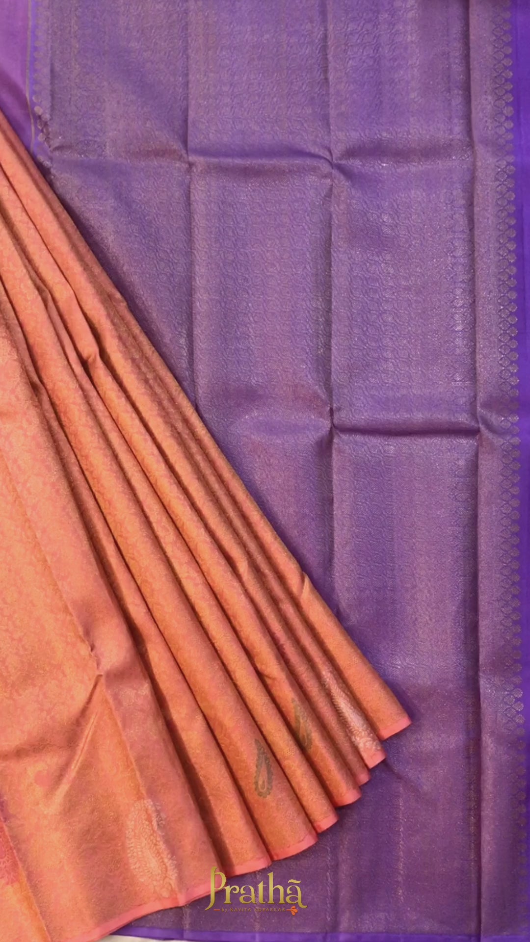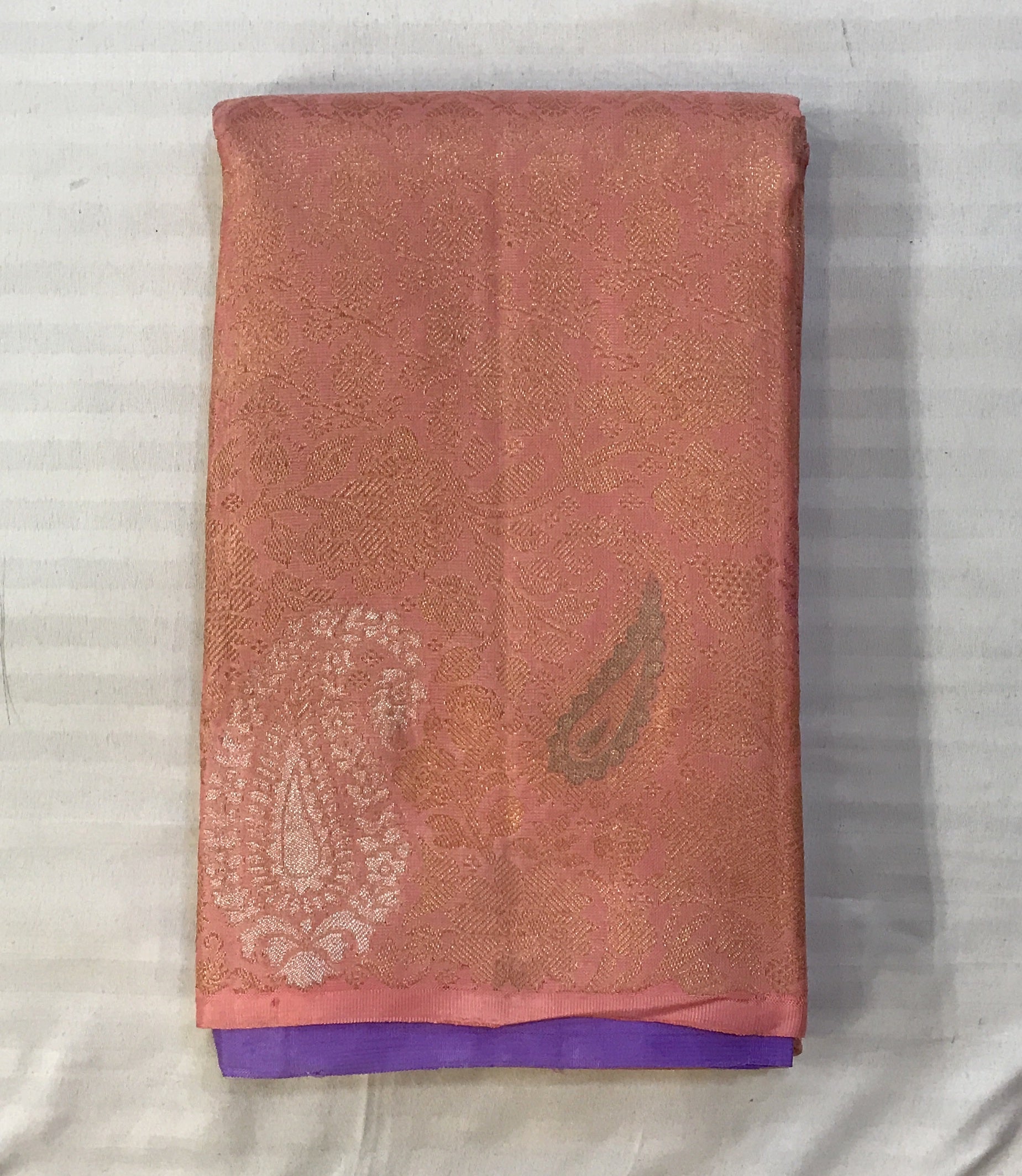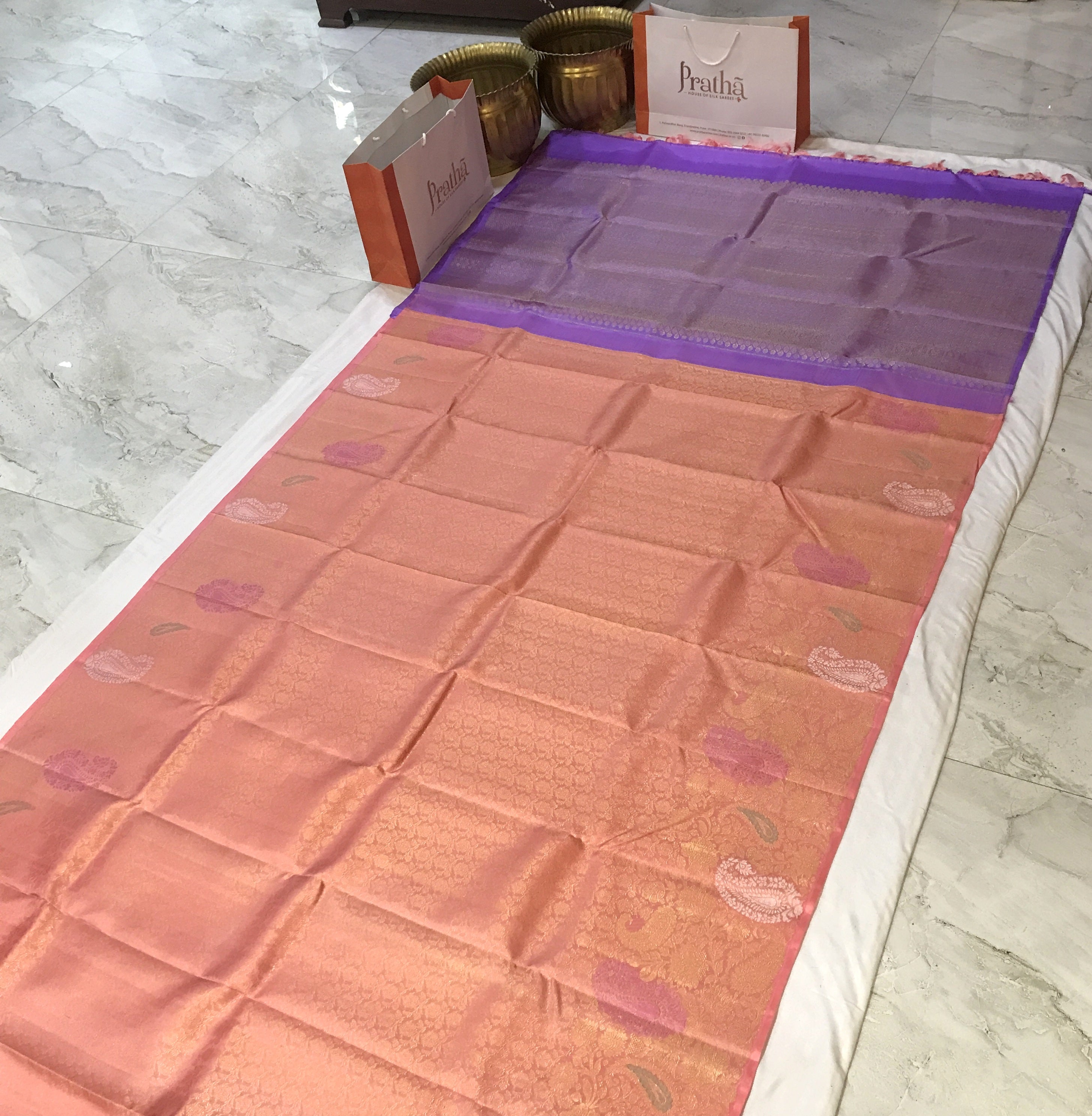 A Signature Collection saree crafted in a soft blush pink, enriched with intricate gold zari floral and paisley motifs. The brocade design all over and gentle sheen lend it a luxurious yet graceful presence, making it a timeless statement for weddings, festivities, and cherished occasions.