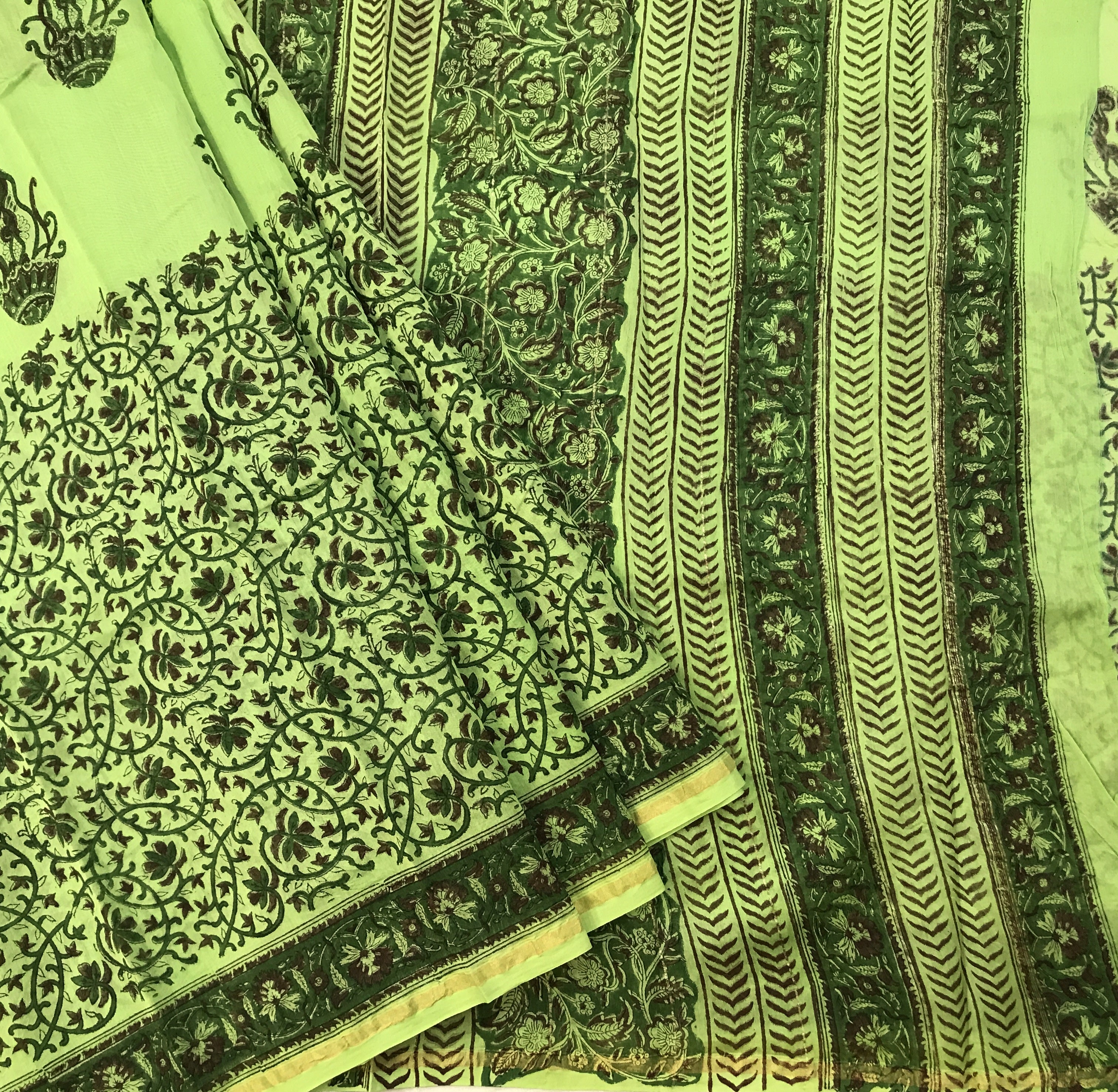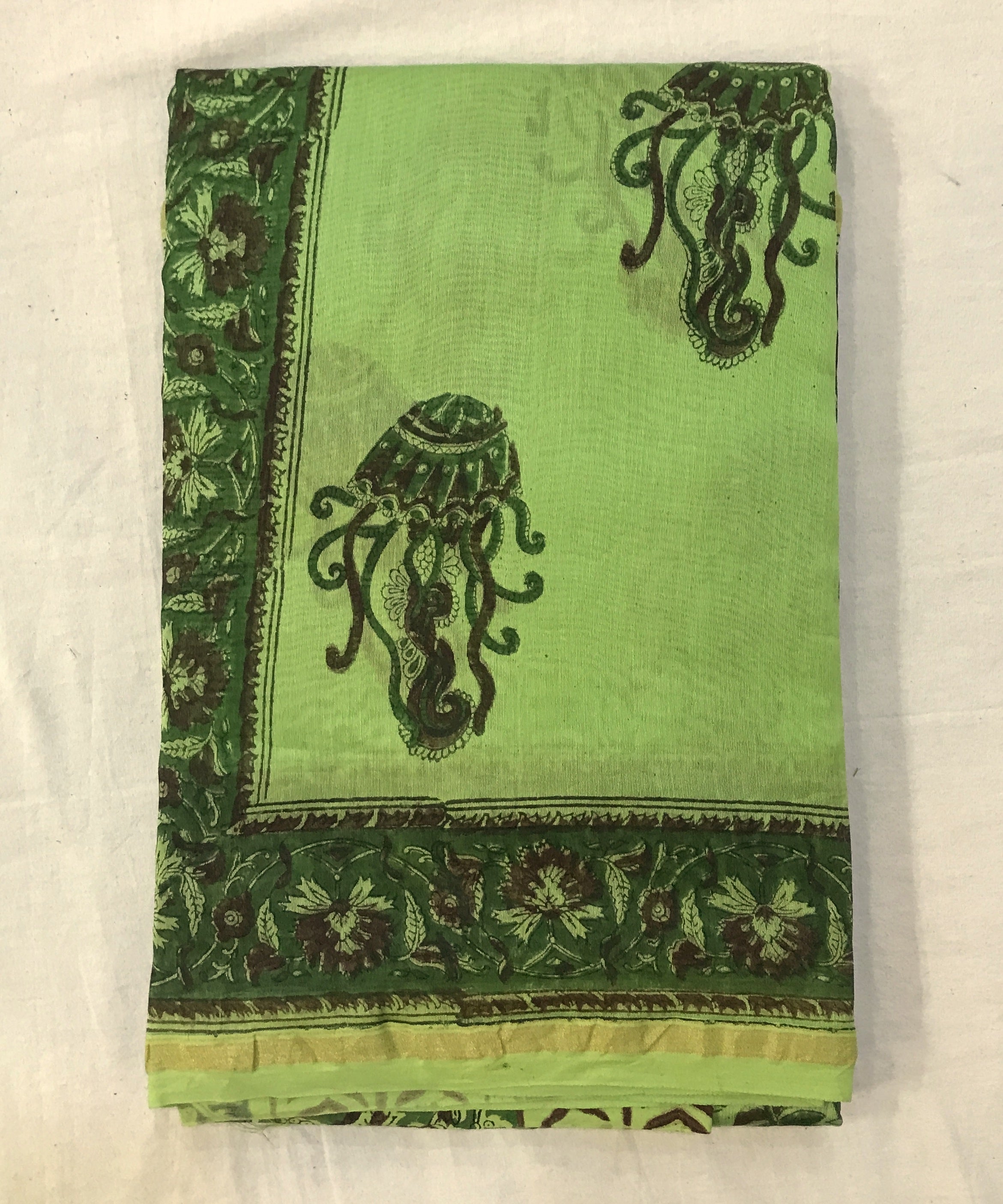 A very beautiful lemon green Chanderi Cotton saree with butti design and broad design border, is lightweight fabric that makes it apt from summer. It is also available in bright colors and has a slight sheen to it which makes it wearable for parities as well. Some beautiful and elegant designs, perfect breezy sarees for Summers! These trendy weaves are a perfect catch for hassle free looks.