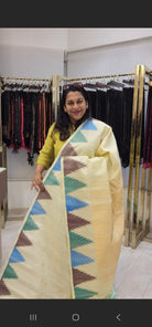This is an elegant Gadwal saree featuring a soft butter-yellow body with subtle woven buttas, beautifully complemented by a geometric border in shades of teal, olive, and brown. Accented with fine gold zari detailing and a matching pale yellow pallu, the saree blends traditional craftsmanship with understated sophistication, making it perfect for festive and daytime celebrations.