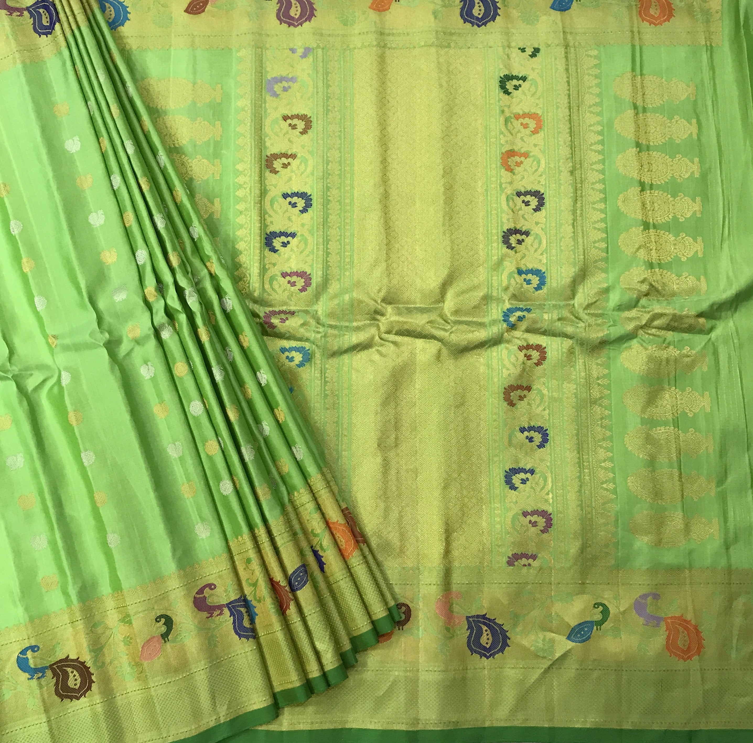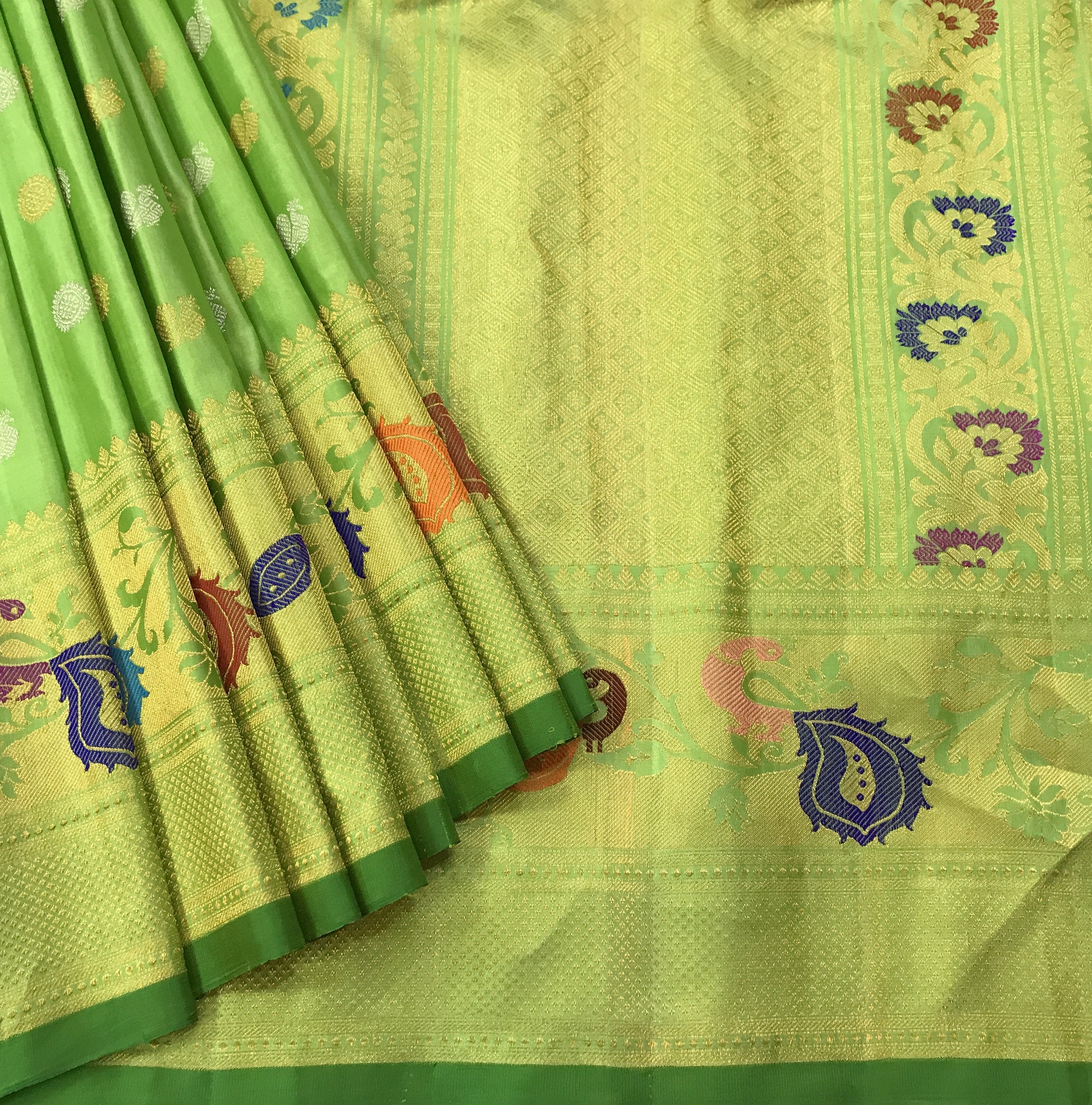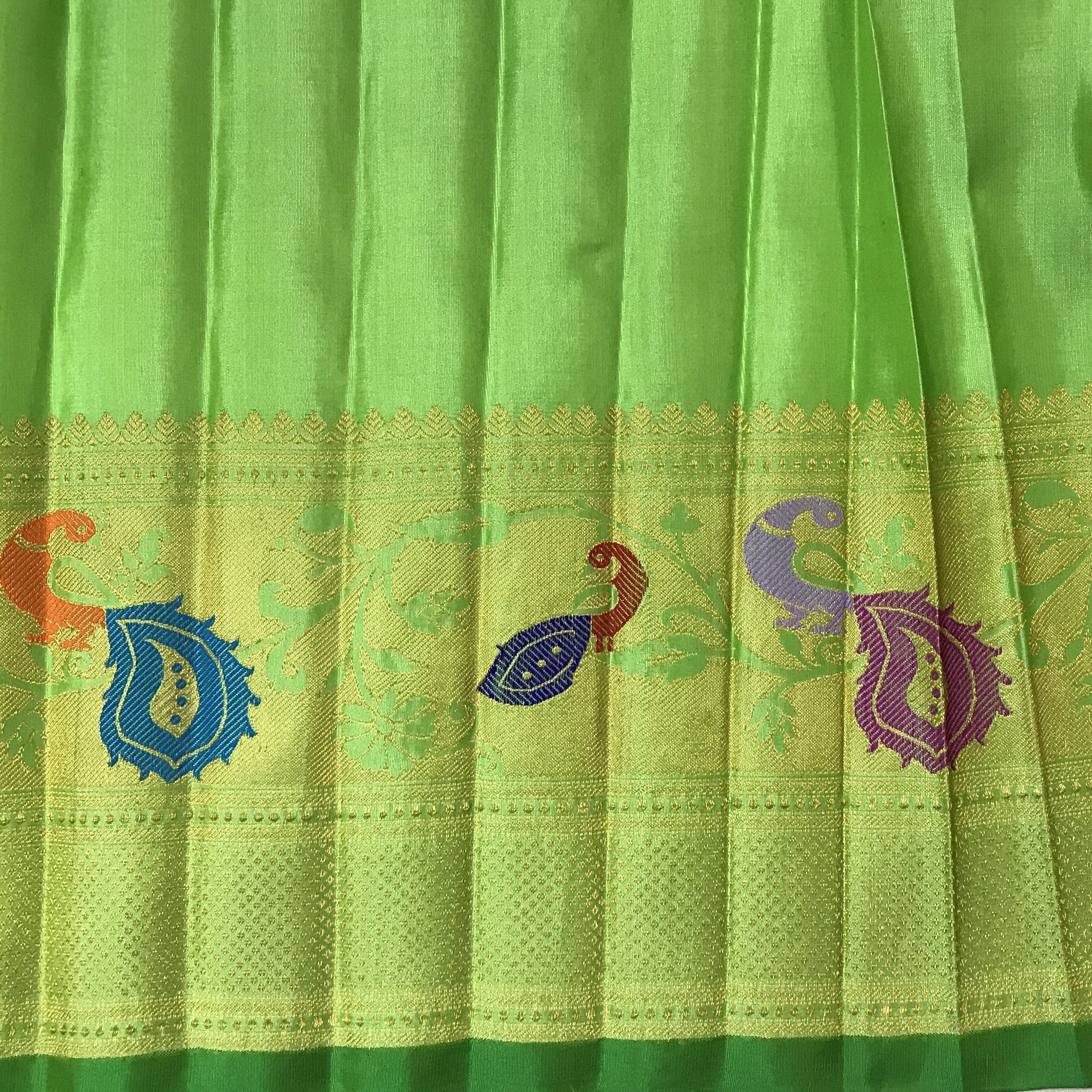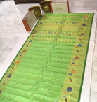 This is a green coloured Gadhwal saree. One of the most unique combinations in pure silk- beige with self coloured meenakari border with peacock ! The special intricate peacock design border and pallu creates a fascinating effect on this weave! A perfect pick to wear on any special occasion or festival.