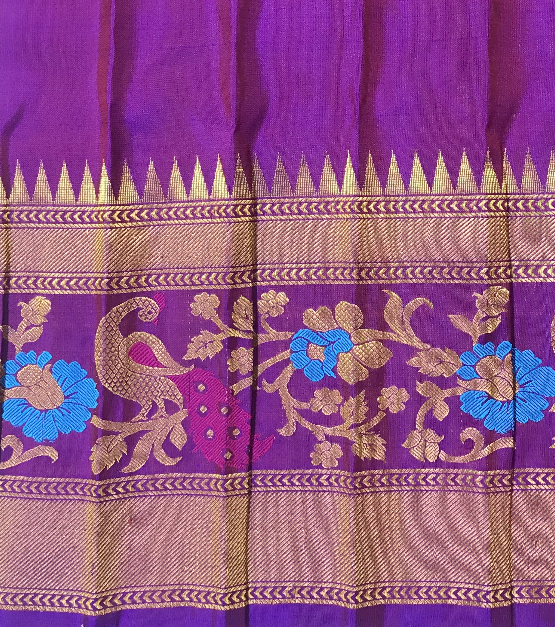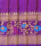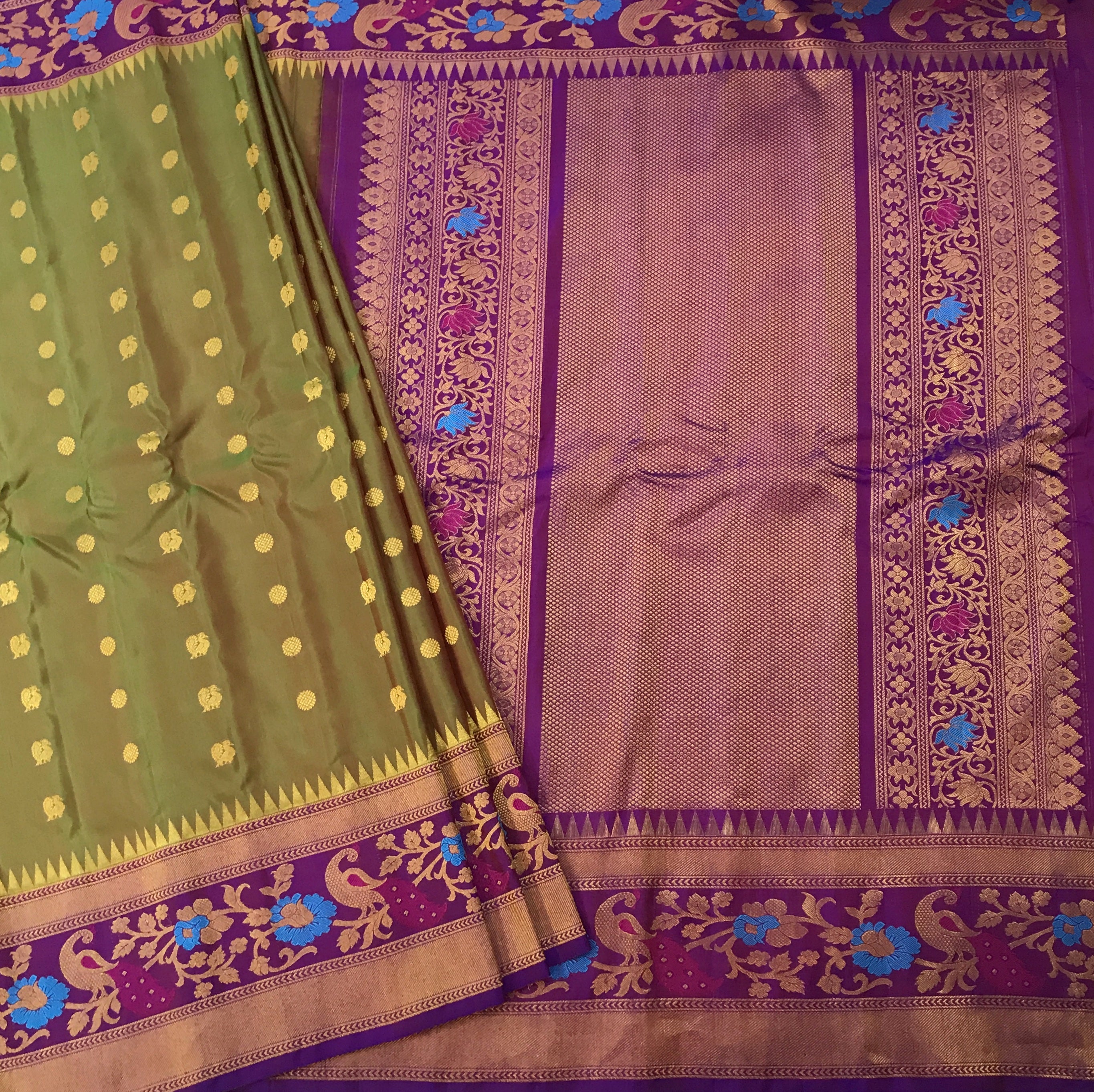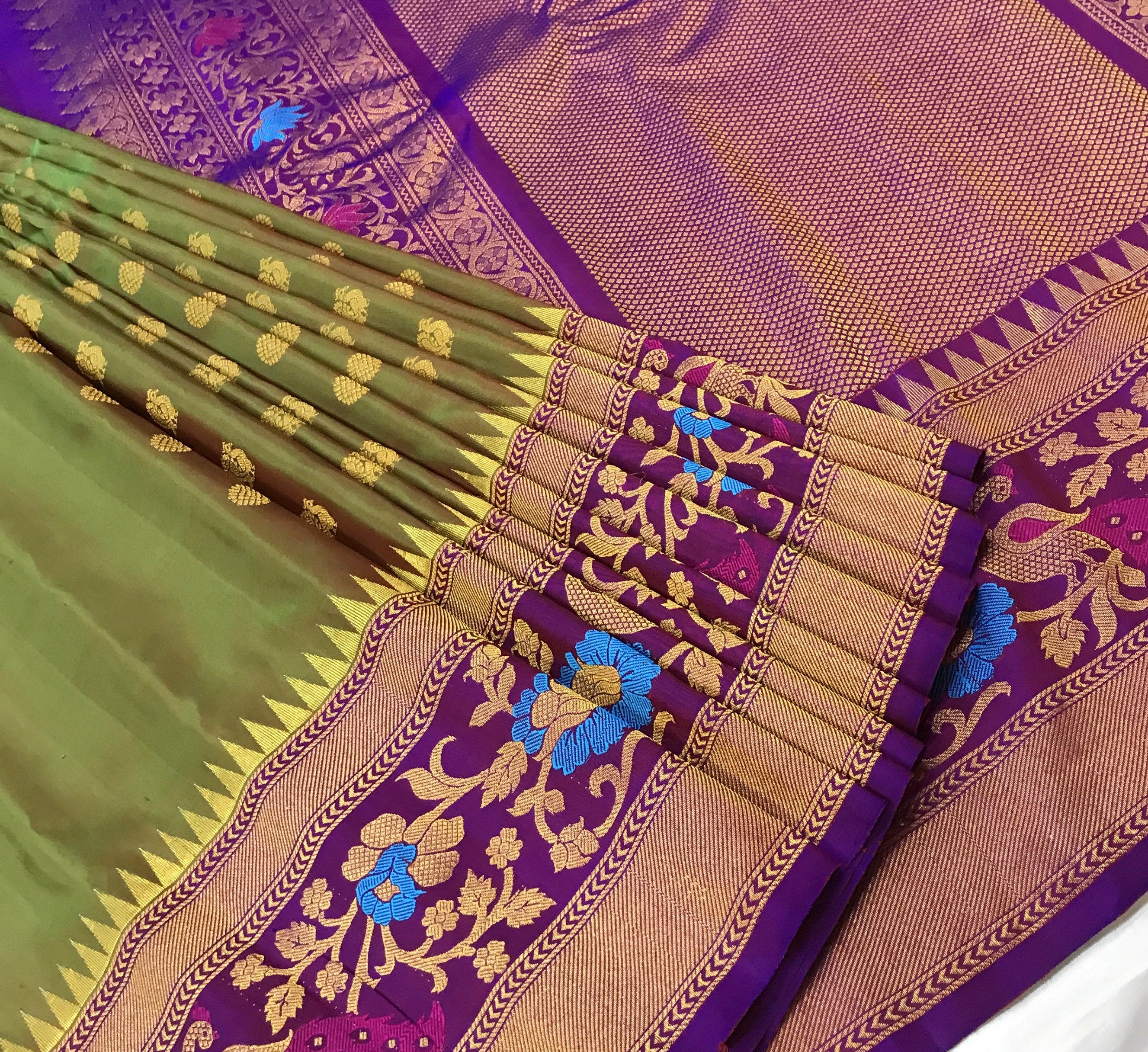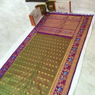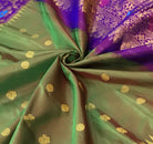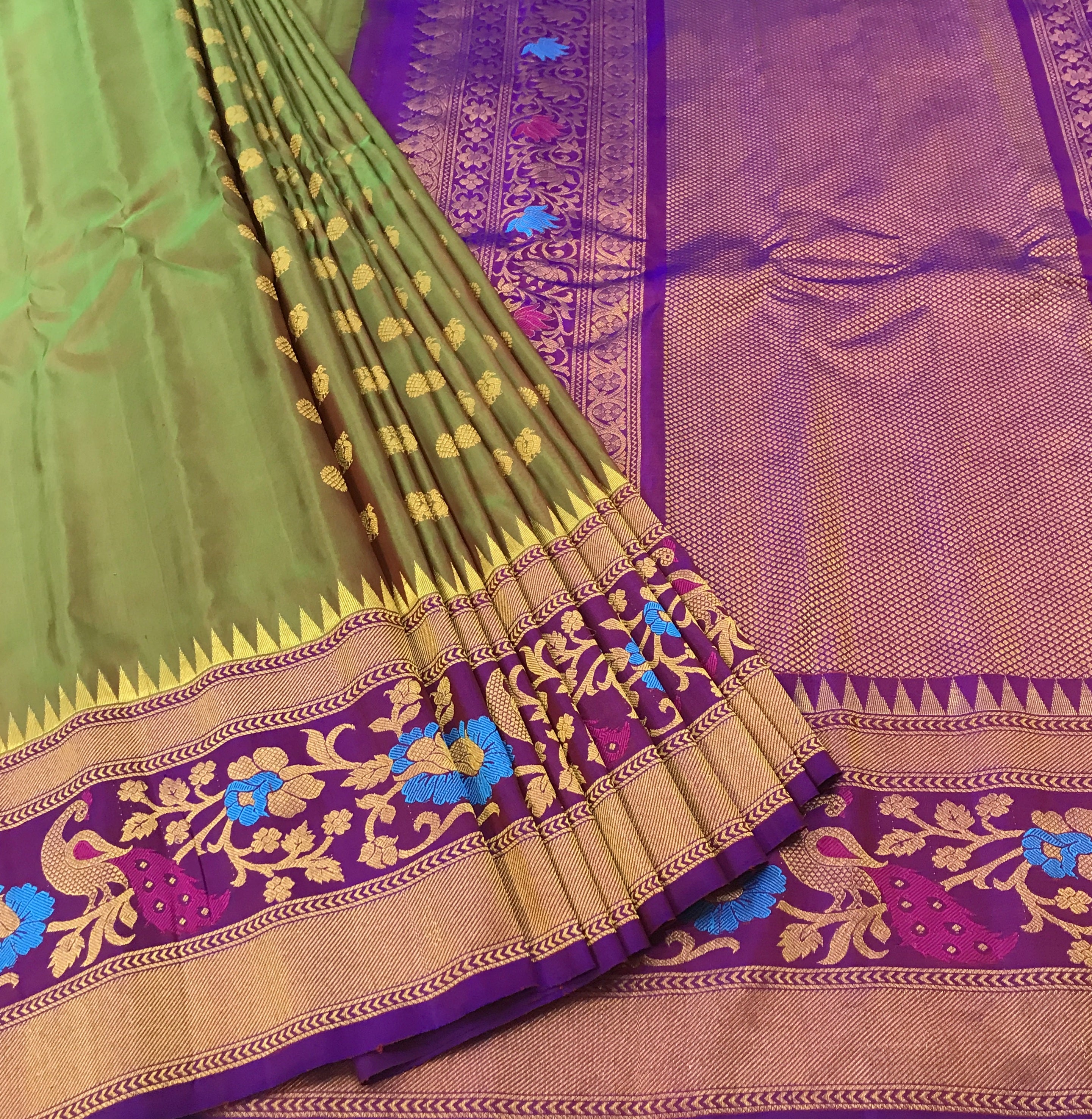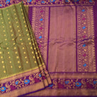 A very beautiful anjiri ( green ) coloured 'designer border Gadhwal' reflects the weaver's dedication and hard work. The intricate floral-peacock butti woven in golden thread looks stylish and gives this saree a vibrant and festive vibe The intricates borders, that is, a multicoloured peacock-floral meenakari designer border, look distinctive and complementing each other.