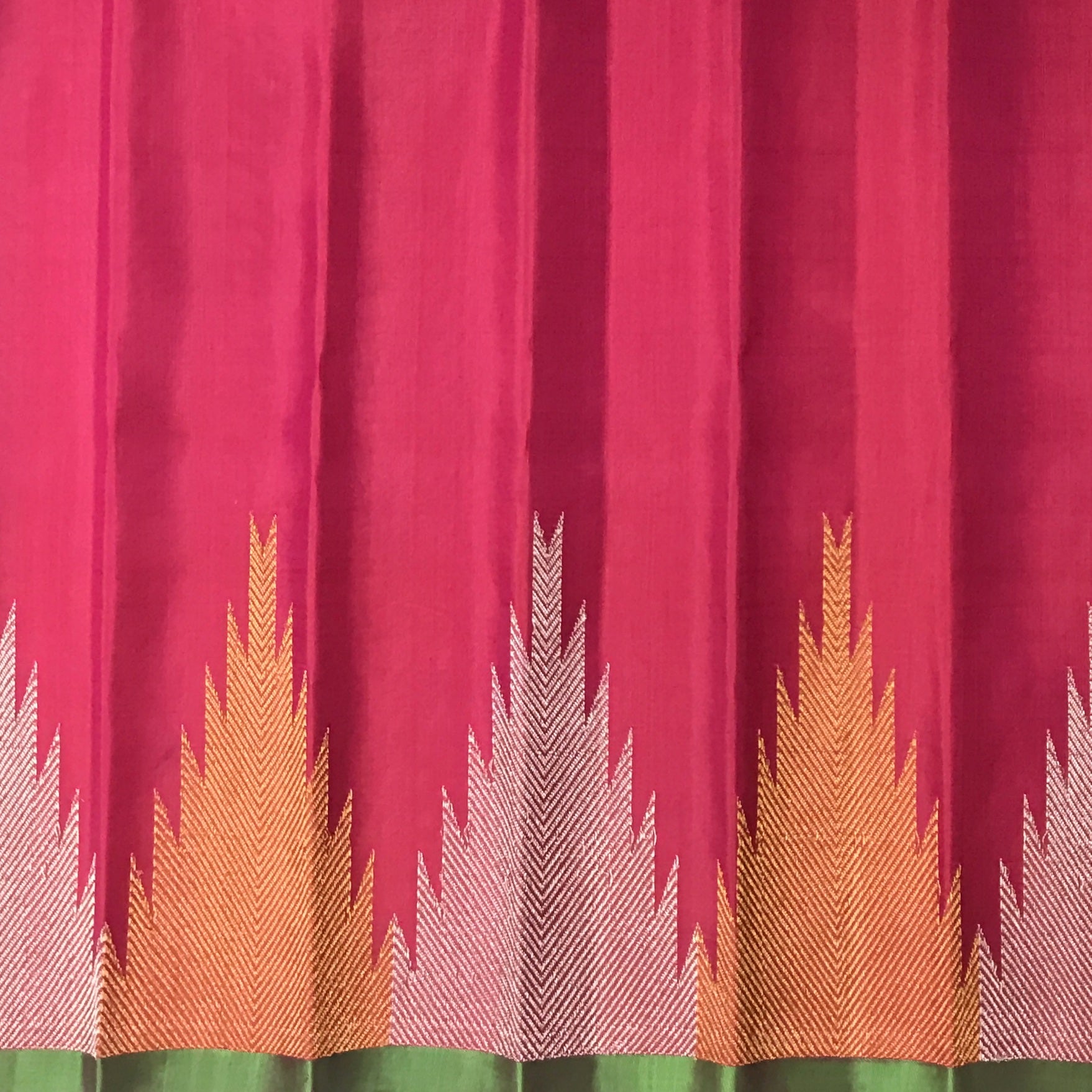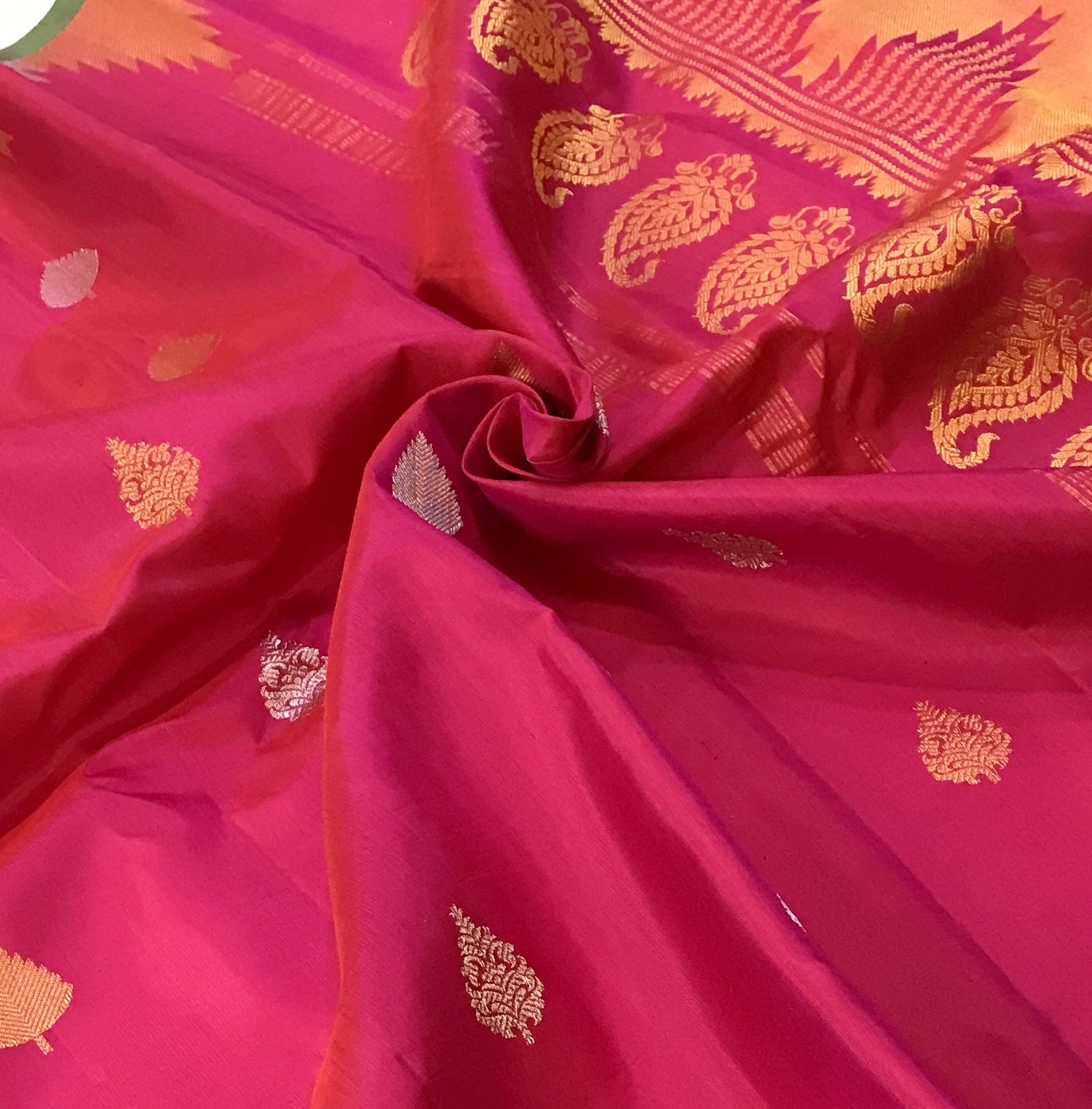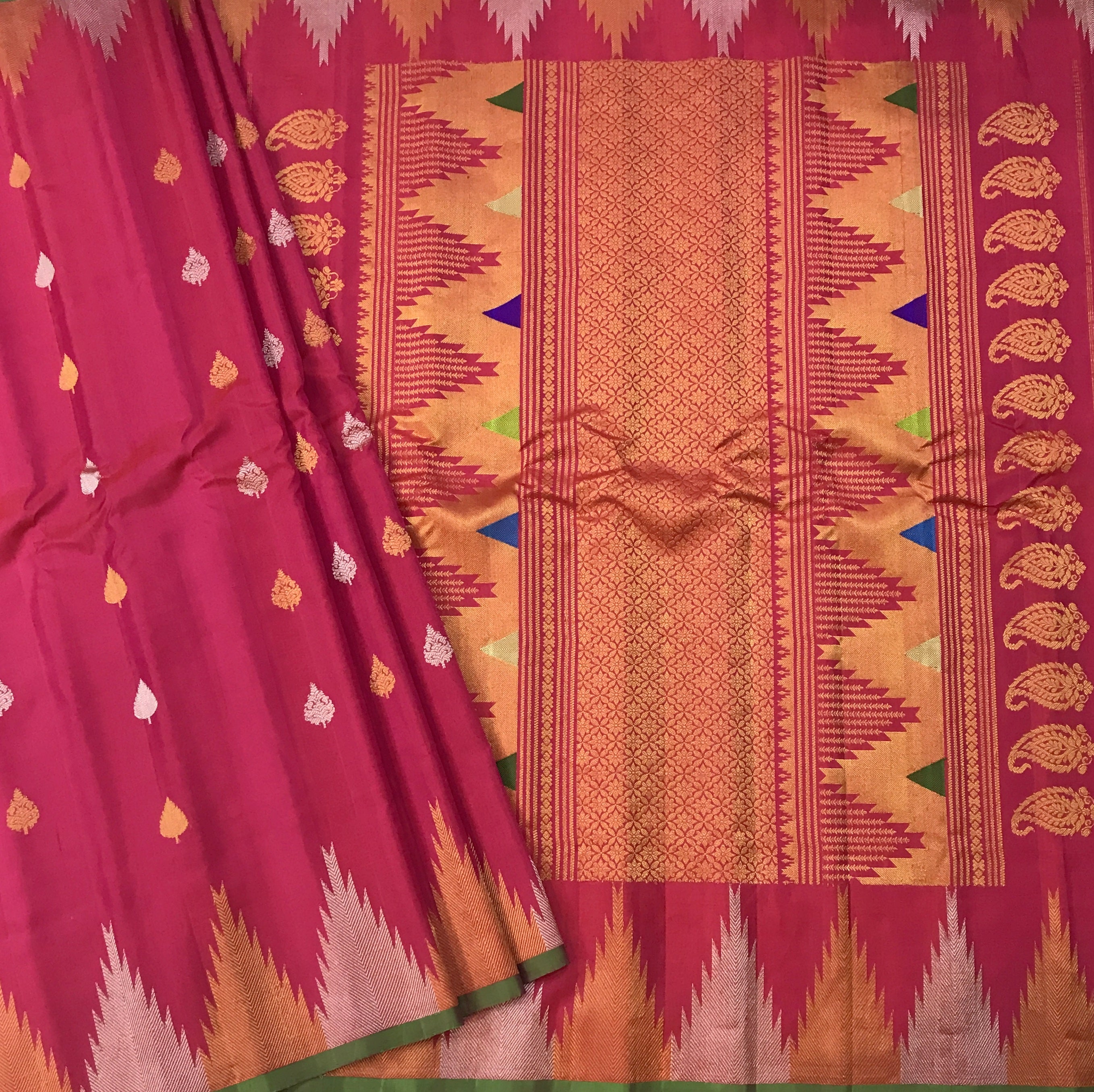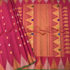 A very superb colour combination of Gadhwal! A must have in any saree connoisseur's wardrobe! Fresh pink coloured Gadhwal with a self coloured temple designer border is a unique saree. This stunning border with leaf ( motifs ) design and beautiful temple design border in golden-silver makes this saree class apart! .