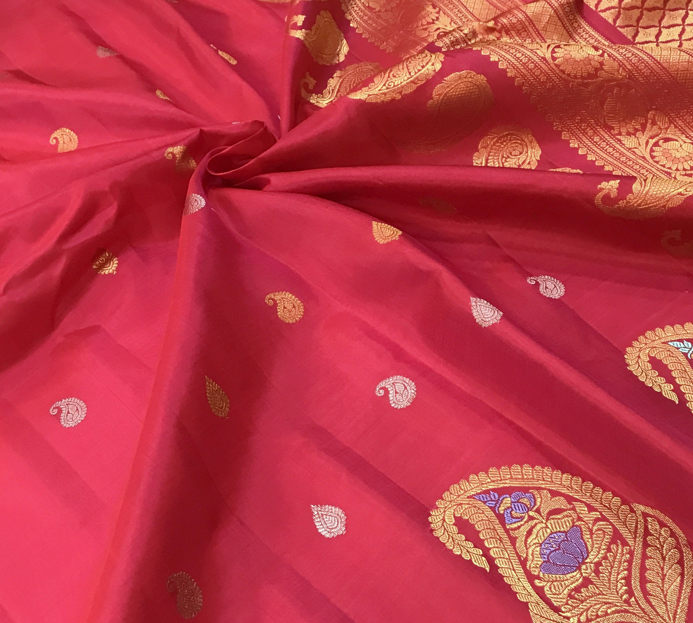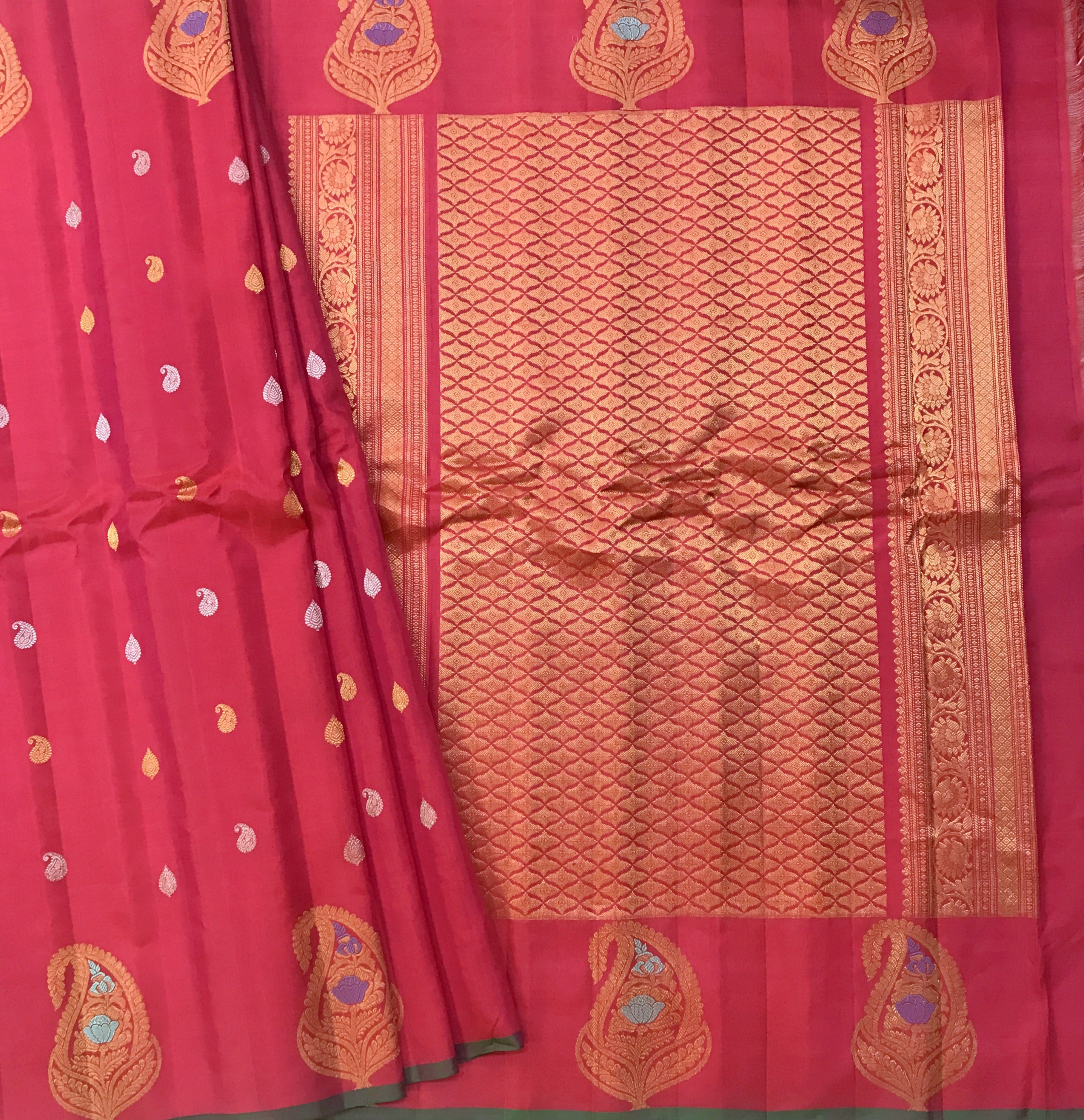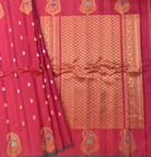 Bright shade of pink pure silk Gadhwal looks beautiful in day light as well as night time. This one is special weave, the koyari and leaf butti evenly woven in silver as well as golden zari thread through the saree give it festive touch. The meenakari golden zari border and the traditional pallu complement beautifully with this saree. This is the perfect choice for someone who is looking for traditional saree.