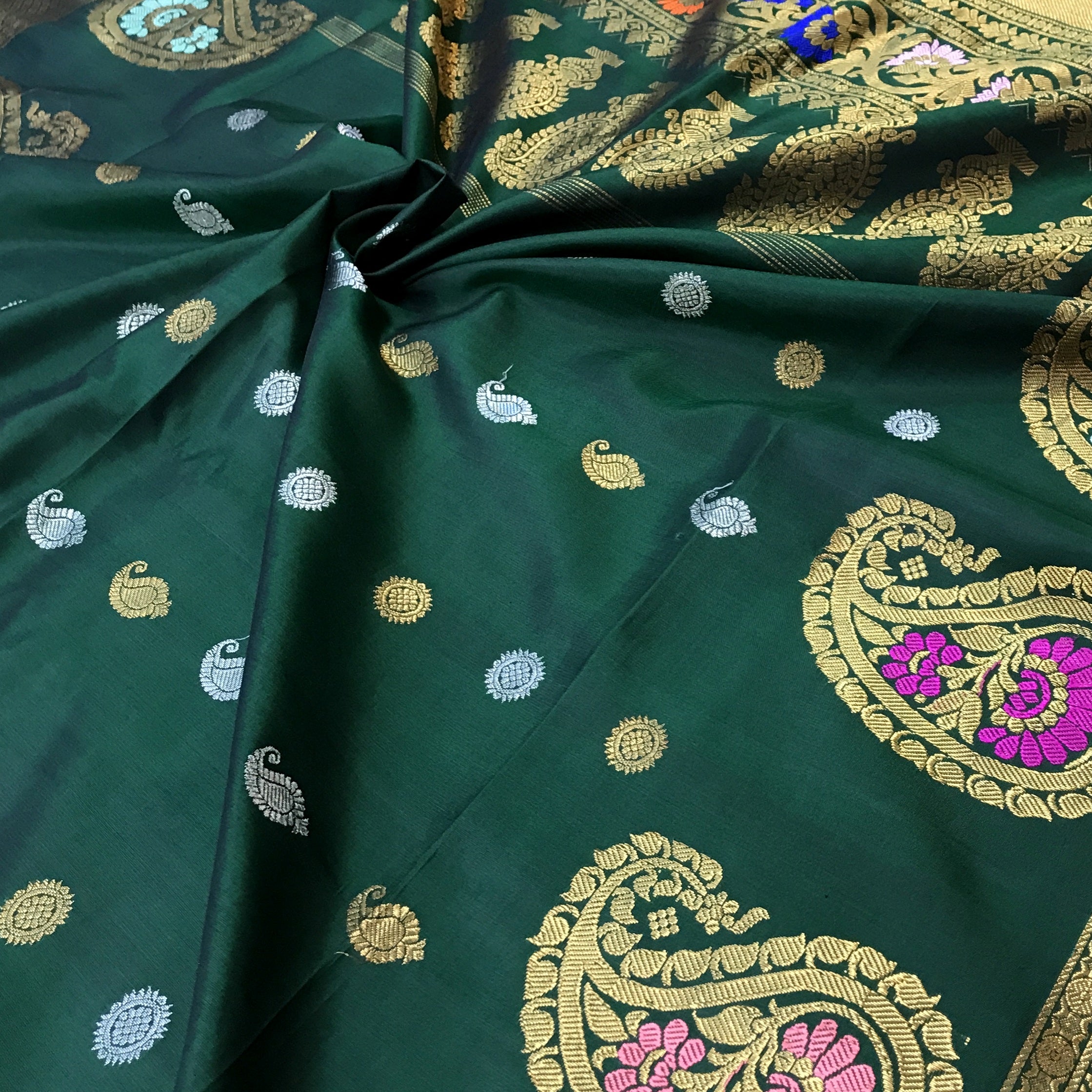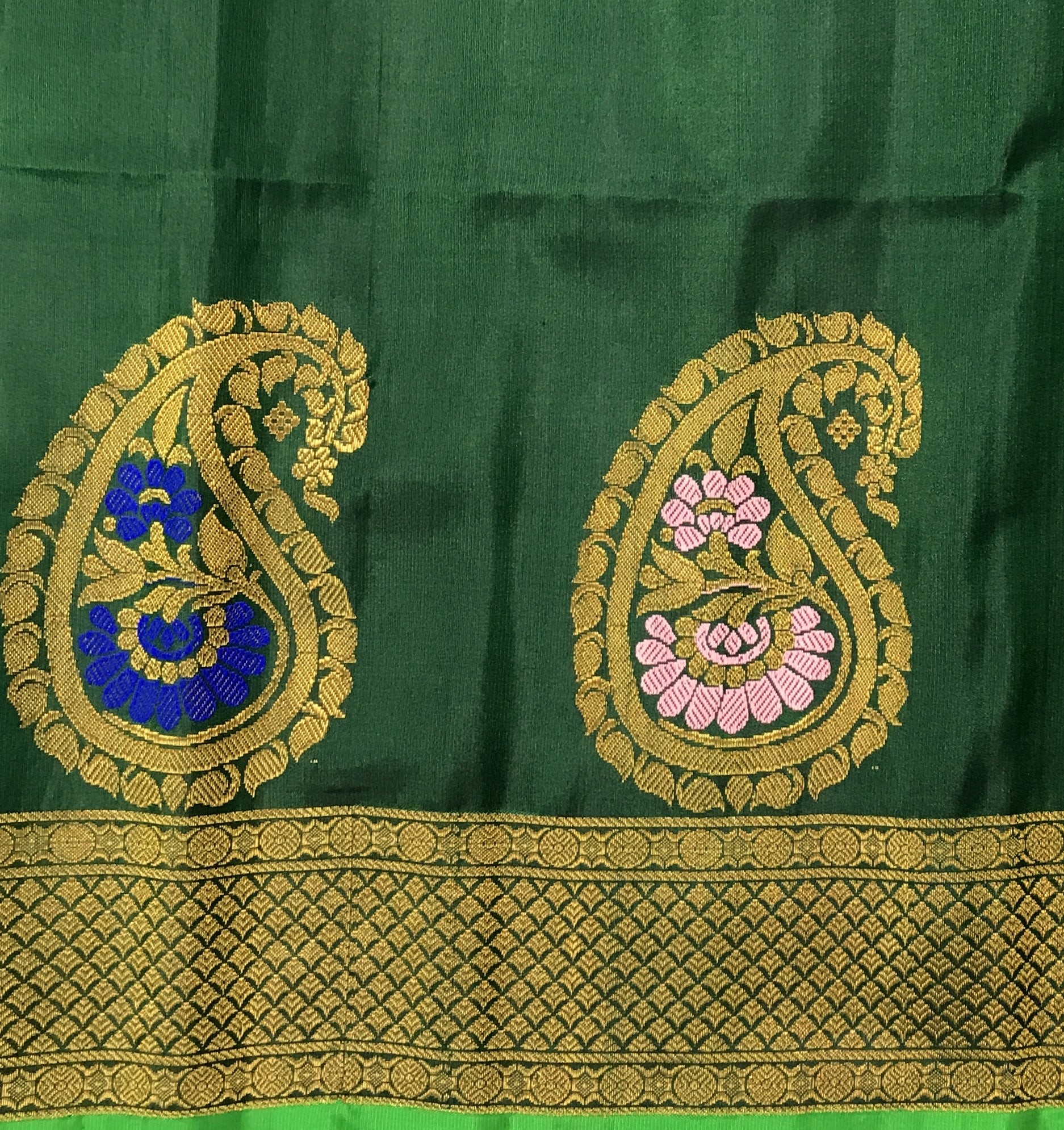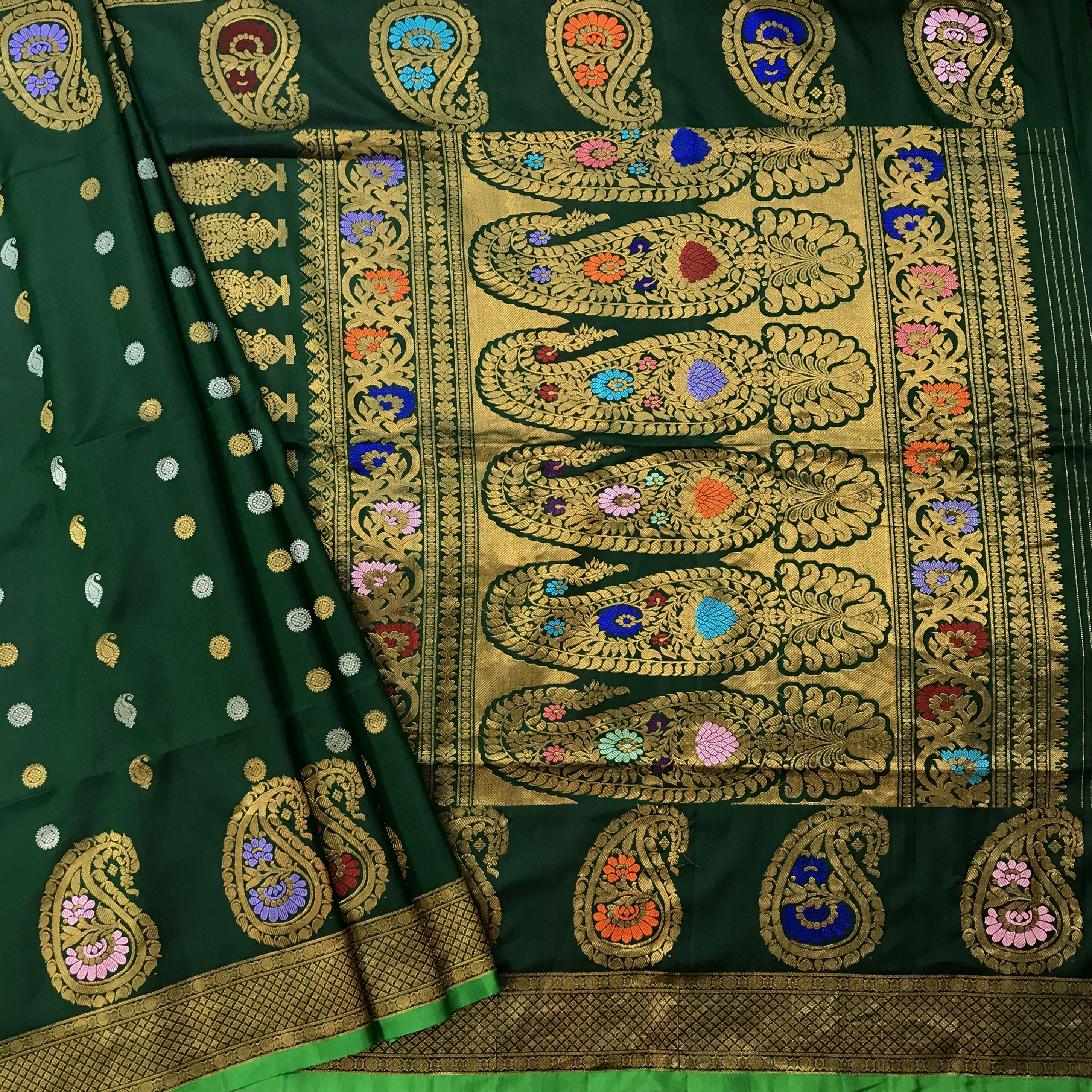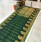 Bright shade of green pure silk Gadhwal looks beautiful in day light as well as night time. This one is special weave, the floral and koyari butti evenly woven in silver as well as golden zari thread through the saree give it festive touch. The meenakari golden zari border and the traditional pallu complement beautifully with this saree. This is the perfect choice for someone who is looking for traditional saree.