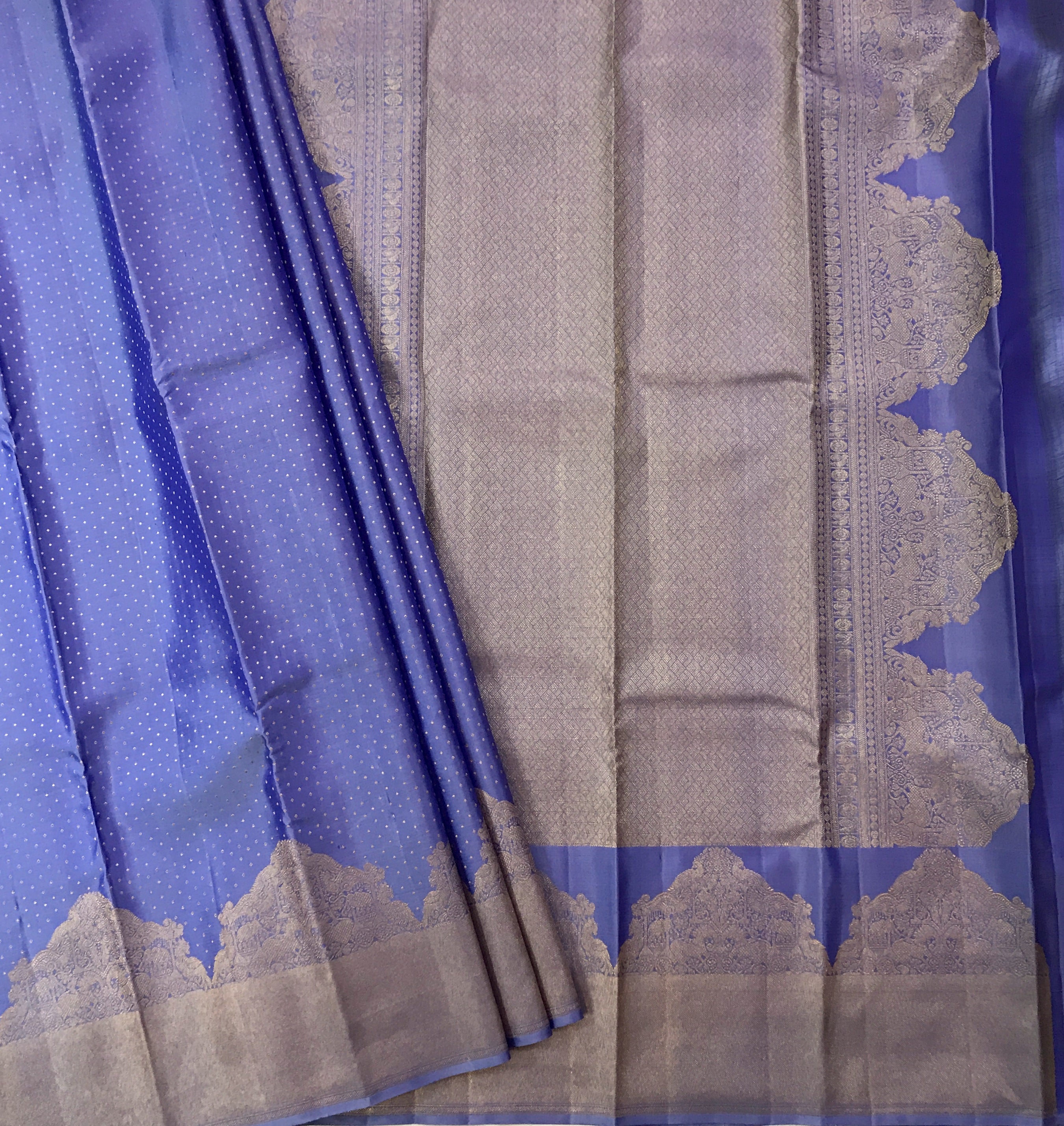 A captivating blue Kanjeevaram saree beautifully woven with delicate zari butti , reflecting the perfect blend of tradition and sophistication. The blue hue symbolizes elegance and grace, while the shimmering zari adds a royal charm. Crafted from pure silk, this saree drapes beautifully, Ideal for weddings, festive celebrations, and special occasions