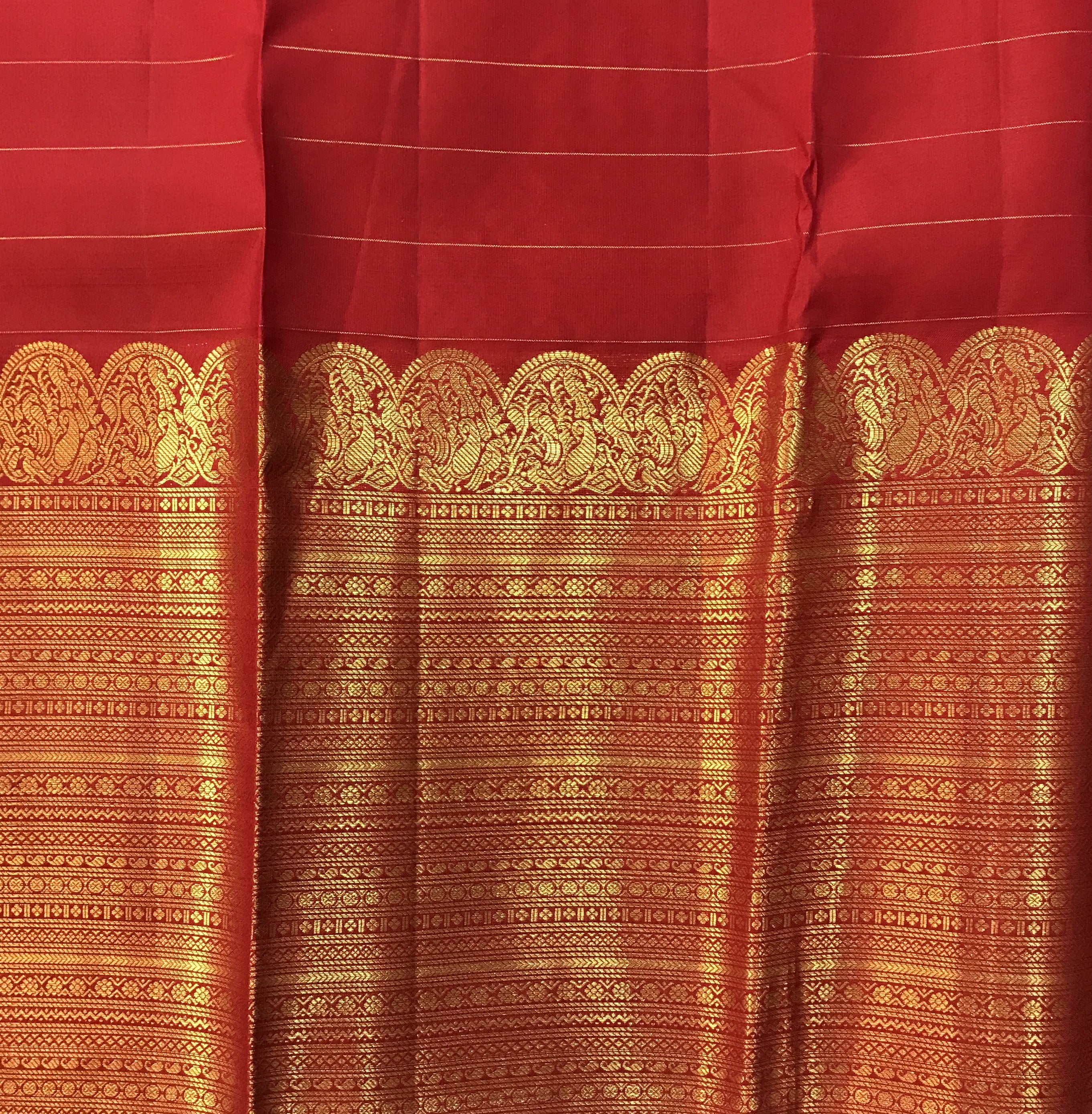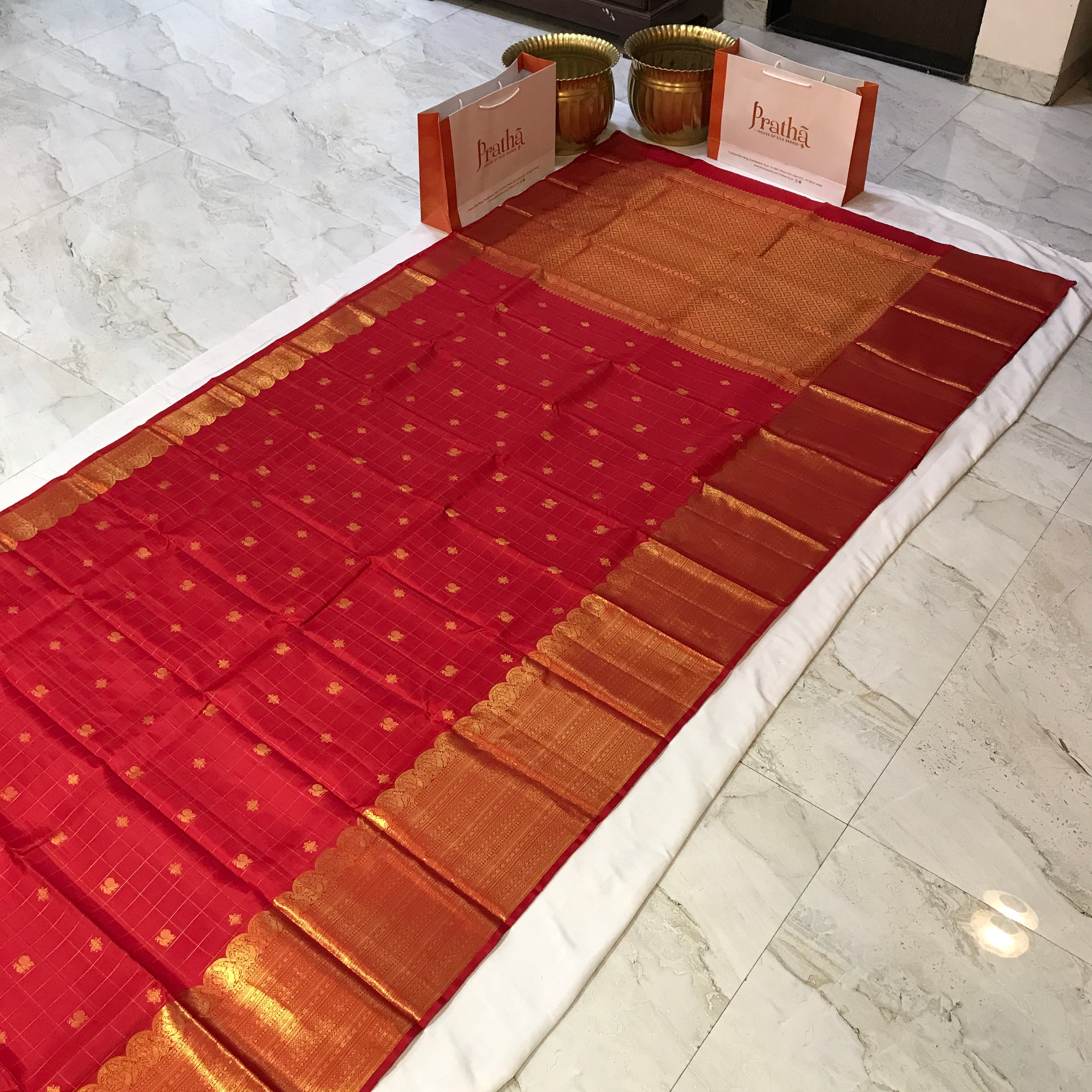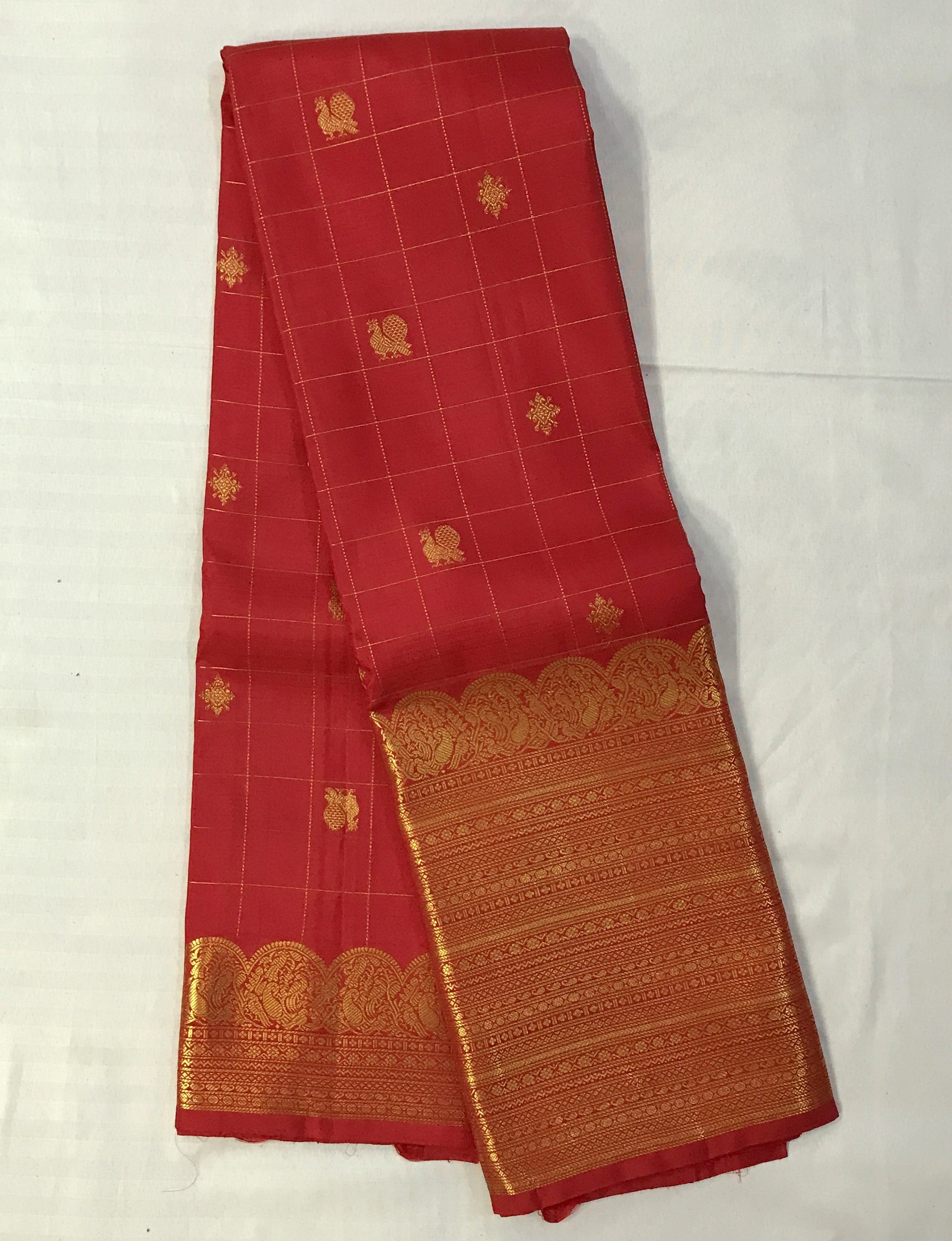 This exquisite Kanjeevaram saree showcases a classic red shade, elevated by a rich golden zari border that exudes timeless elegance. The body of the saree features an intricate pattern of small checks, delicately woven with golden zari threads, adding a touch of finesse to its design. Accentuating the saree's grandeur, the golden-colored pallu, adorned with elaborate zari work, creates a striking contrast, perfectly harmonizing with the vibrant hues of the saree.