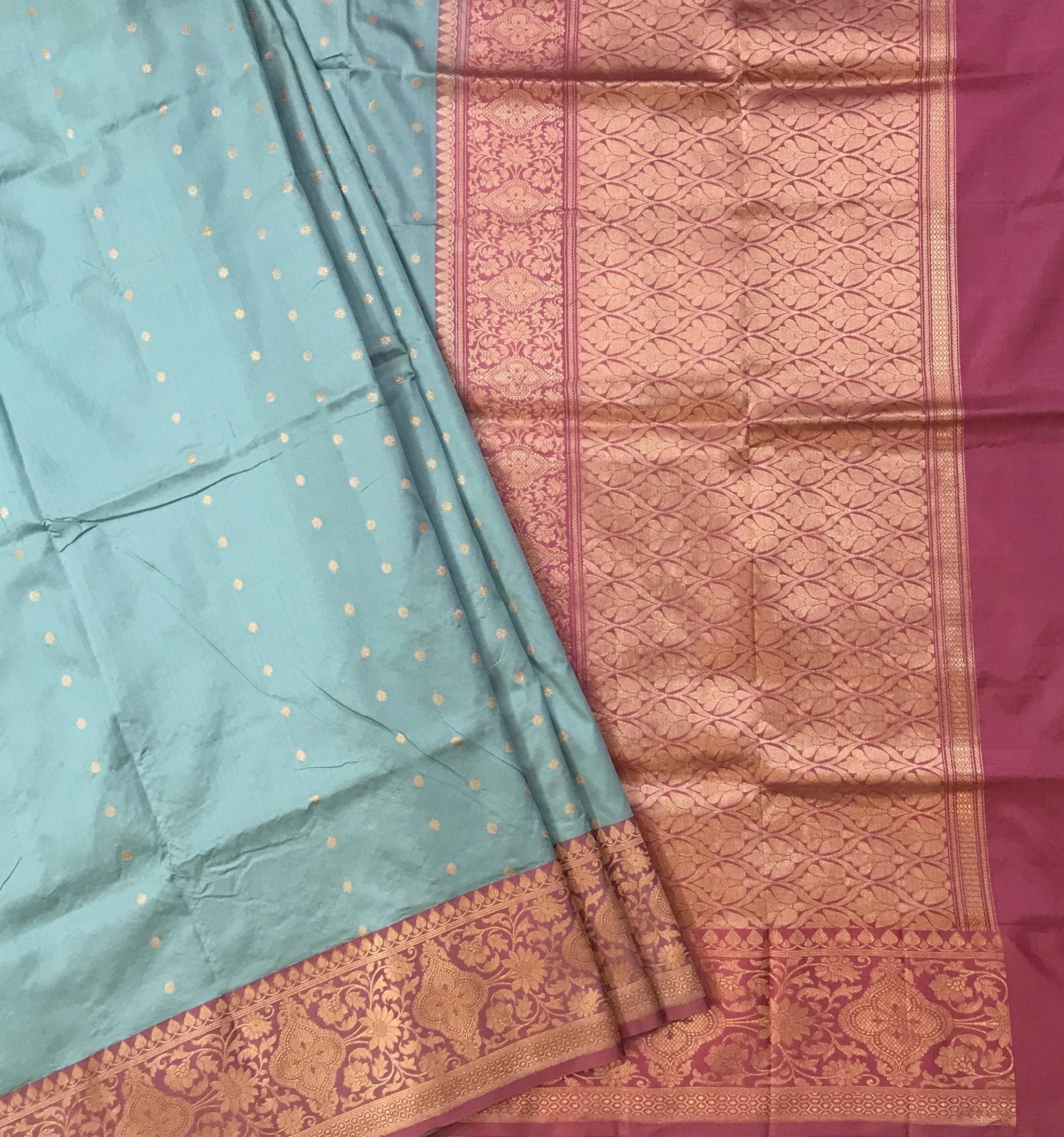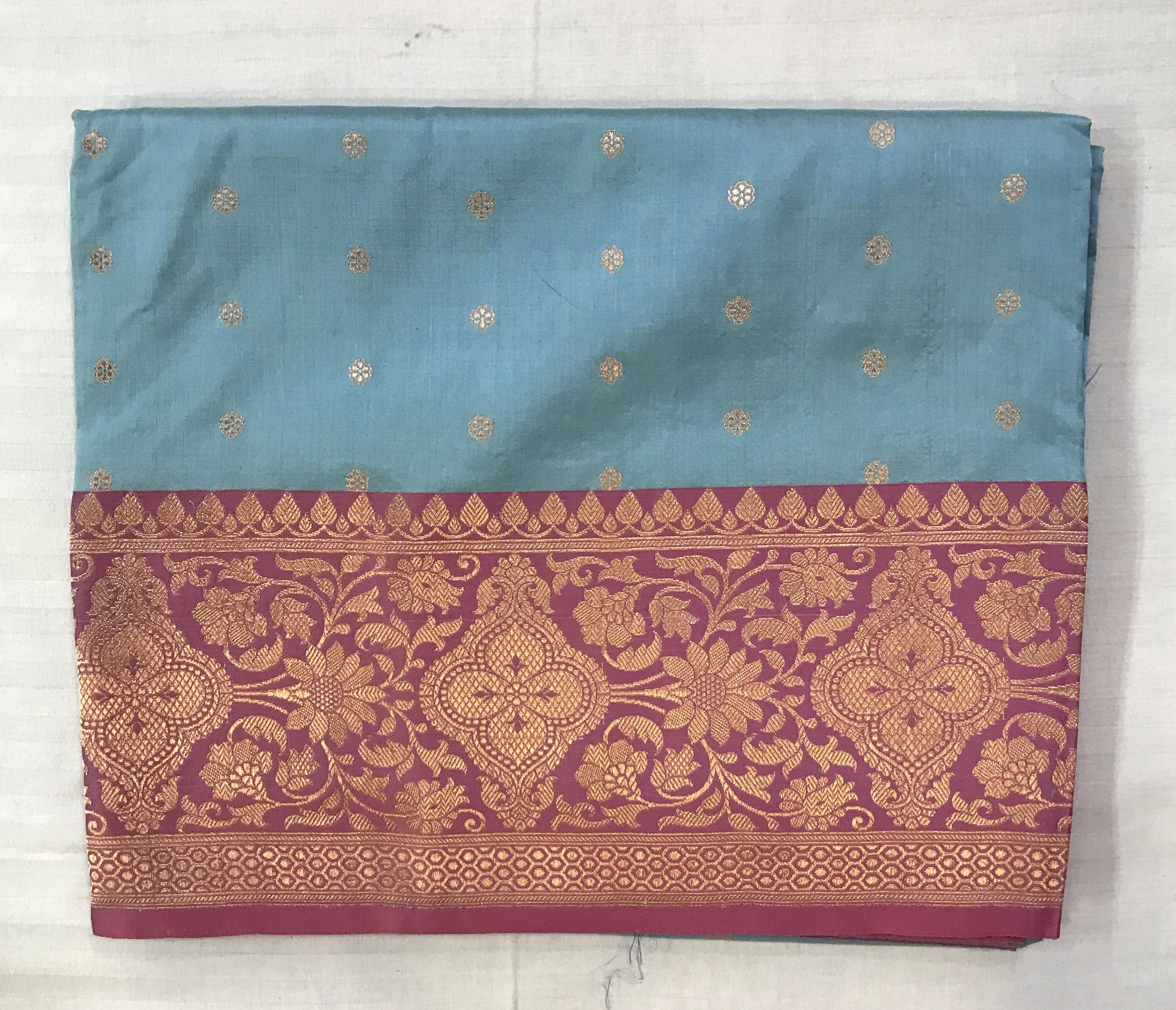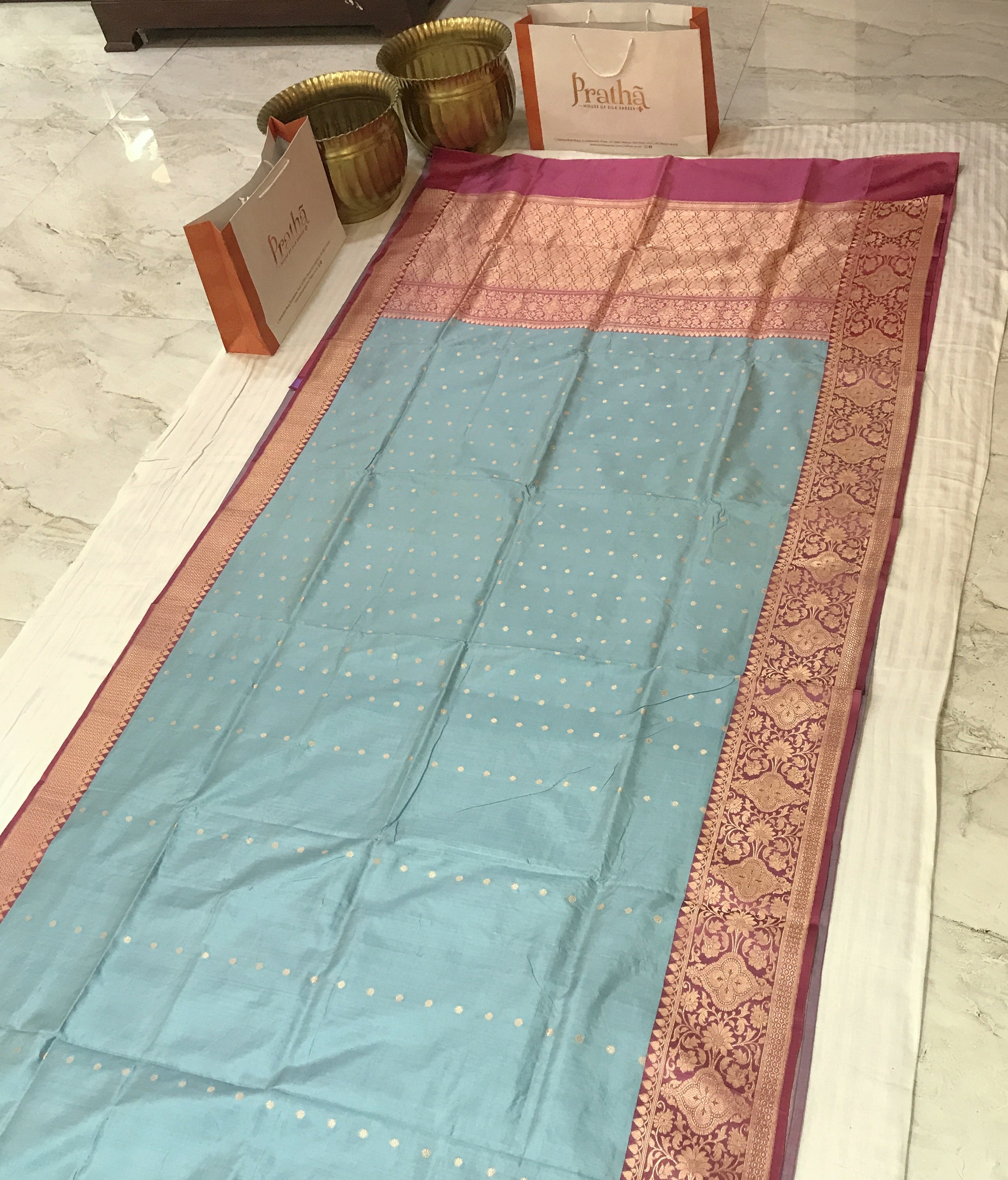 This saree in a stunning shade of blue with a beautiful pink contrast border with delicate shaped butti zari thread, is all set to steal hearts. Do not miss the border and pallu of this saree which have a beautiful design of golden zari, that's amazing. This kind of saree will look great on a bride or on any of your most special days!