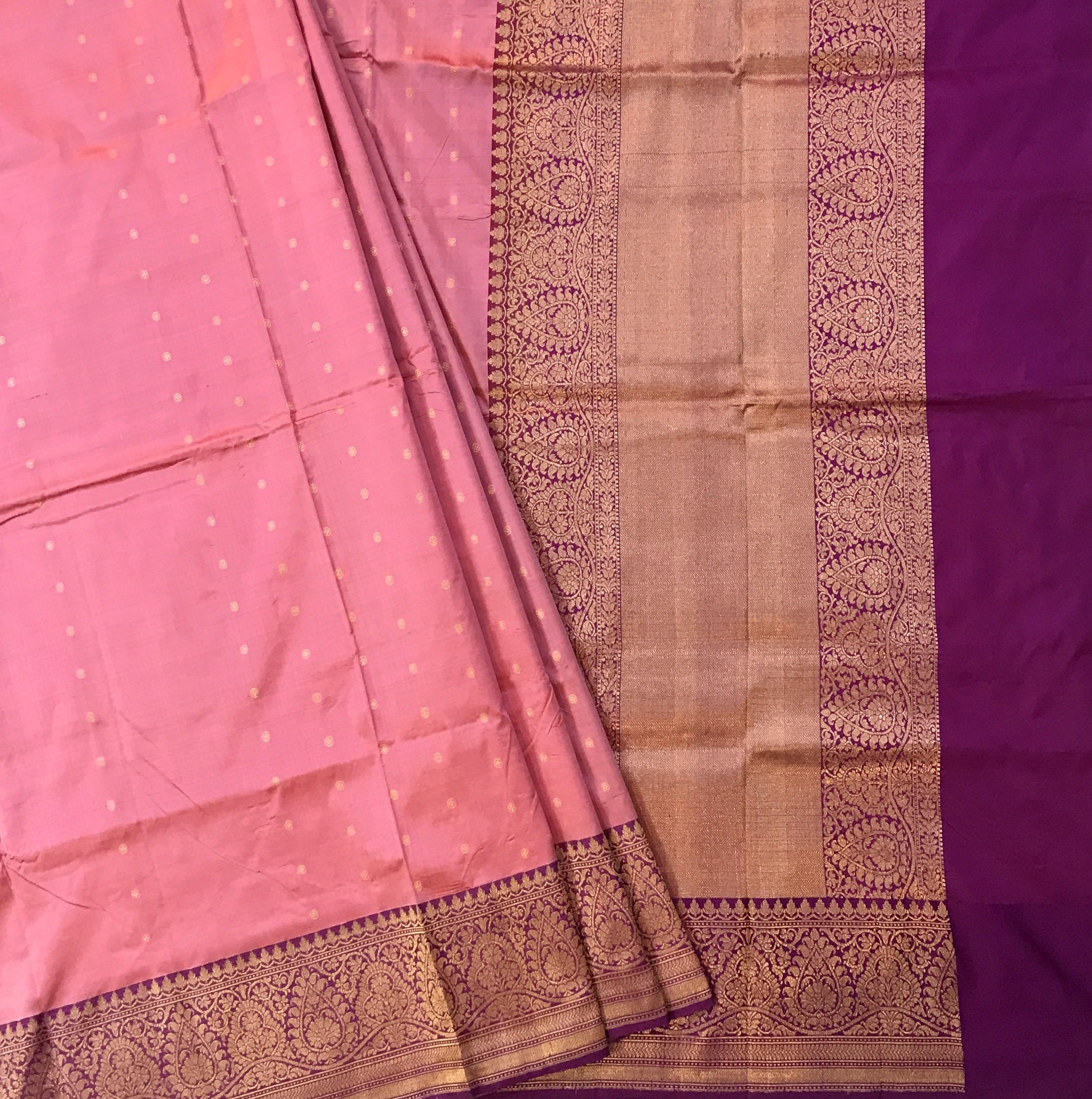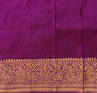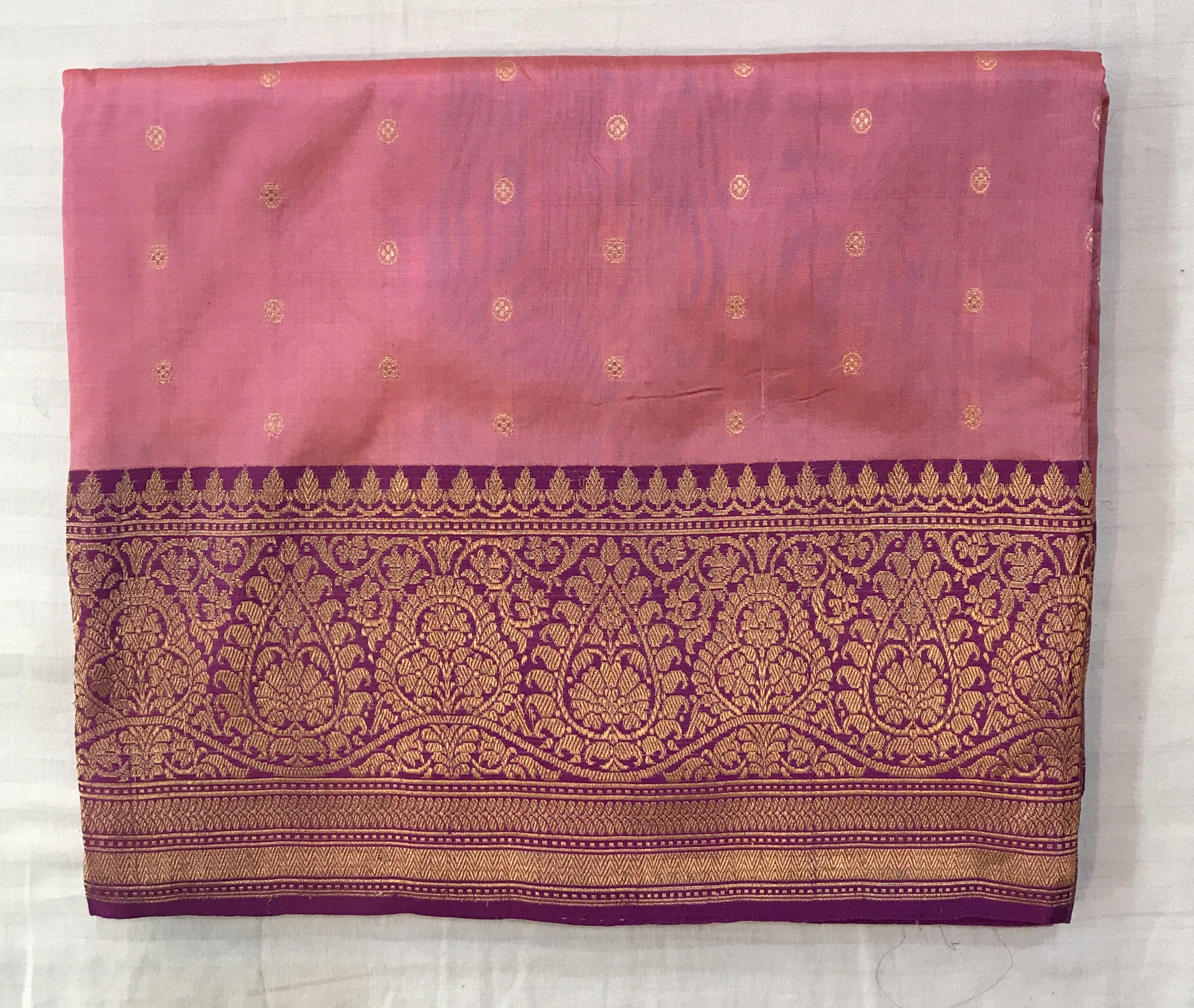 An unique combination of pink and magenta colored contrast border. Radiate elegance in this Banarasi saree adorned golden zari butti motifs. The striking contrast border adds a touch of traditional charm to this timeless masterpiece.