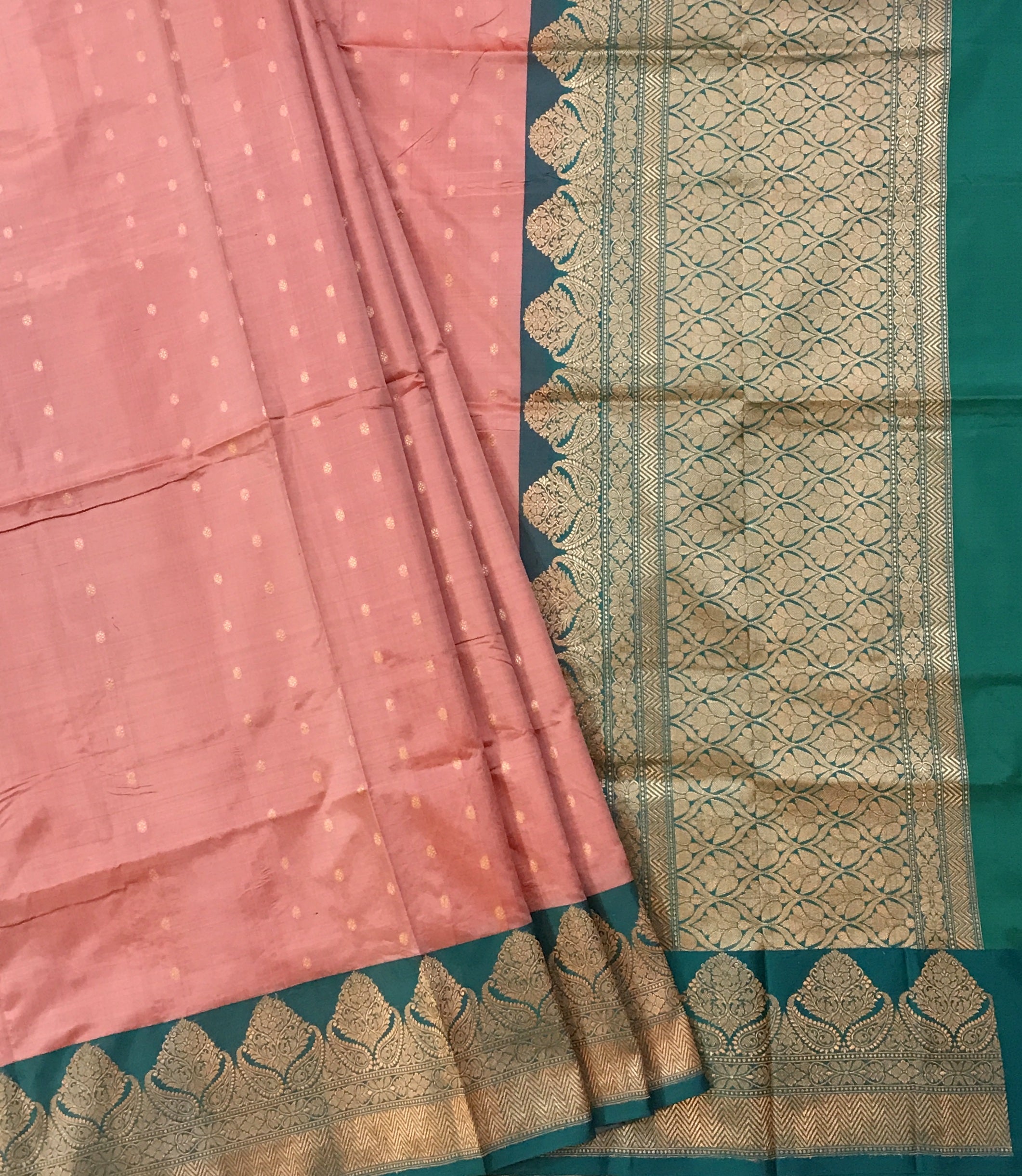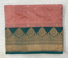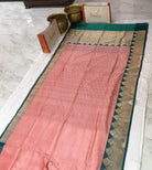 This saree in a stunning shade of peach-pink with a beautiful green contrast border with delicate shaped butti zari thread, is all set to steal hearts. Do not miss the border and pallu of this saree which have a beautiful design of golden zari, that's amazing. This kind of saree will look great on a bride or on any of your most  special days!