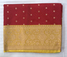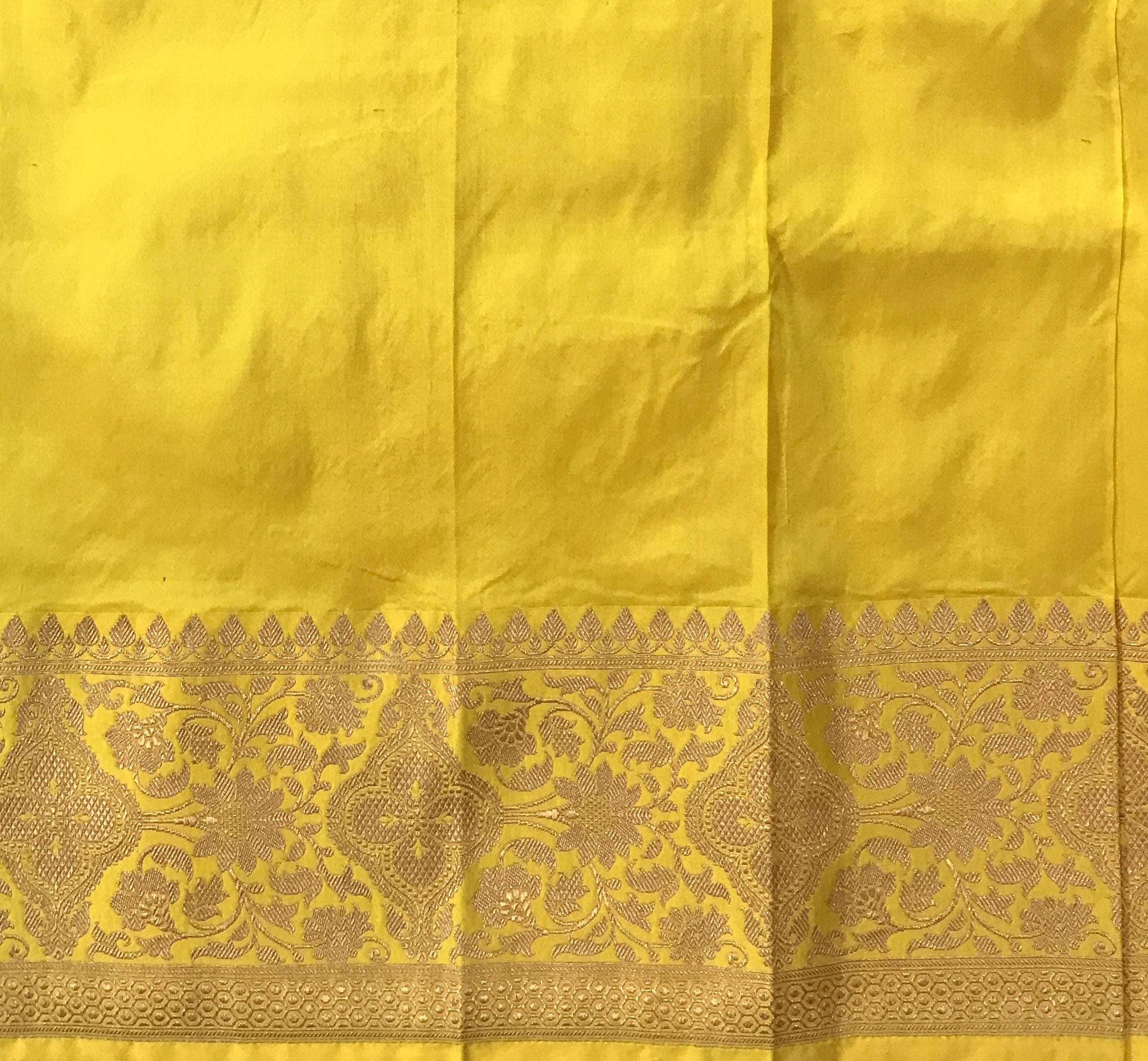 An unique combination of red and yellow colored contrast border. Radiate elegance in this Banarasi saree adorned golden zari butti motifs. The striking contrast border adds a touch of traditional charm to this timeless masterpiece.