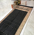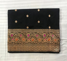This enchanting Banarasi saree in a delicate shade of black radiates timeless elegance. The self-colored zari with meenakari design border enhances its traditional charm, while the intricate leaf-inspired butti motifs in zari add a layer of refined artistry. The highlight of this saree is the exquisite multicolored meenakari work on the border and pallu, showcasing intricate floral designs that create a stunning visual harmony. Paired with a matching blouse featuring butti motifs and a plain border, this saree is a perfect blend of tradition and sophistication, making it a distinctive choice for any occasion.