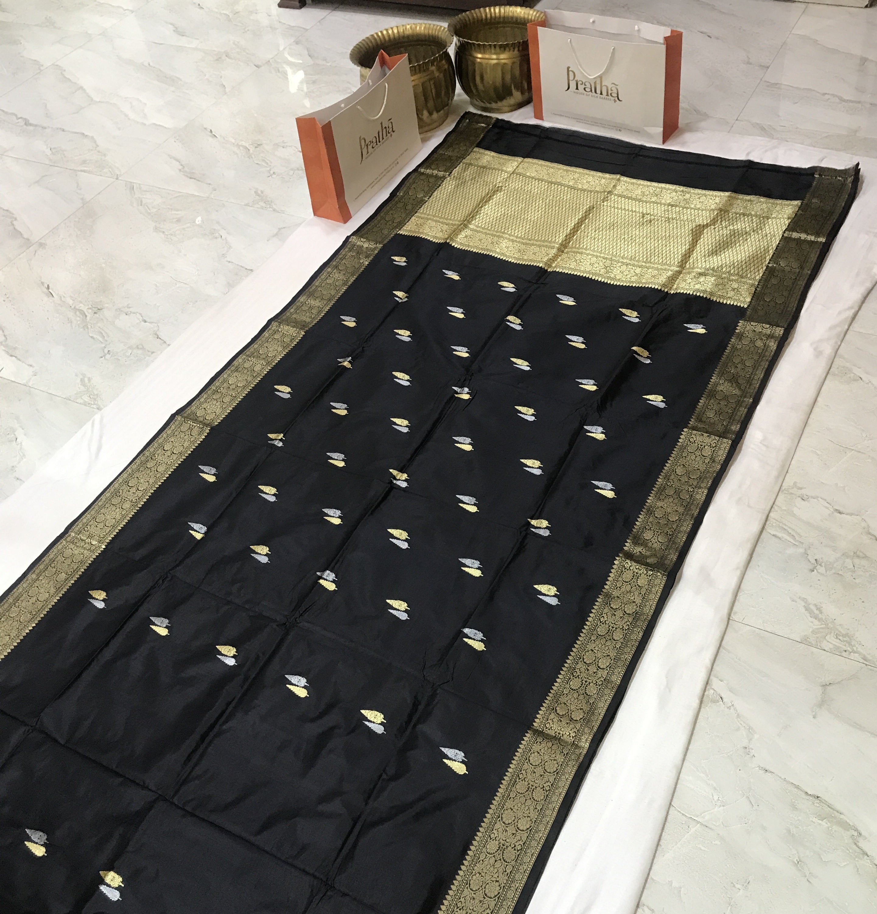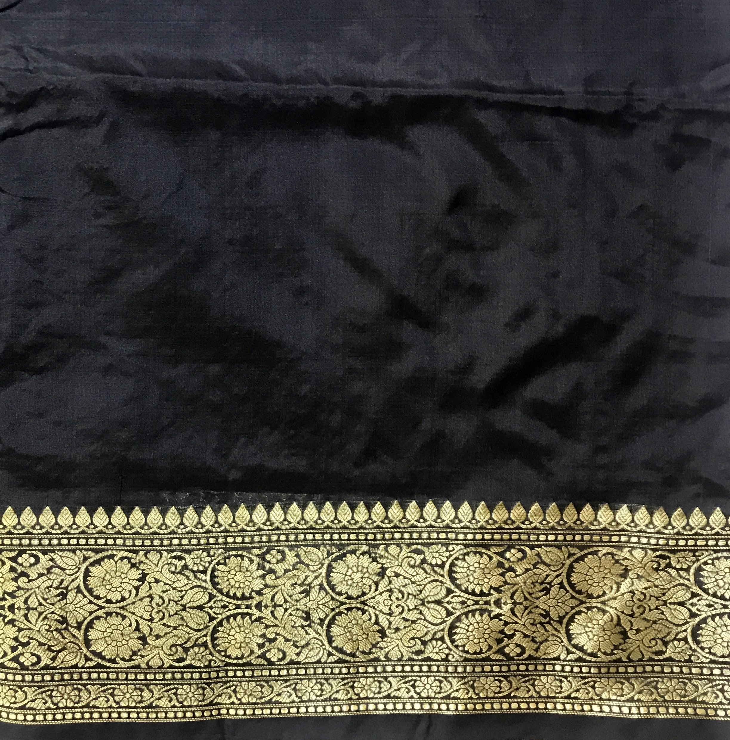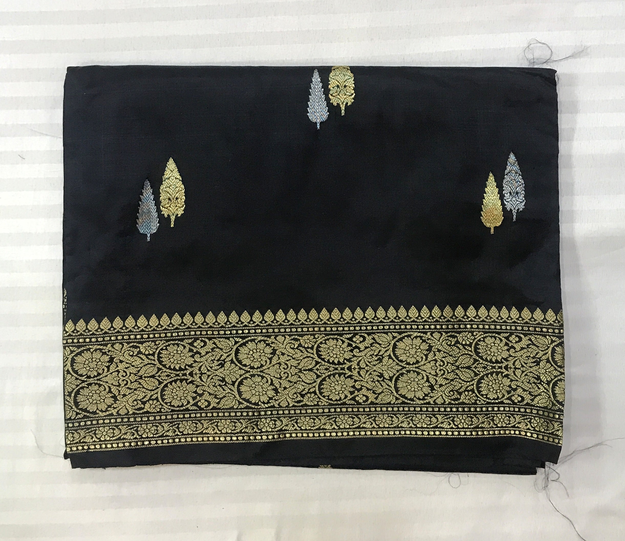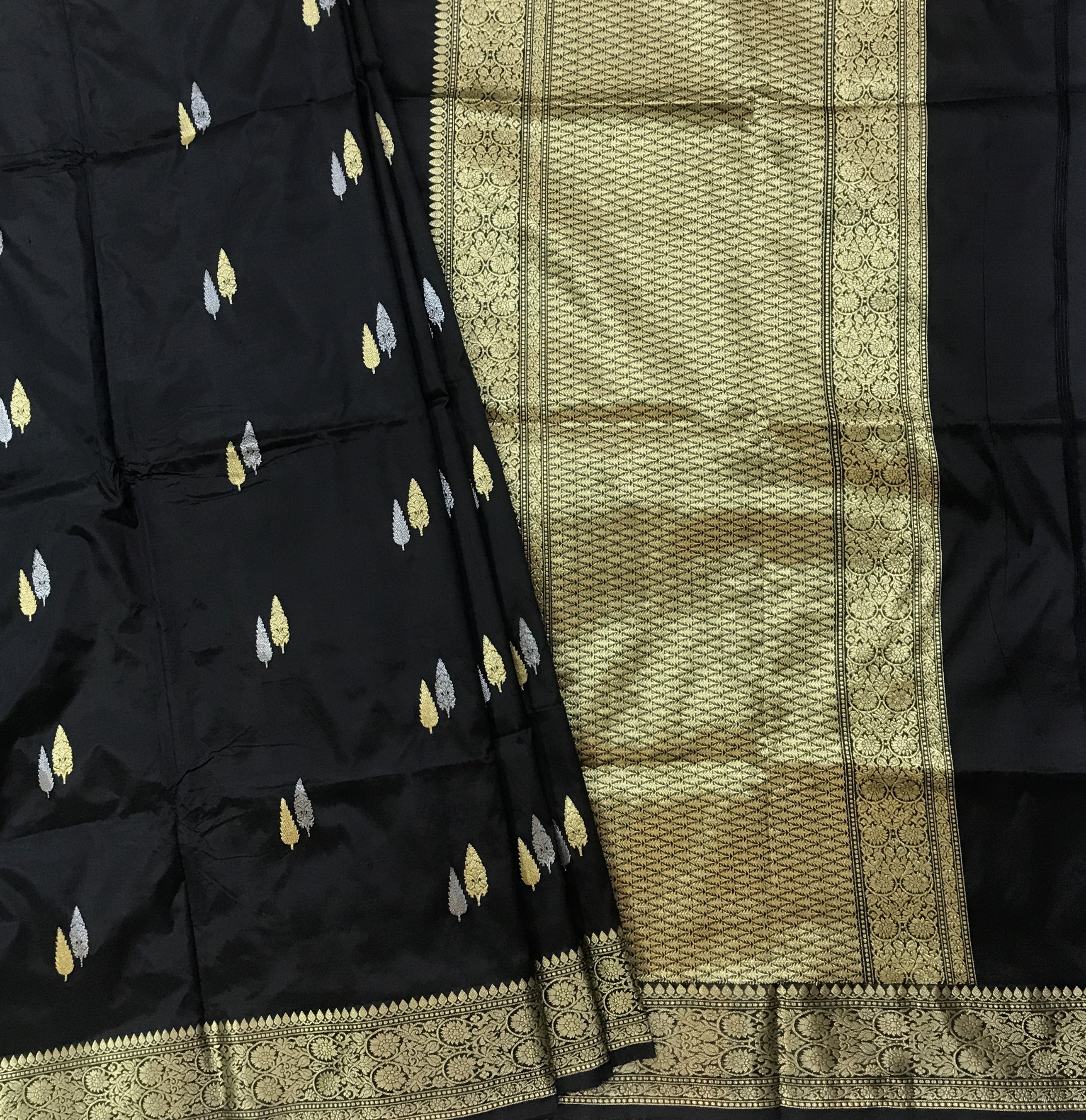 A Very beautiful shade of black and self colored golden zari border. Radiate elegance in this Banarasi saree adorned golden-silver zari butti motifs. The striking intricate design border adds a touch of traditional charm to this timeless masterpiece.