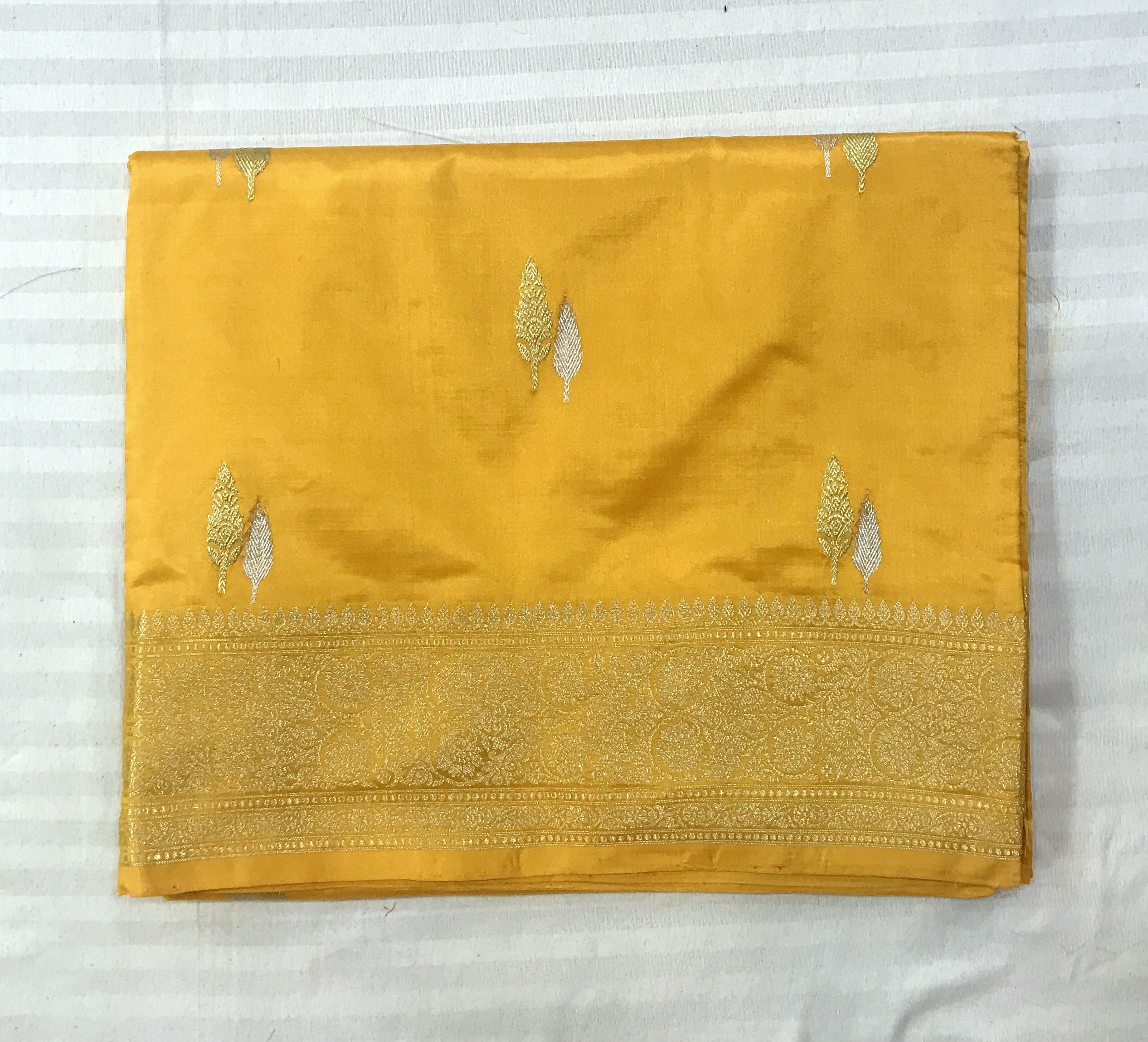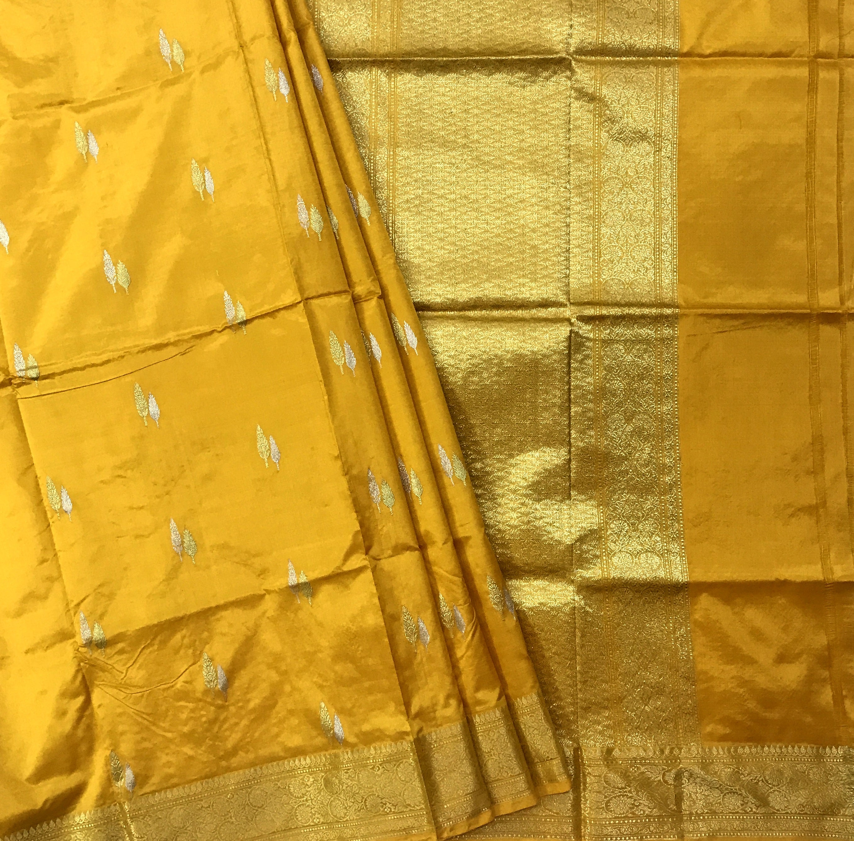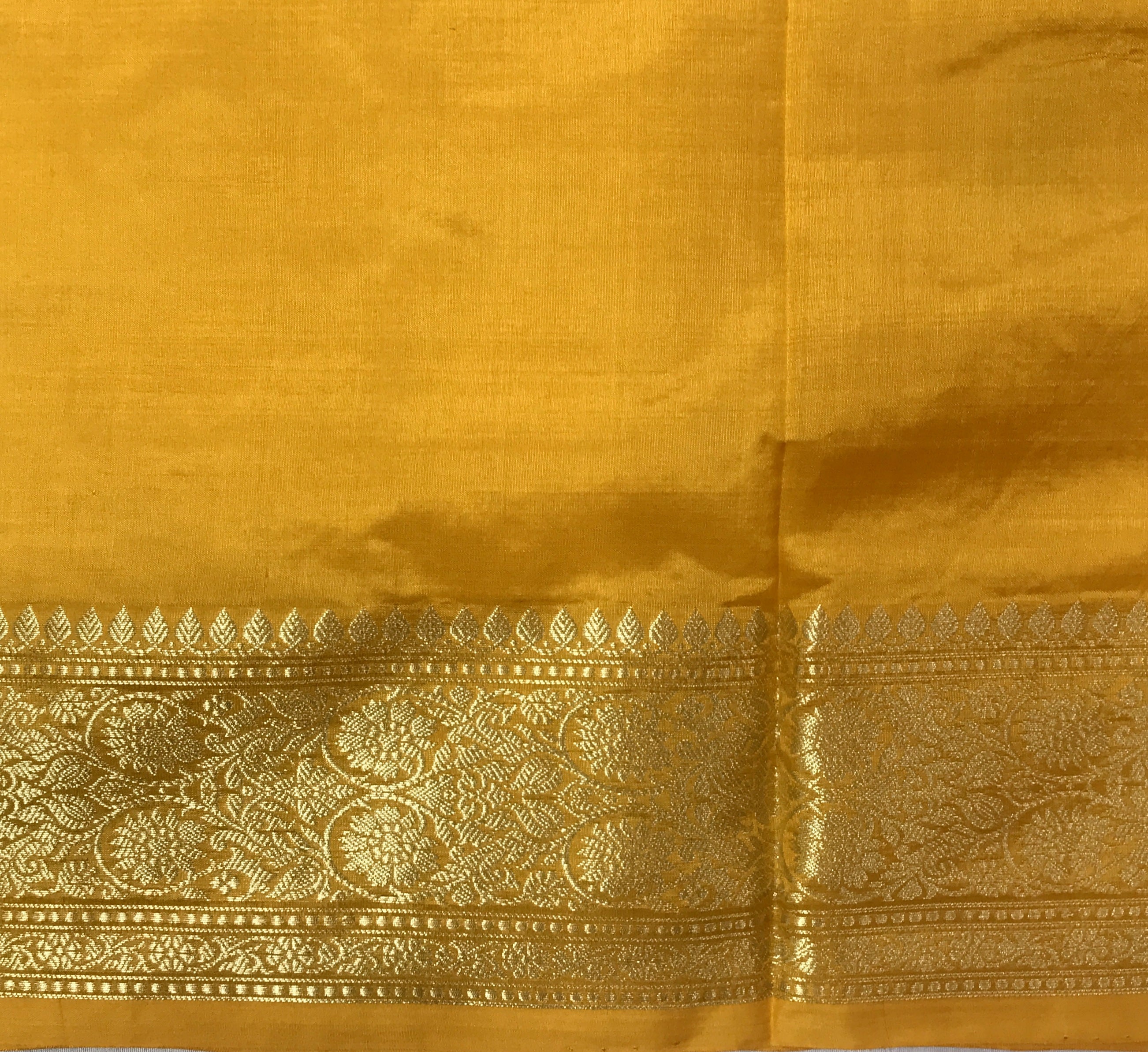 A very gorgeous shade of Mango yellow Banarasi with self coloured traditional border looks great! For the love of unusual colours, this Banarasi saree is definitely going to win your heart. This saree will look soothing and beautiful when draped! The golden zari border with dual butti golden-silver and pallu stands true to the Banarasi culture of saree weaving.