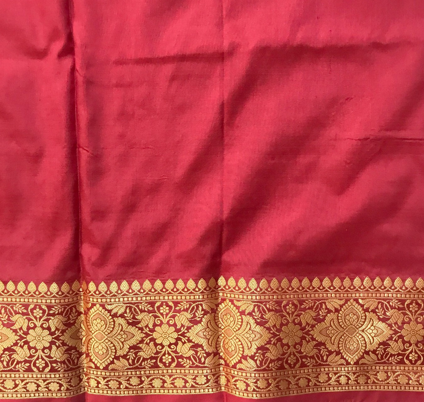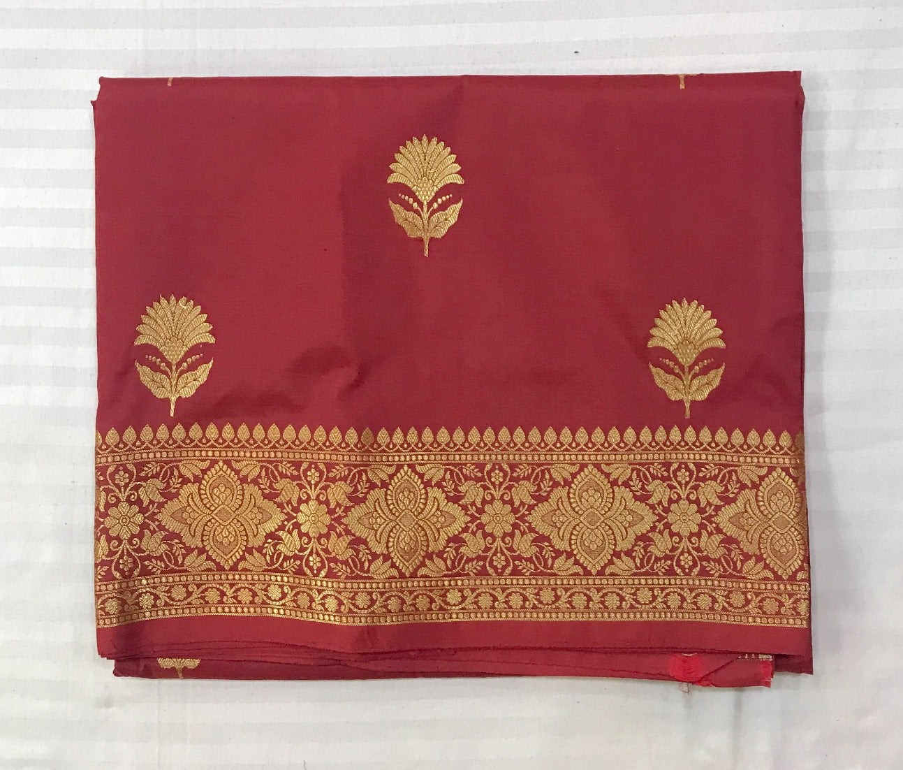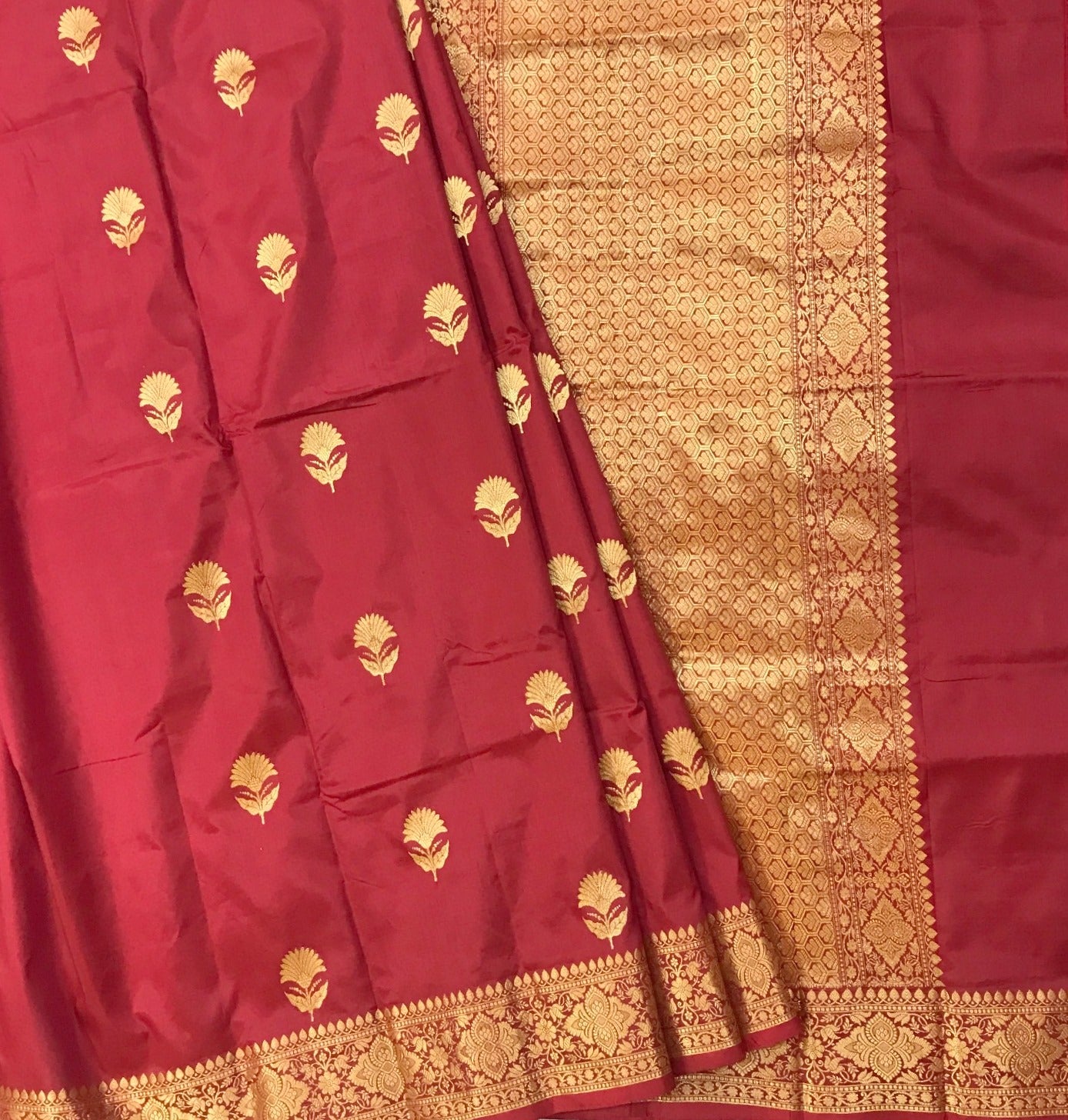A very gorgeous shade of maroon Banarasi with self coloured traditional border looks great! For the love of unusual colours, this Banarasi saree is definitely going to win your heart. This saree will look soothing and beautiful when draped! The golden zari border and pallu stands true to the Banarasi culture of saree weaving.