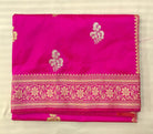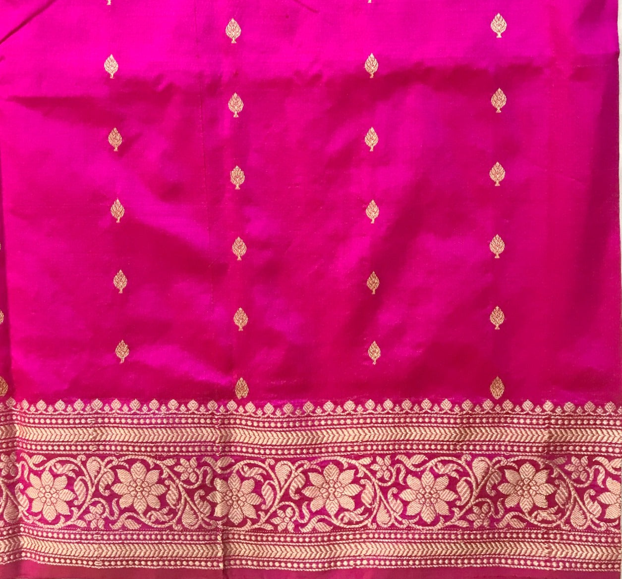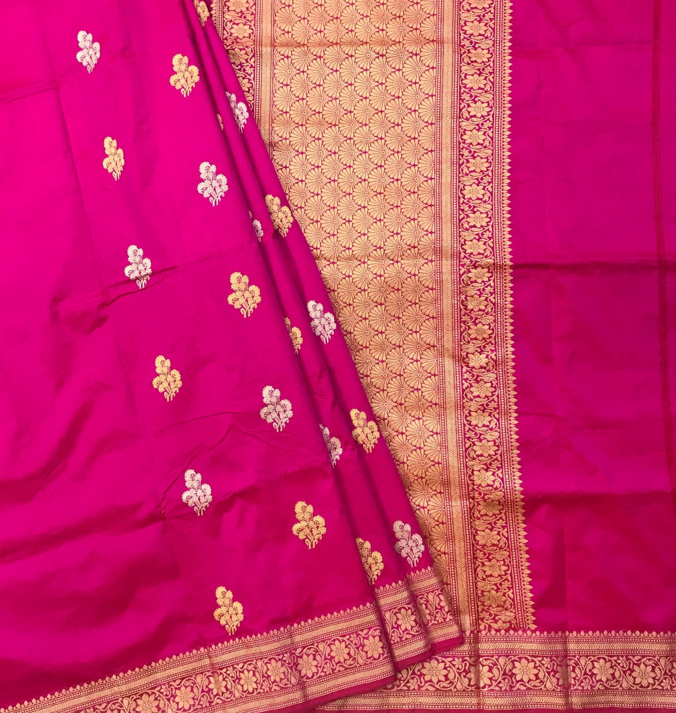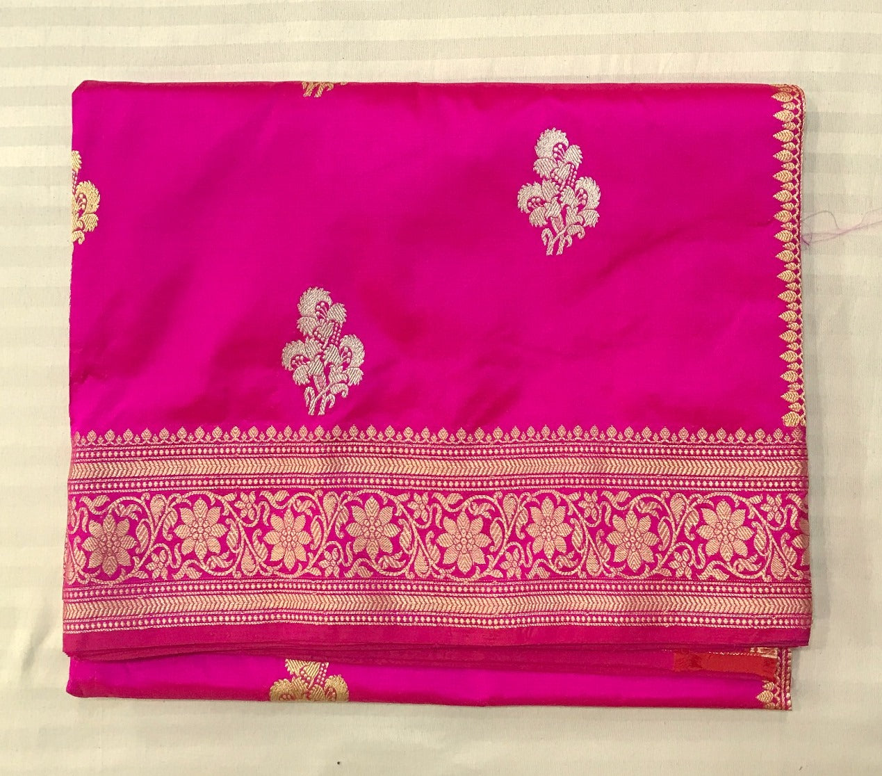 A very gorgeous shade of Pink Banarasi with self coloured traditional border looks great! For the love of unusual colours, this Banarasi saree is definitely going to win your heart. This saree will look soothing and beautiful when draped! The golden zari border and pallu stands true to the Banarasi culture of saree weaving.