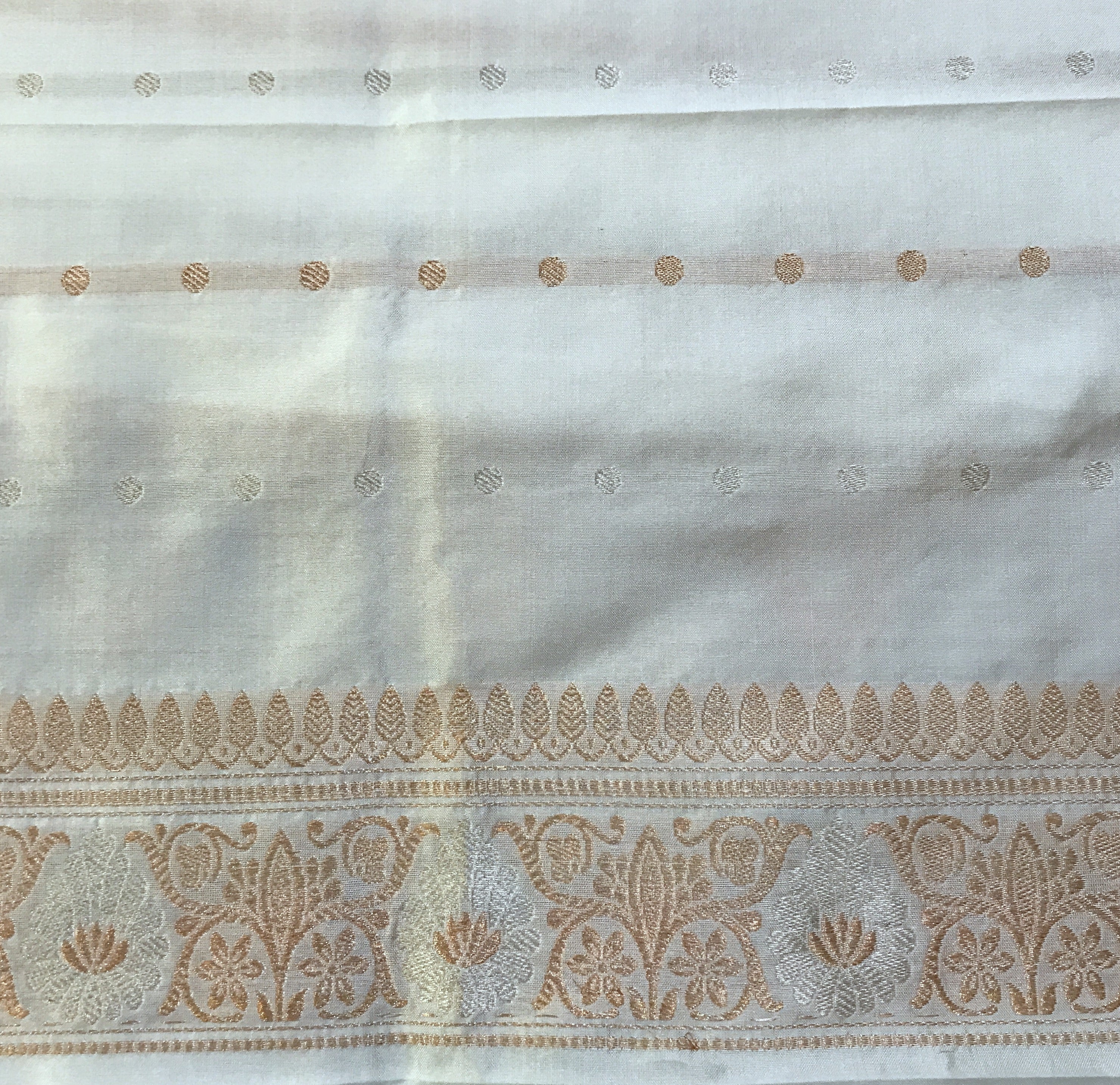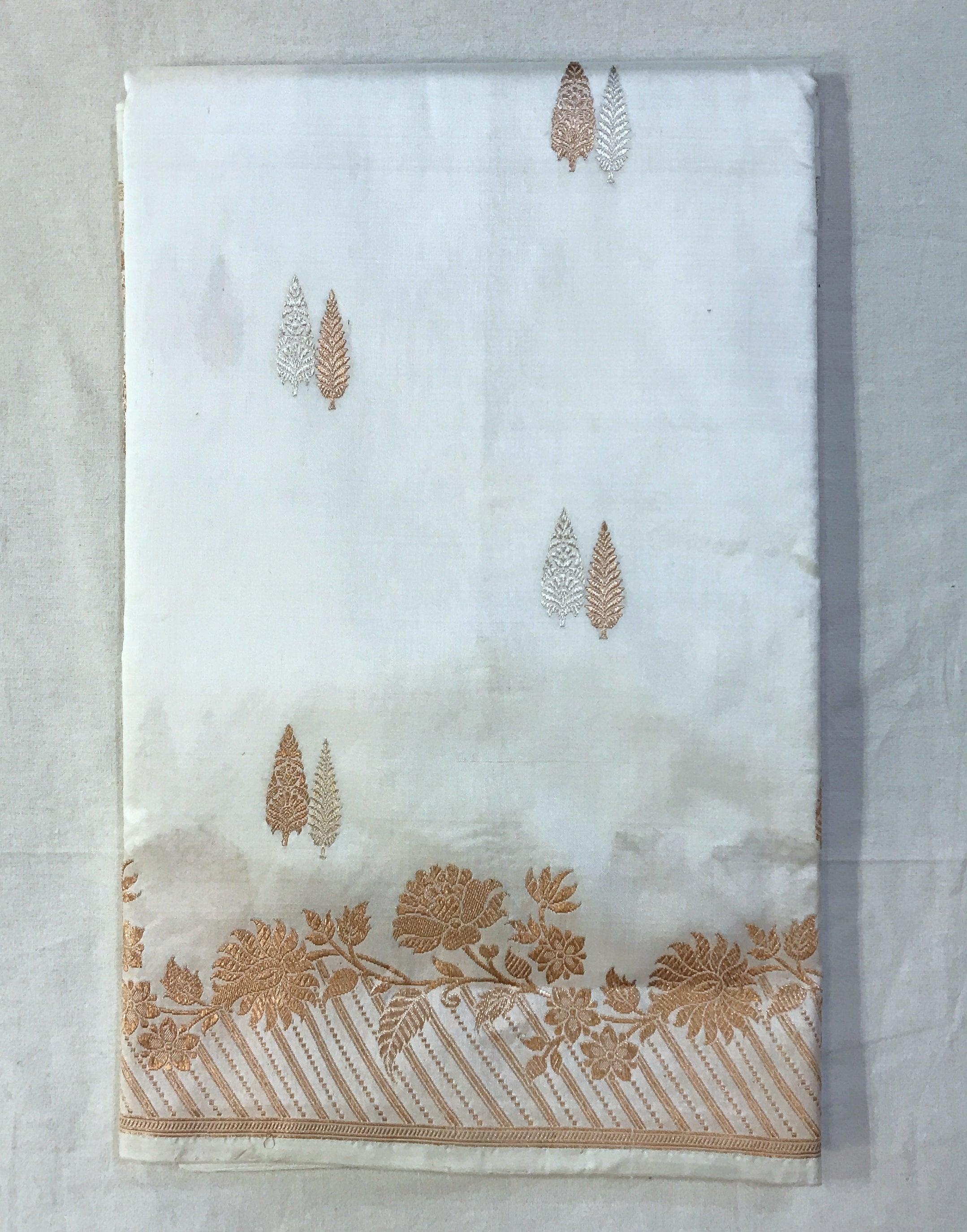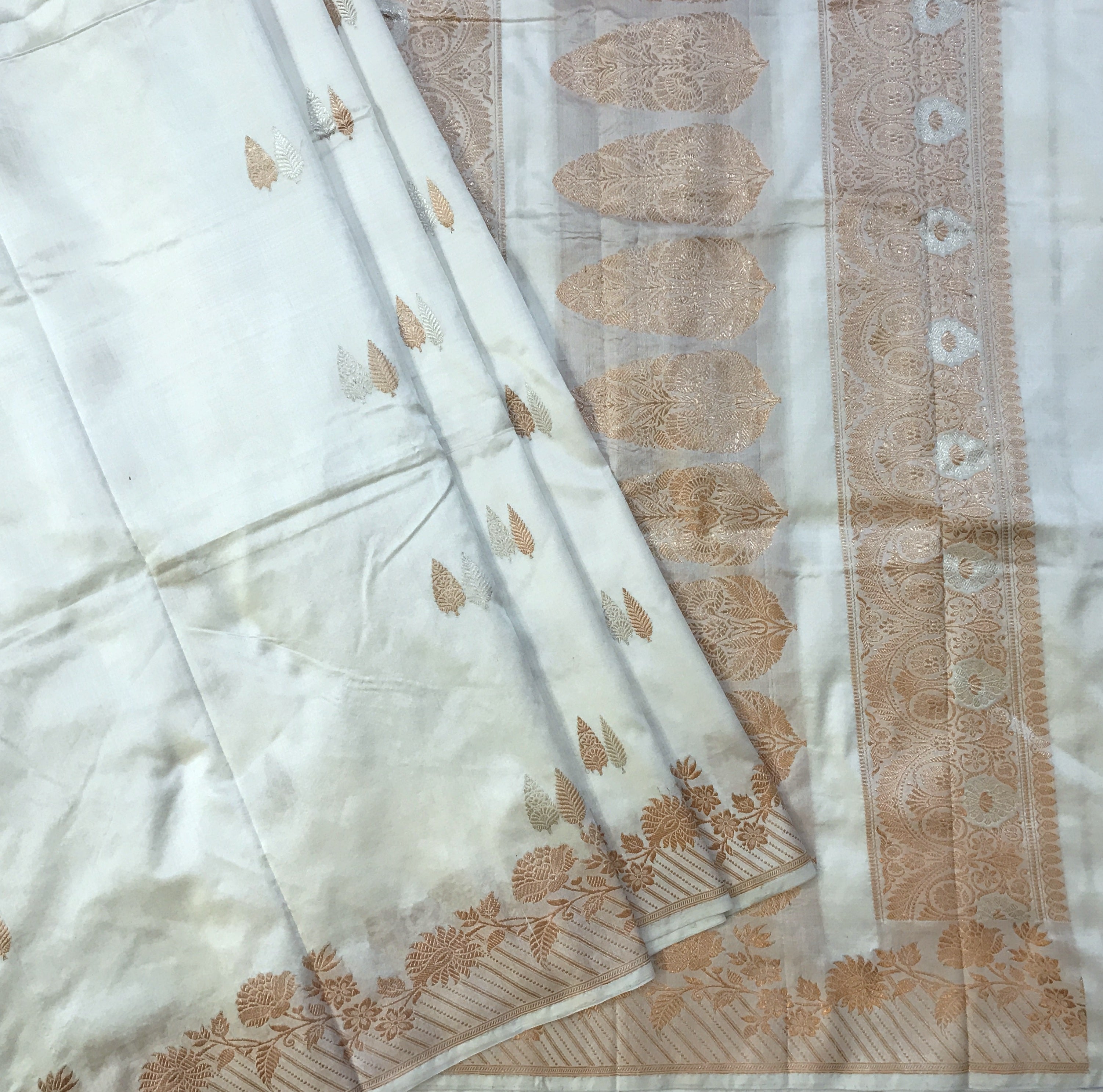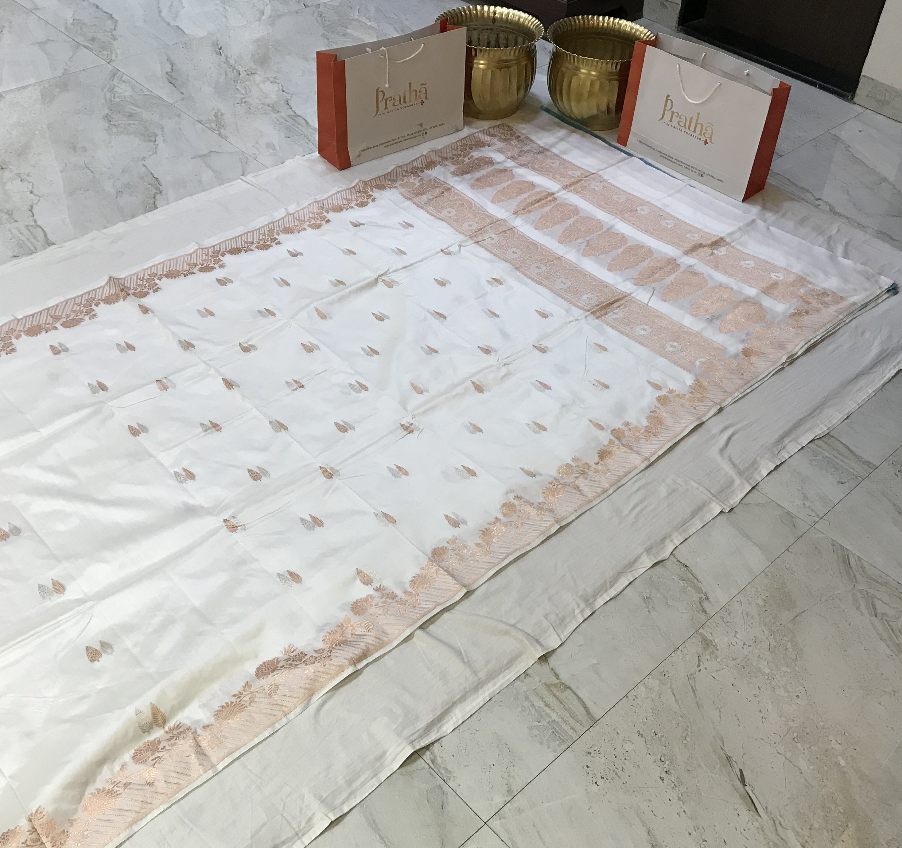 This is an incredible white pure Kataan silk handwoven Banarasi saree is the perfect festive wear! The colour combination makes it a very unique weave. The most beautiful shade of white when teamed up with copperish zari border, makes for a stunning saree! The zari is also not the typical gold coloured zari, it has a unique copper tinge.