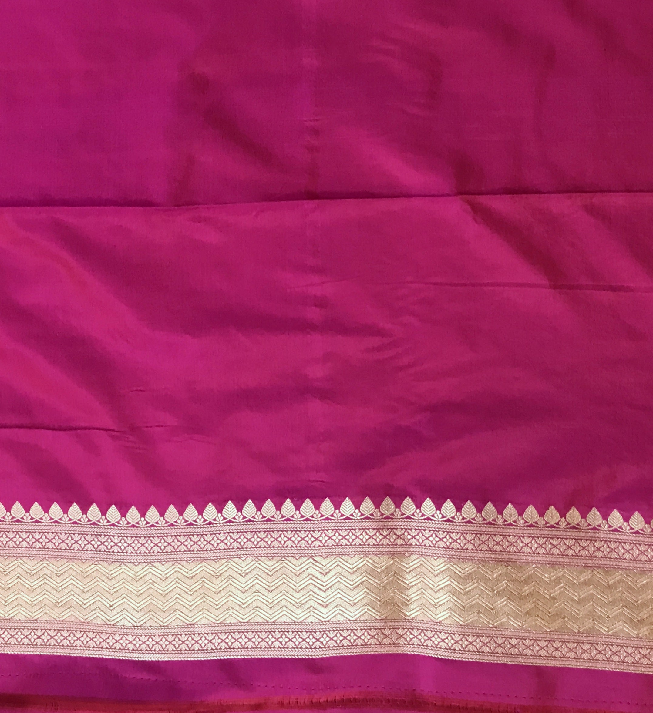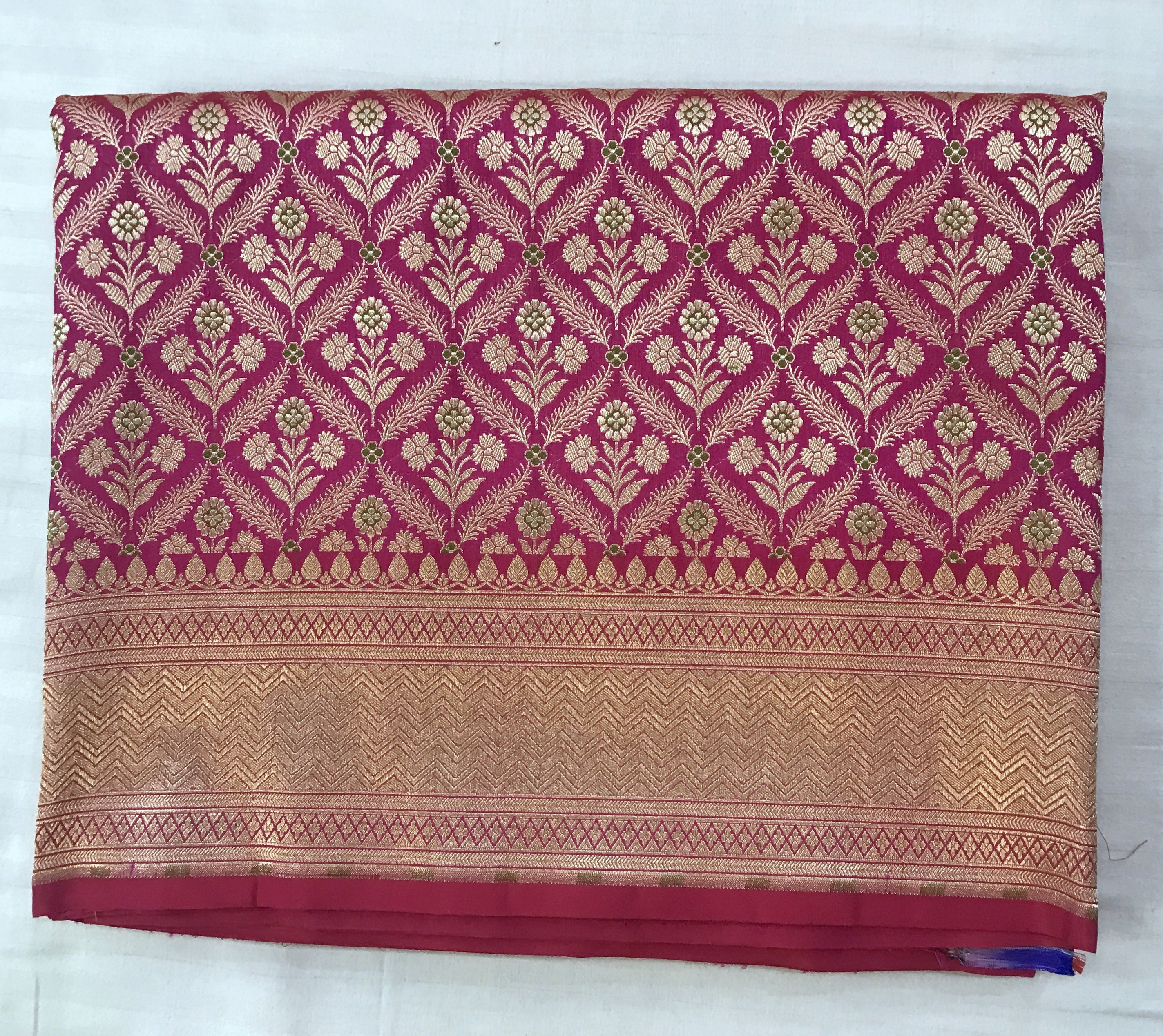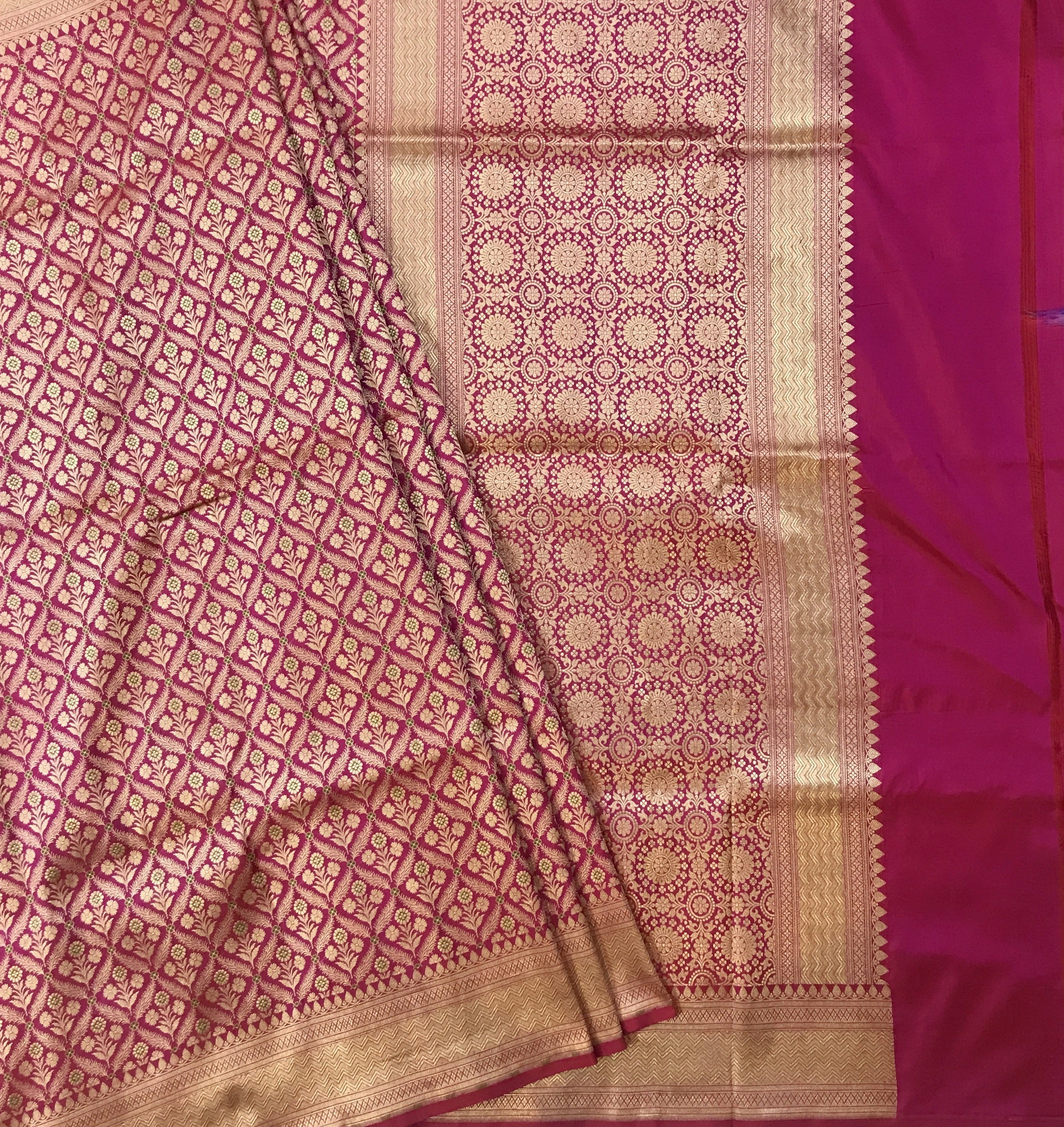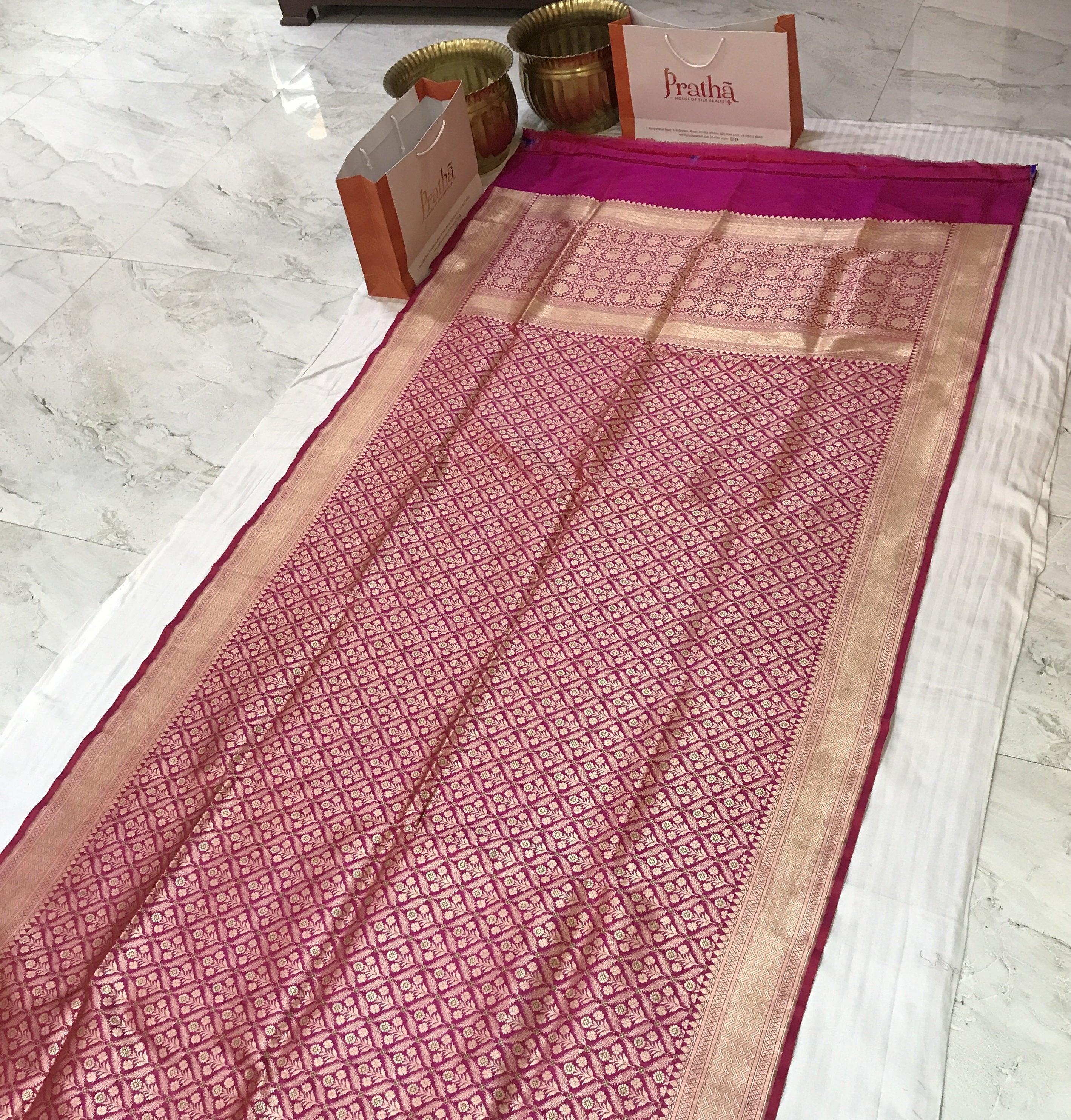 That's a beautiful pink Brocade Banarasi with as charming brocade design woven in golden zari as it's pallu. This pure silk handwoven Banarasi beauty is a 'Pratha limited edition' weave. Woven in different and unique pattern throughout its body, using a golden zari thread with the finest interlocking technique, this saree is sure to turn a few heads! This one is specially for those who love to wear pink sarees and are looking for a unique one. The pure katan silk and the fine quality of zari help this saree being draped beautifully and with ease.