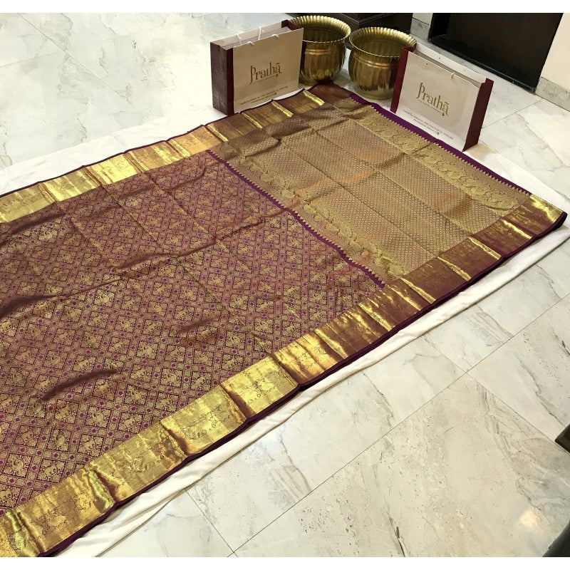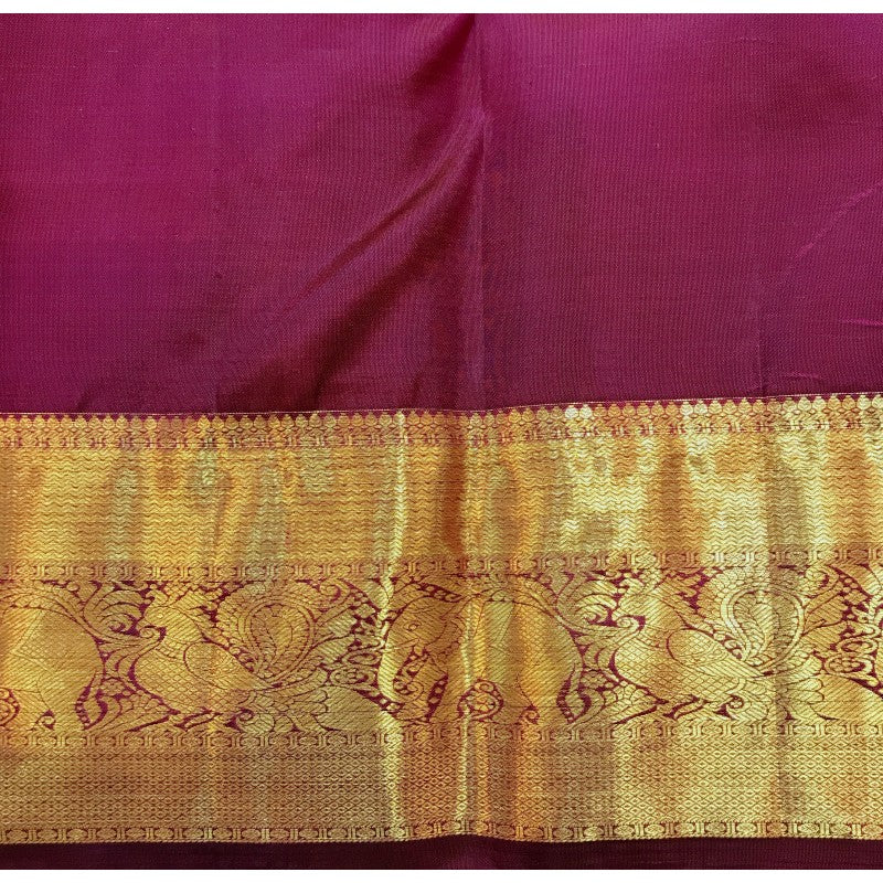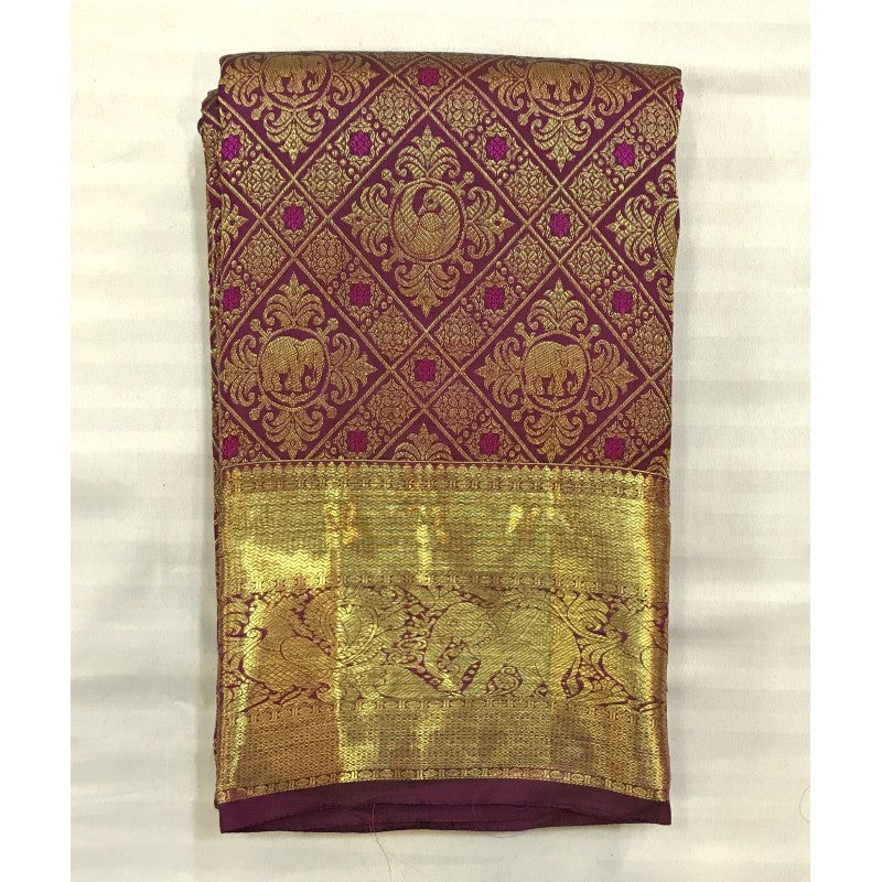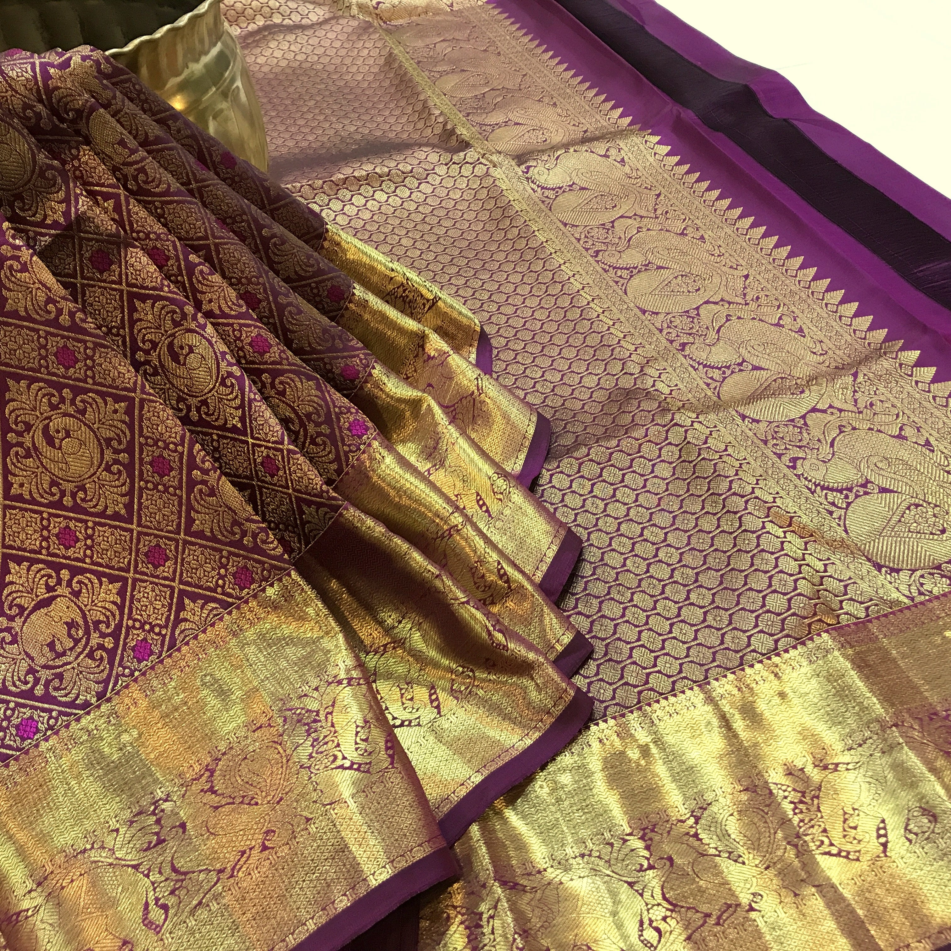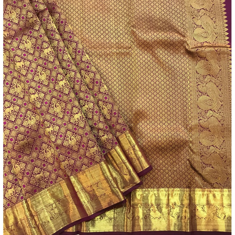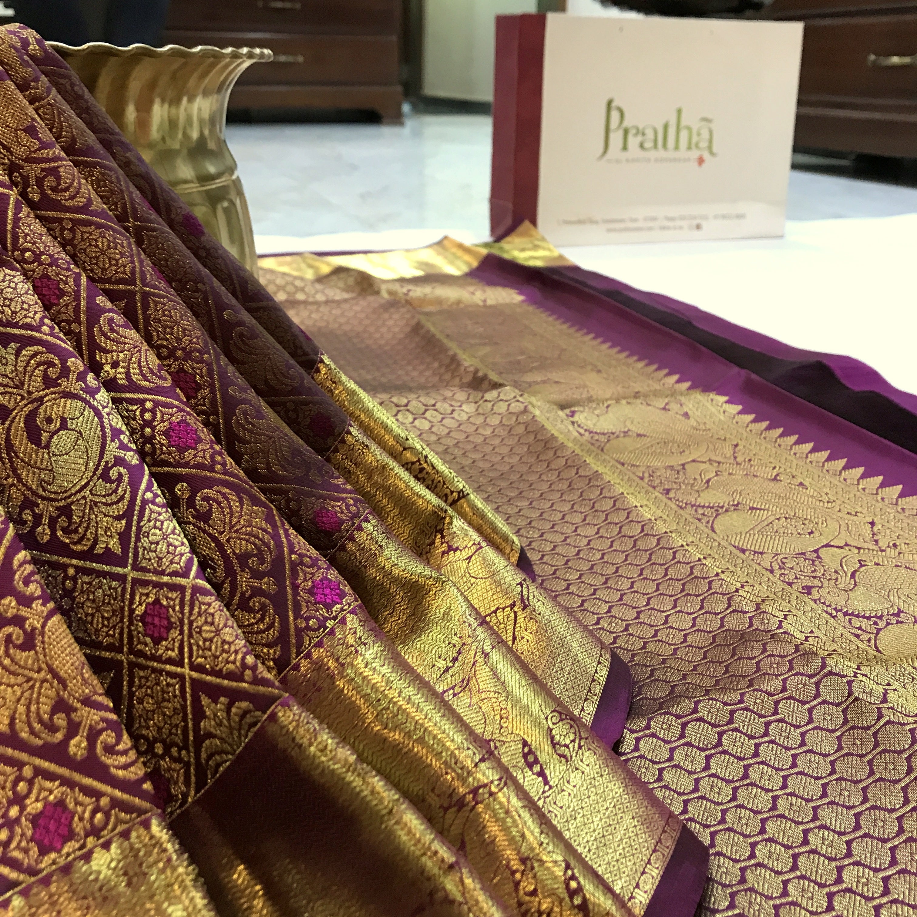 This is a superb magenta ( purple ) Brocade Kanjeevaram. The golden zari brocade design in the form of diamond shaped peacock- elephant motifs that run through the saree along with the zari border are the highlight of this weave! Its the perfect festive wear. Do not miss the royal looking pallu of this saree which is woven to perfection! This pure zari Kanjeevaram is definitely a pride of Pratha!