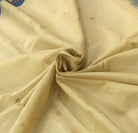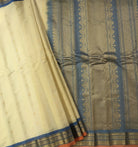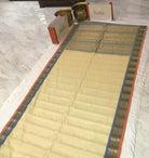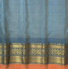 This elegant cotton Gadwal saree beautifully blends tradition and charm with its soothing off-white body adorned with delicate golden buttas. The highlight lies in its stunning contrast blue border and pallu, richly woven with classic floral and paisley motifs in lustrous zari, showcasing the authentic craftsmanship Gadhwal sarees are known for. The intricate geometric patterns and traditional paisley designs on the pallu add a regal touch, making this saree perfect for festive occasions and graceful everyday elegance. The vibrant contrast and lightweight drape make it a timeless, effortless statement piece.