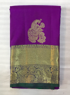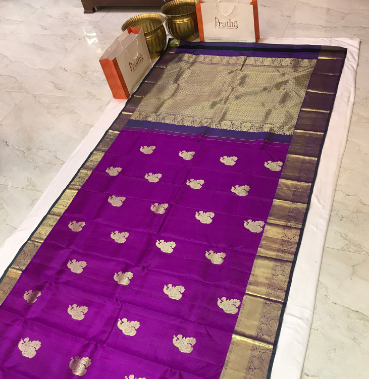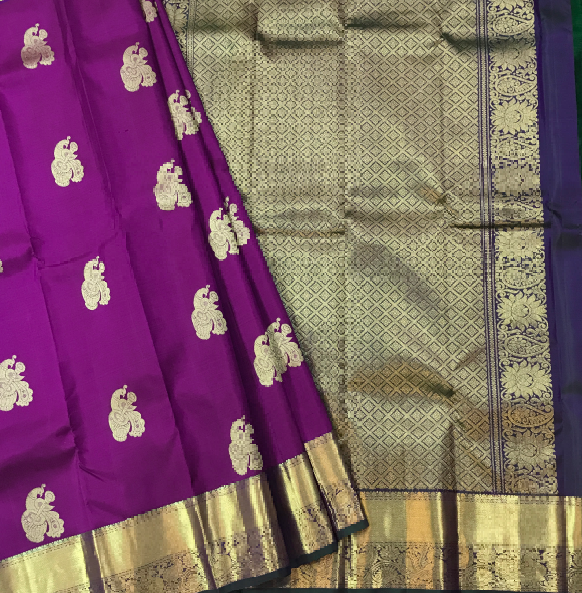 This regal Kanjeevaram silk saree in a vibrant shade of magenta is an absolute showstopper! The sleek body is adorned with elegant golden peacock zari buttas, giving it a rich and graceful appeal. The saree is further enhanced with a striking pallu in gold, intricately woven with traditional peacock motifs and geometric zari patterns, adding depth and grandeur. The broad golden border, highlighted with delicate weaving, elevates its splendor, making this piece ideal for weddings, festivities, and grand celebrations. Traditional, timeless, and luxurious this saree is truly a masterpiece!