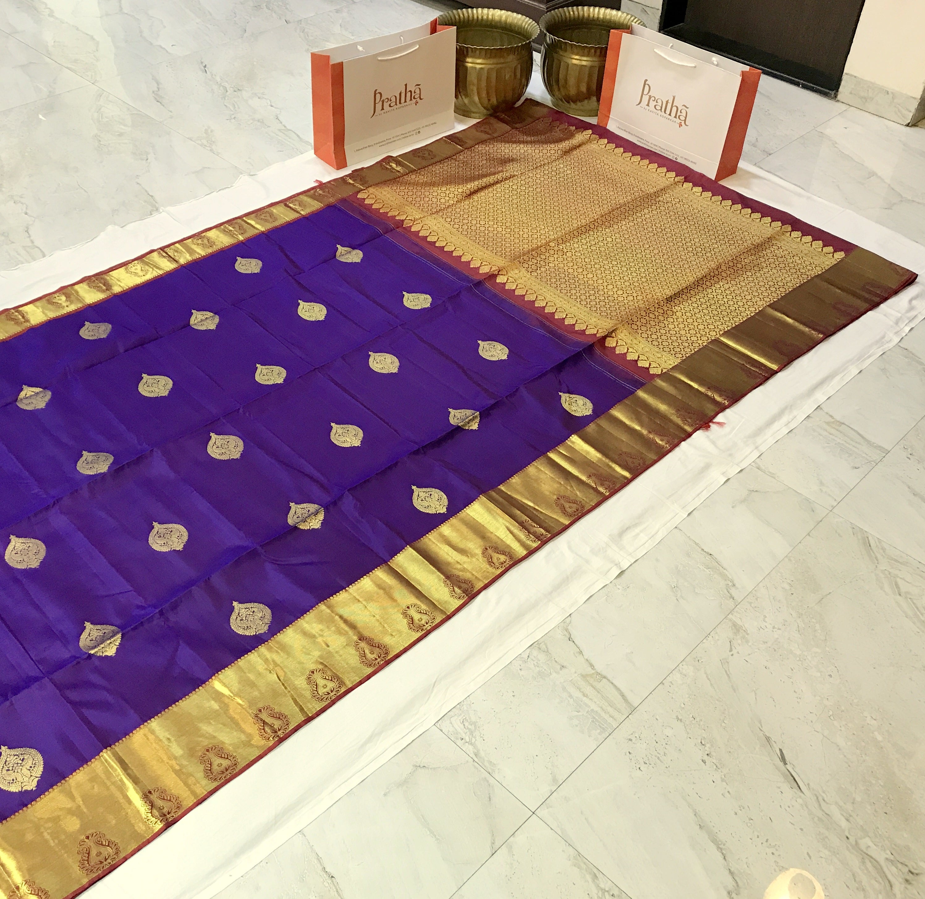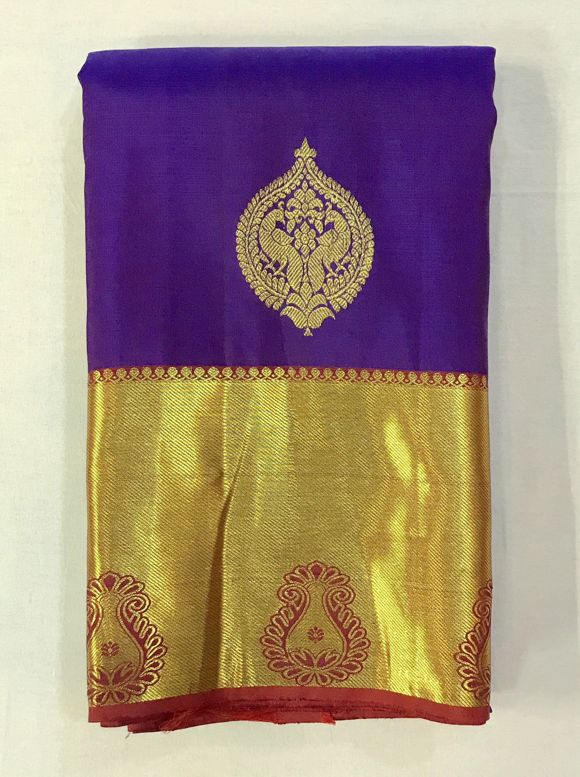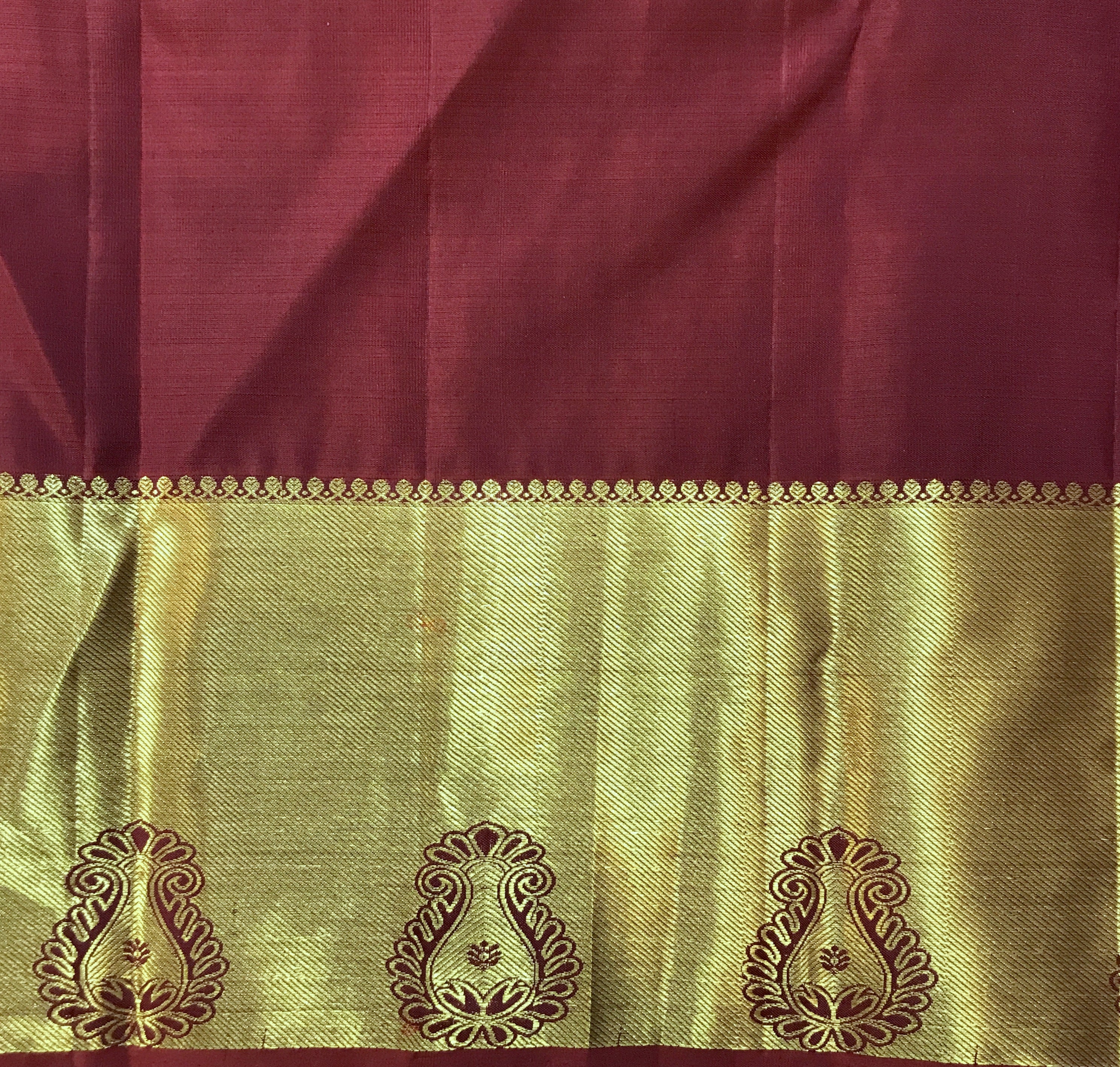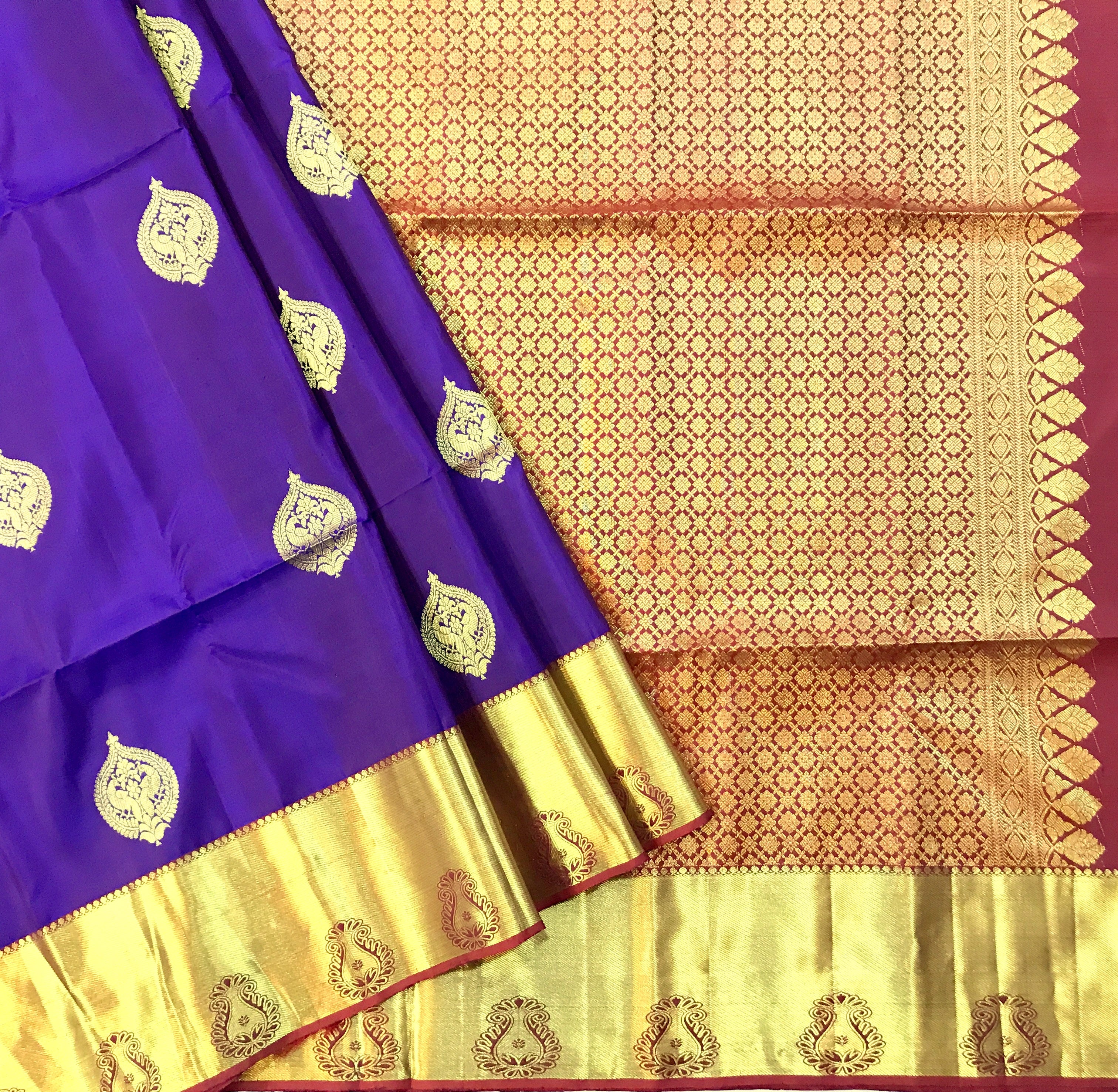 A beautiful rotating shade of magenta-purple and contrast maroon coloured golden zari border pure silk handwoven Kanjeevaram looks great, this one is lustrous and perfectly traditional. The intricate leaf shaped butti woven in golden zari and golden zari border with richly woven zari pallu make this weave a classic! This Kanjeevaram will look great in the day as well as at night!