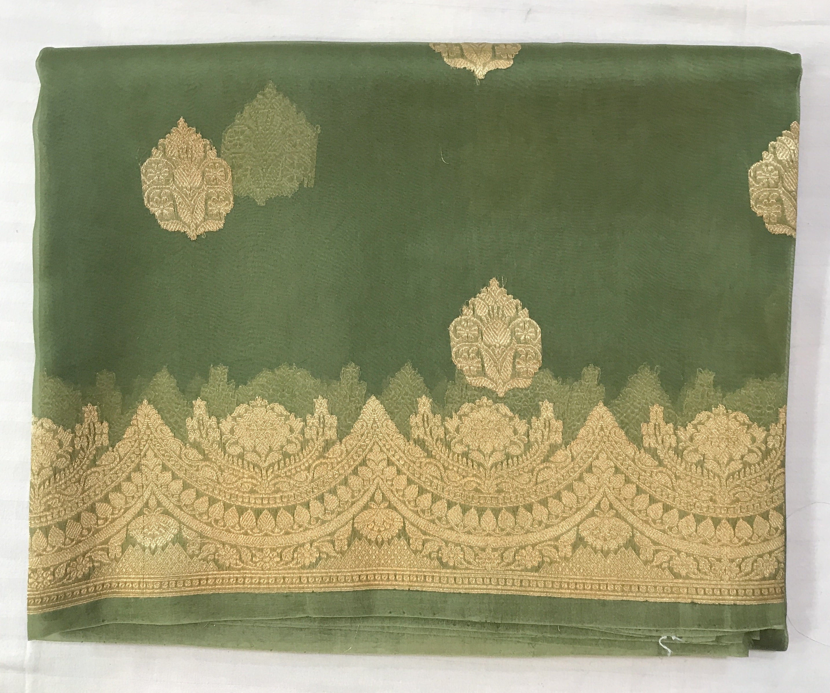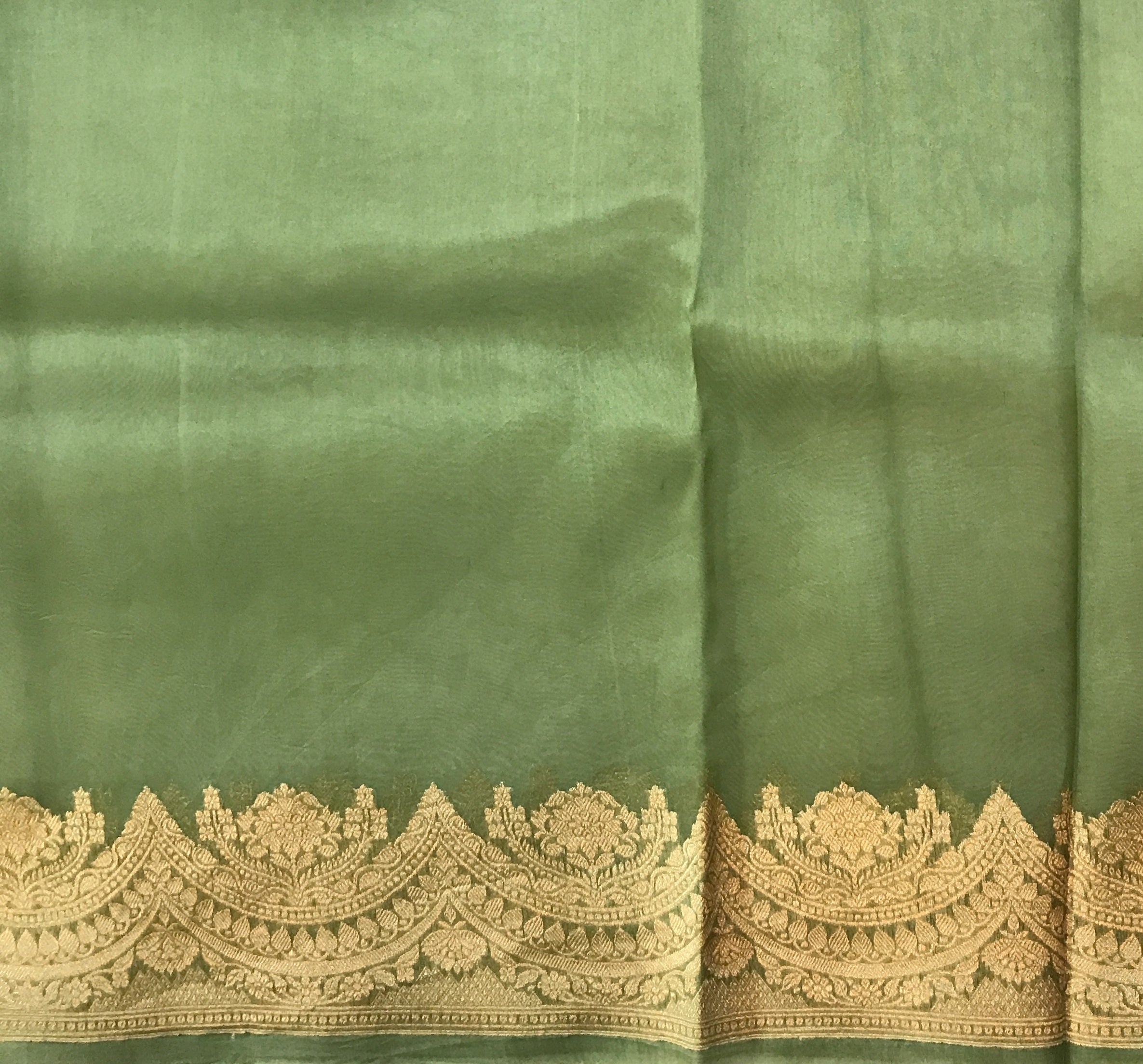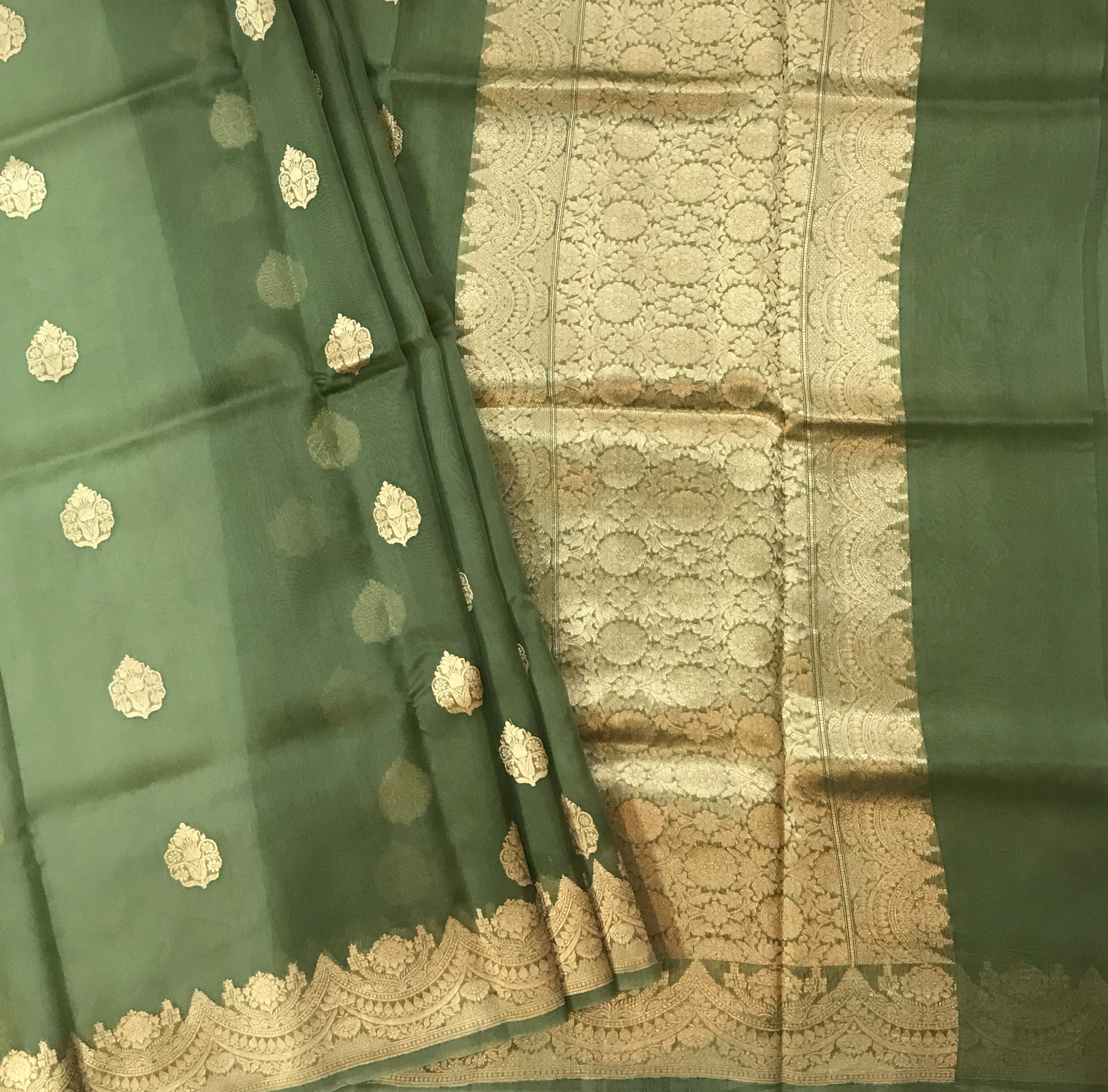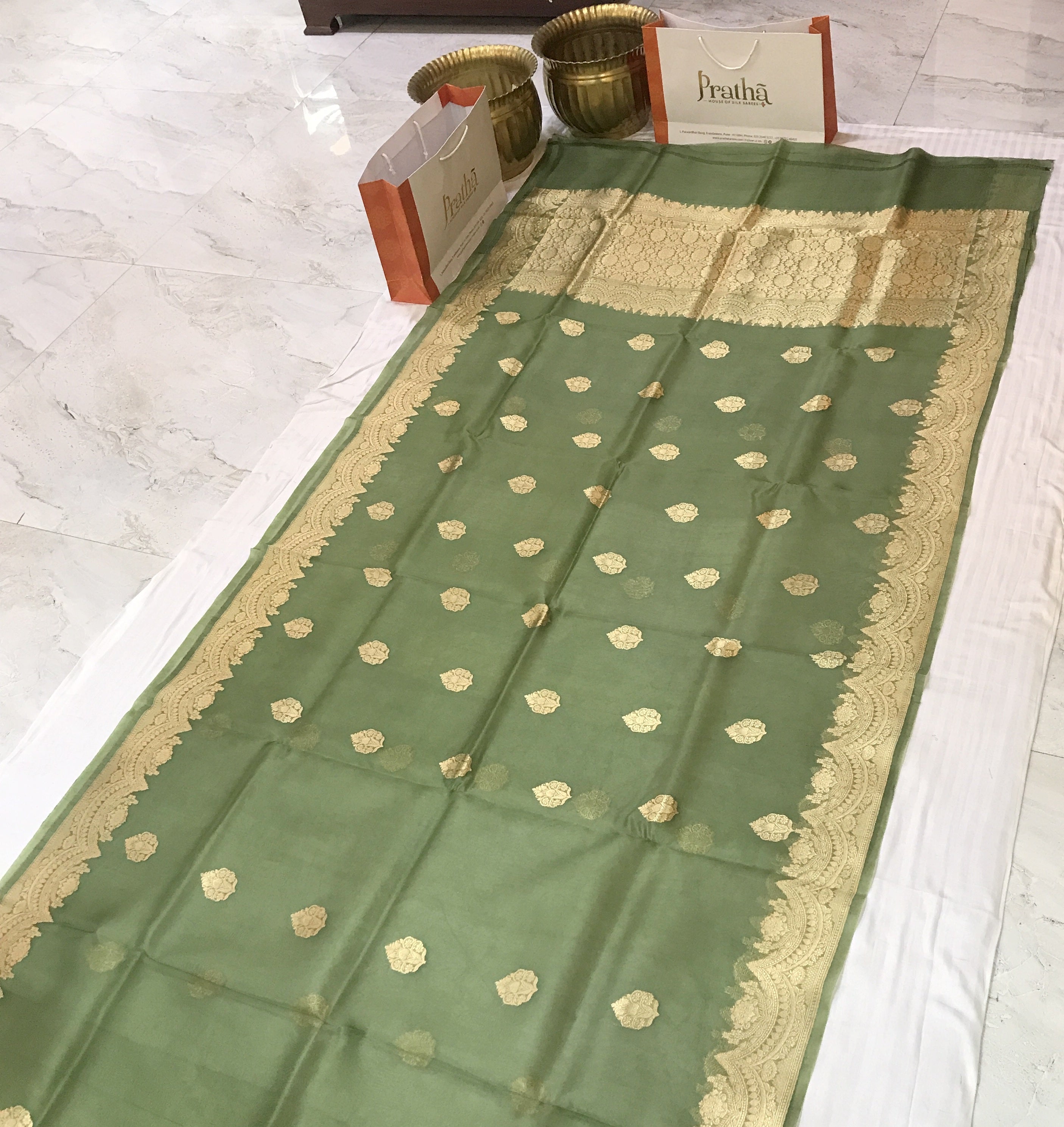 This green Kora Banarasi saree exudes elegance with its exquisite golden zari work. The luxurious fabric, akin to organza silk. Adding to its charm, the saree is adorned with grand golden zari buttis, creating a regal appeal. The highlight of this masterpiece is its breathtaking pallu, embellished with an intricate design that enhances its timeless beauty. A richly woven floral zari border lends the saree a splendid wedding and festive allure, while the classic Banarasi golden hue on the border adds an element of sophistication.