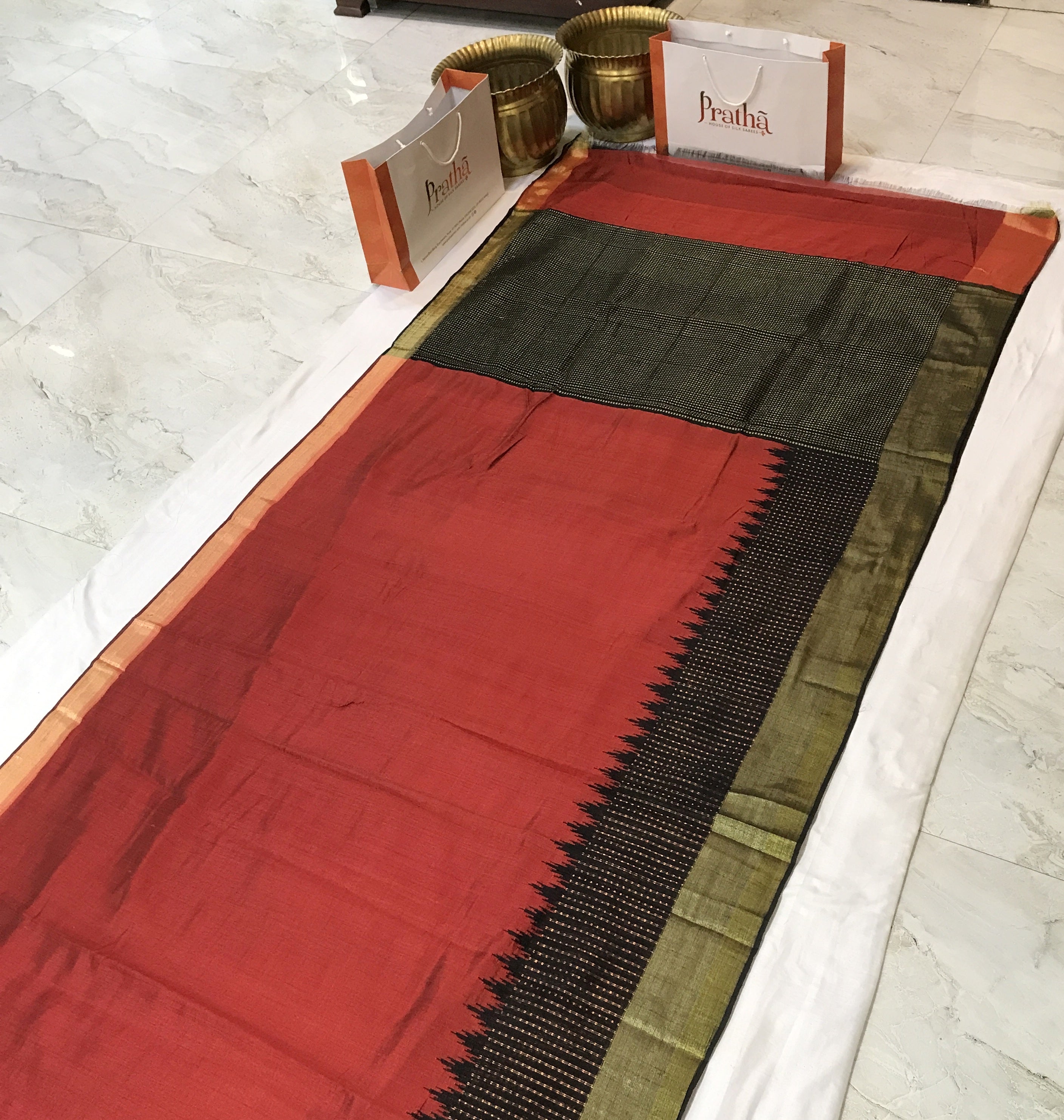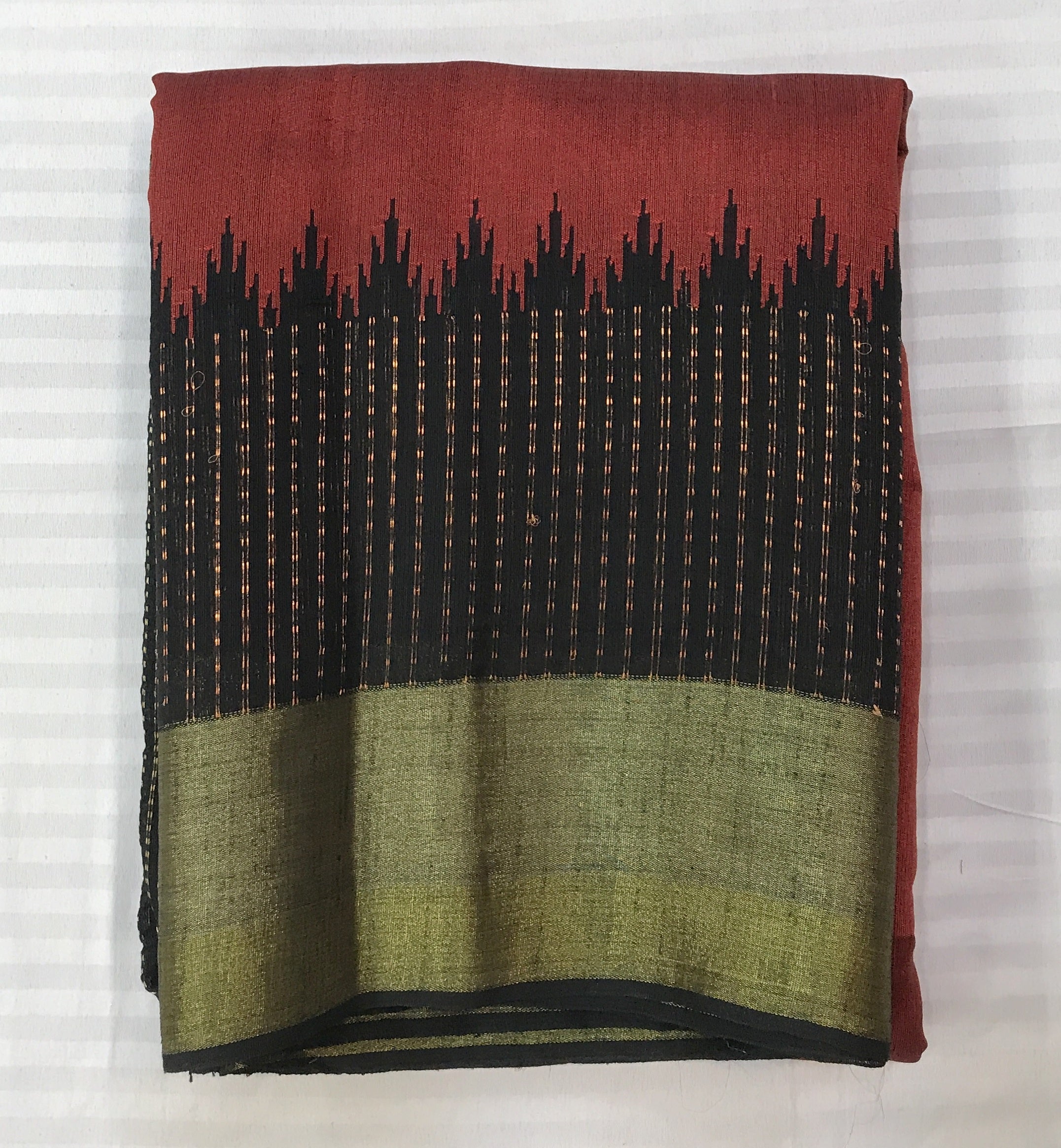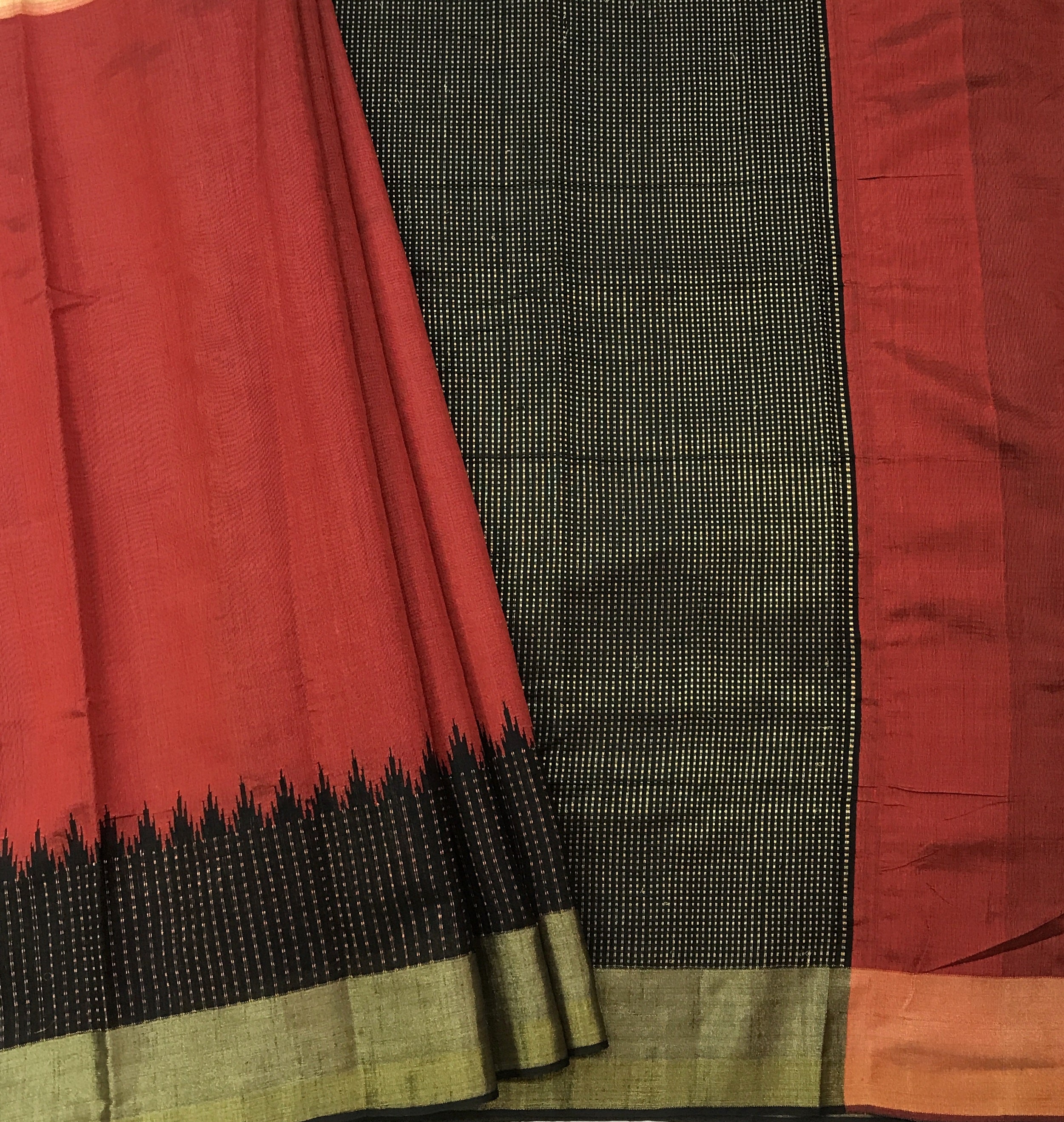 This graceful Kosa silk saree features a serene brick red body with a soft natural sheen, beautifully contrasted by a rich black pallu showcasing traditional temple design border with subtle hints of goden zari, while the saree is finished with a coordinated black border detailed with geometric and woven accents, creating a timeless blend of elegance and heritage ideal for festive and cultural occasions.