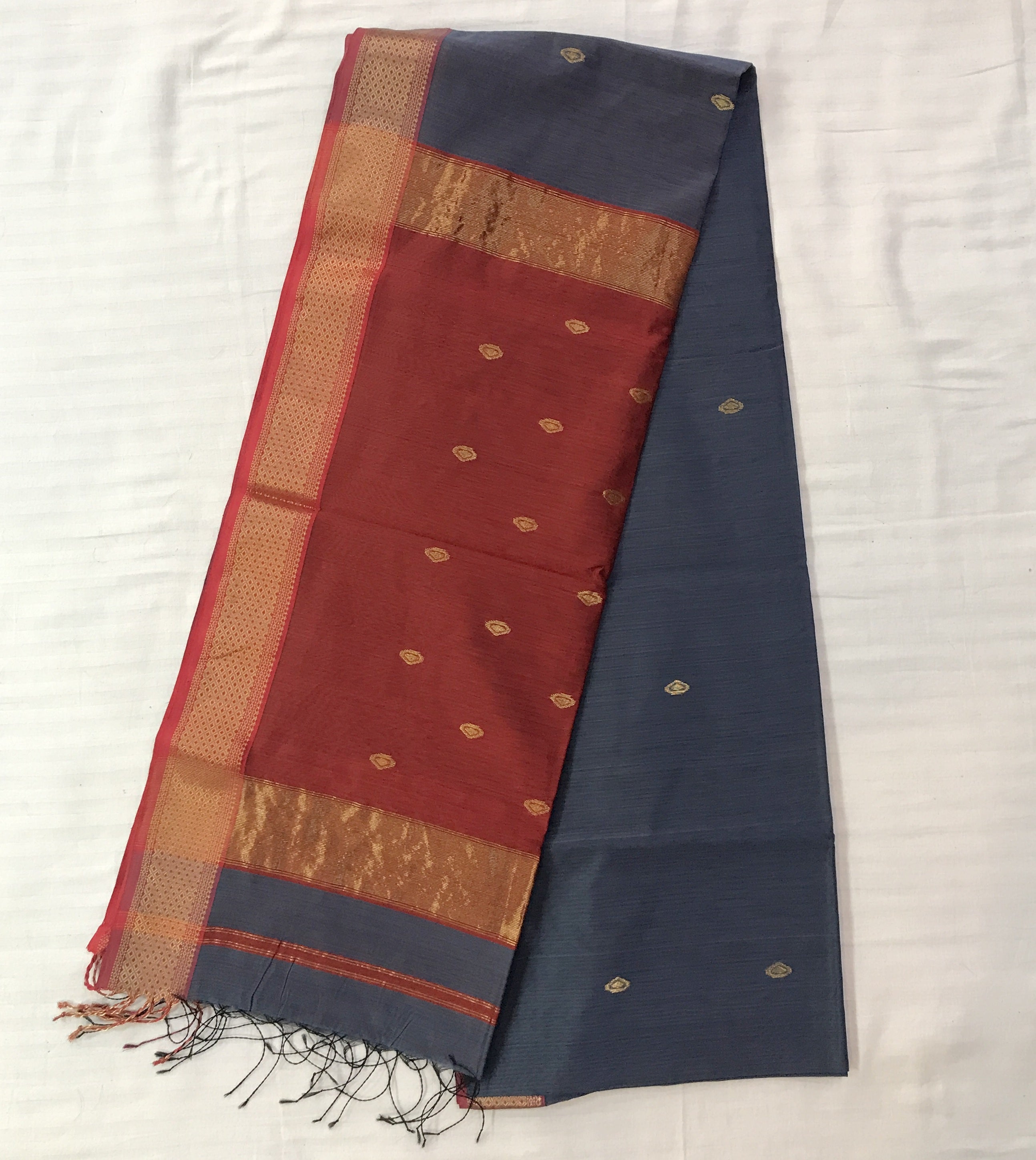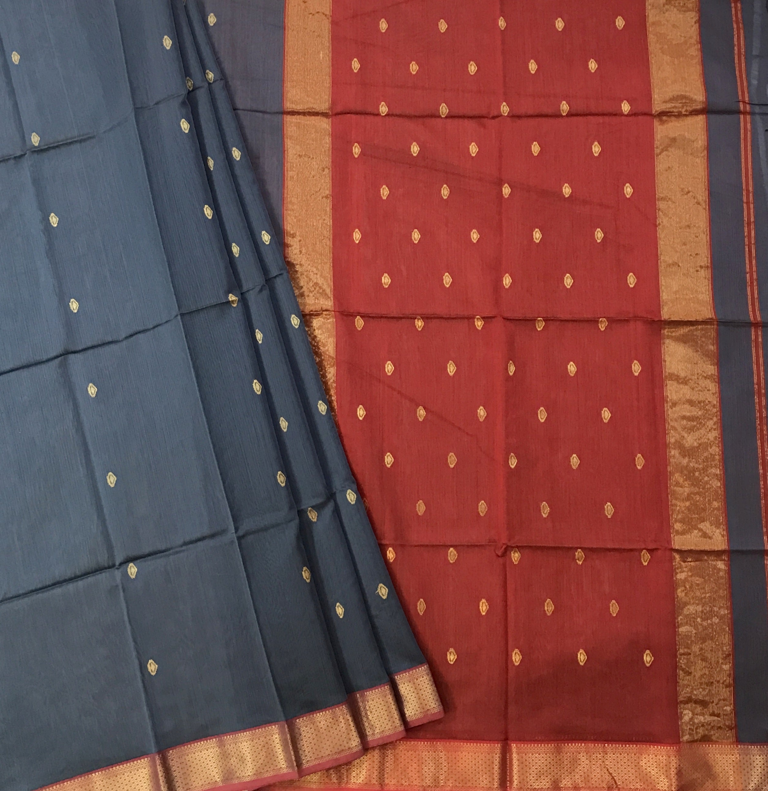 This beautiful Maheshwari saree brings together an elegant dual-tone charm with its striking combination of deep blue and rich rust. The body features delicately woven golden buttis that add a subtle sparkle without overwhelming the graceful drape. The contrasting rust pallu, highlighted with intricate golden zari work, enhances its traditional appeal and makes it perfect for festive and special occasions. Lightweight, classy, and artfully crafted, this saree is a timeless addition to any wardrobe.