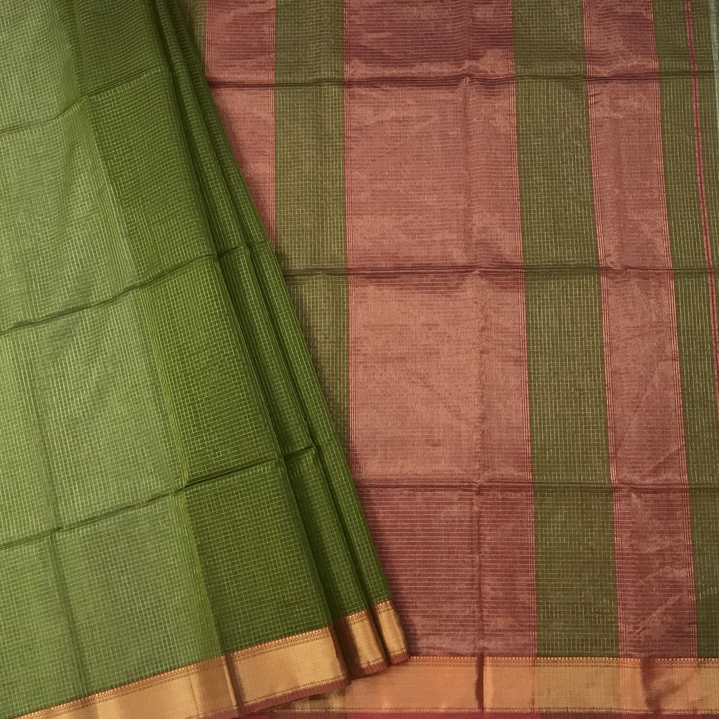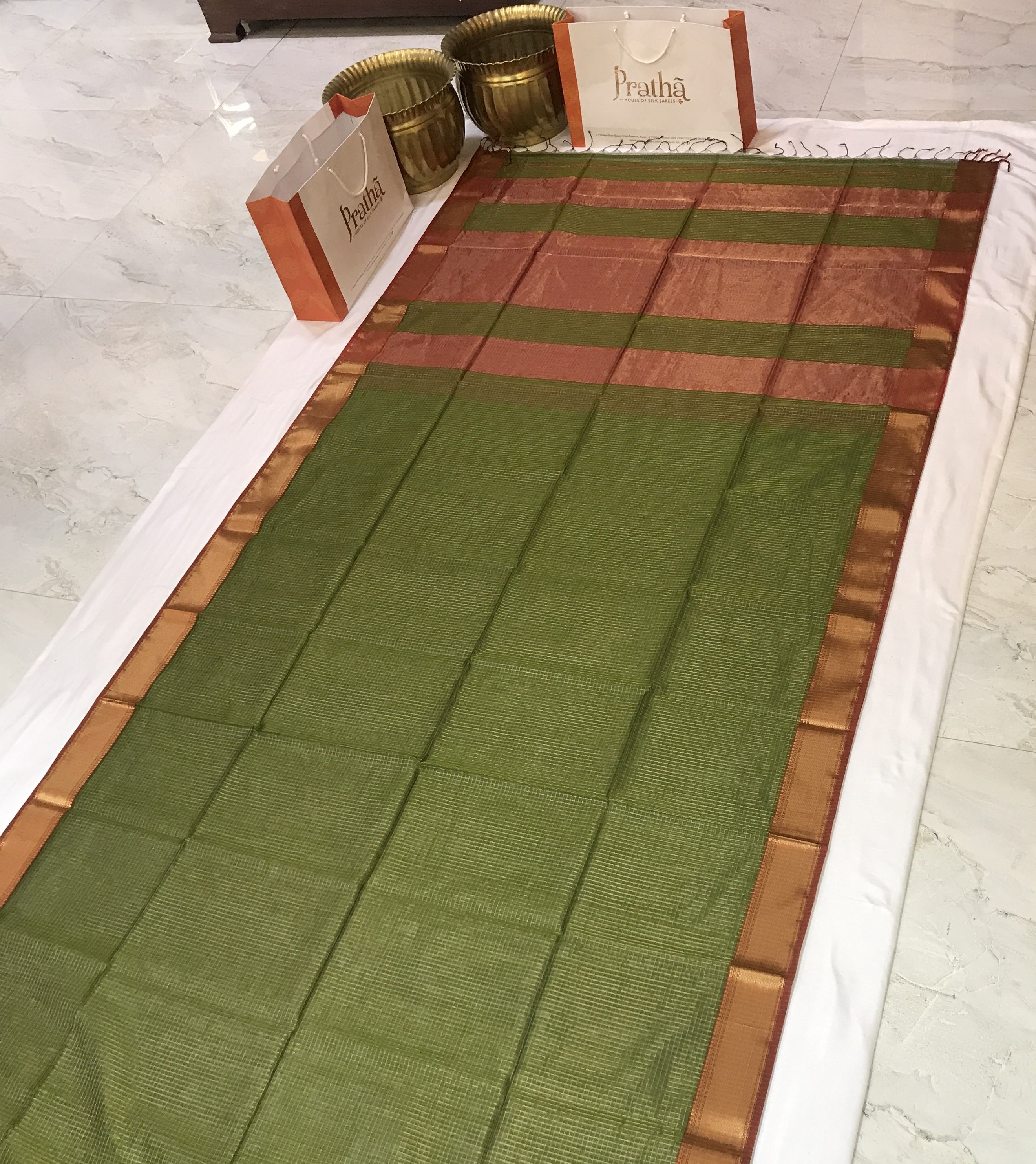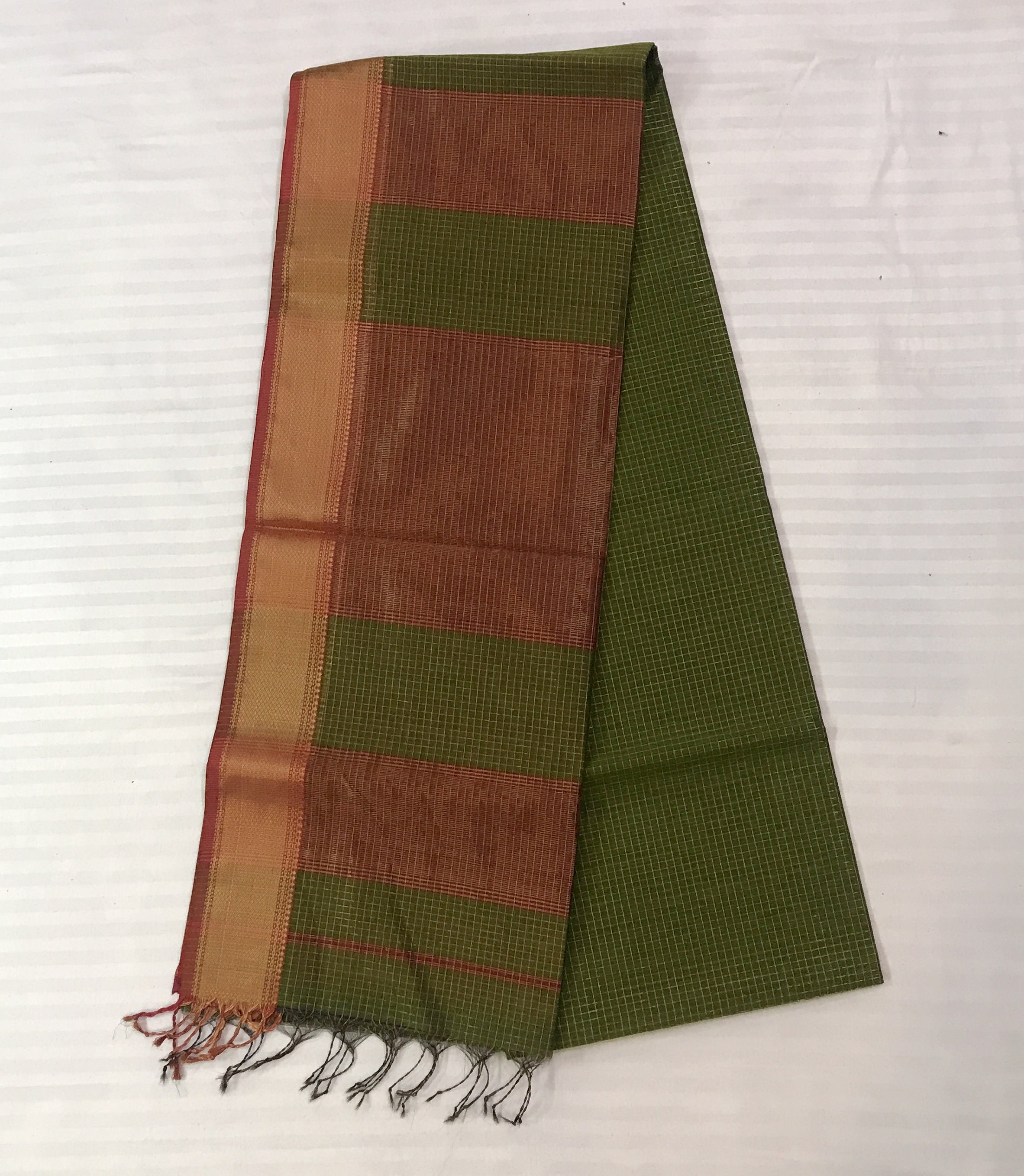 A Maheshwari saree with checks design in green is a lightweight, handwoven saree. It features a green base with elegant checks patterns woven across the body. Known for its smooth texture and graceful fall, it often comes with zari borders, making it perfect for both festive and casual wear.