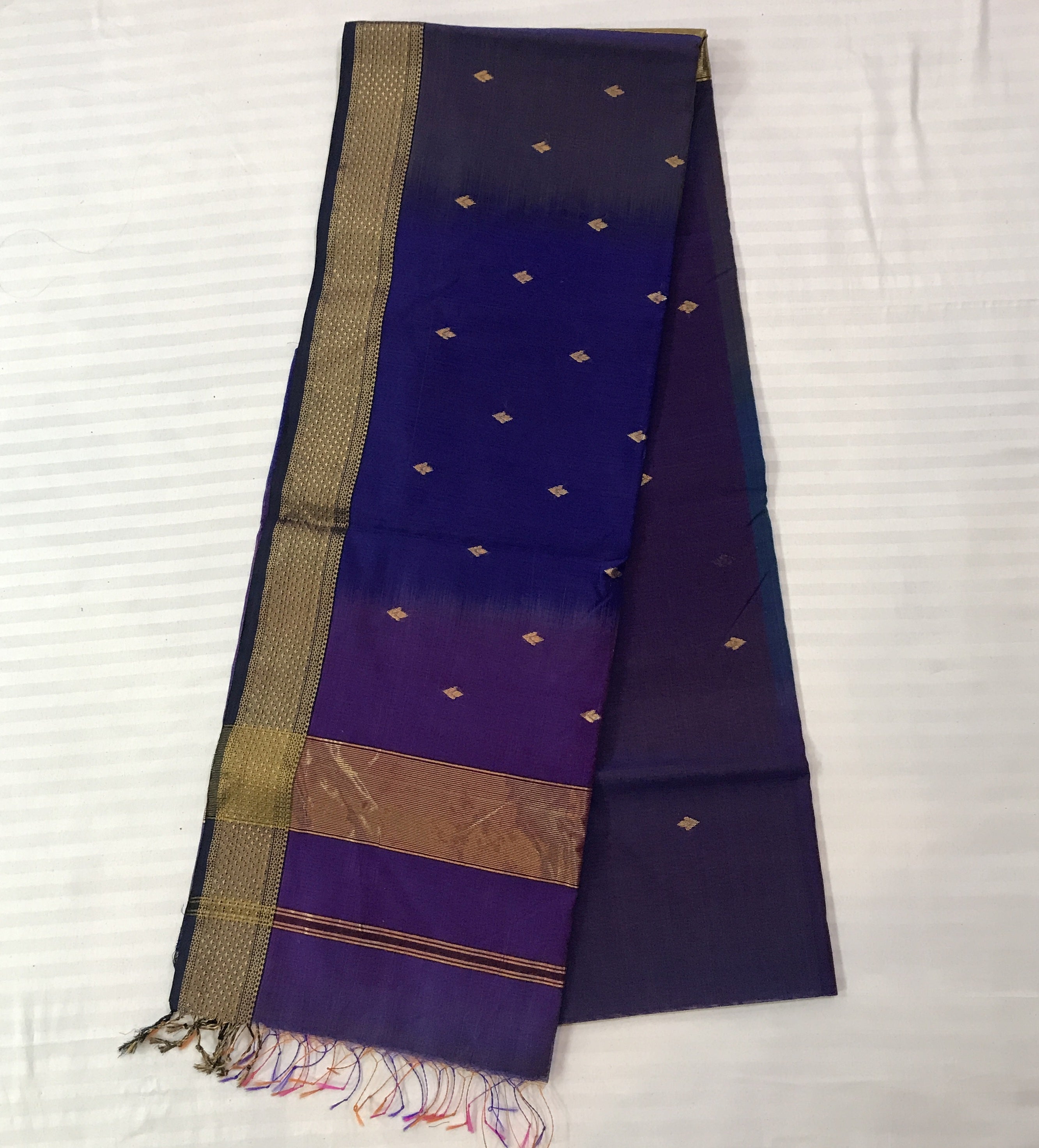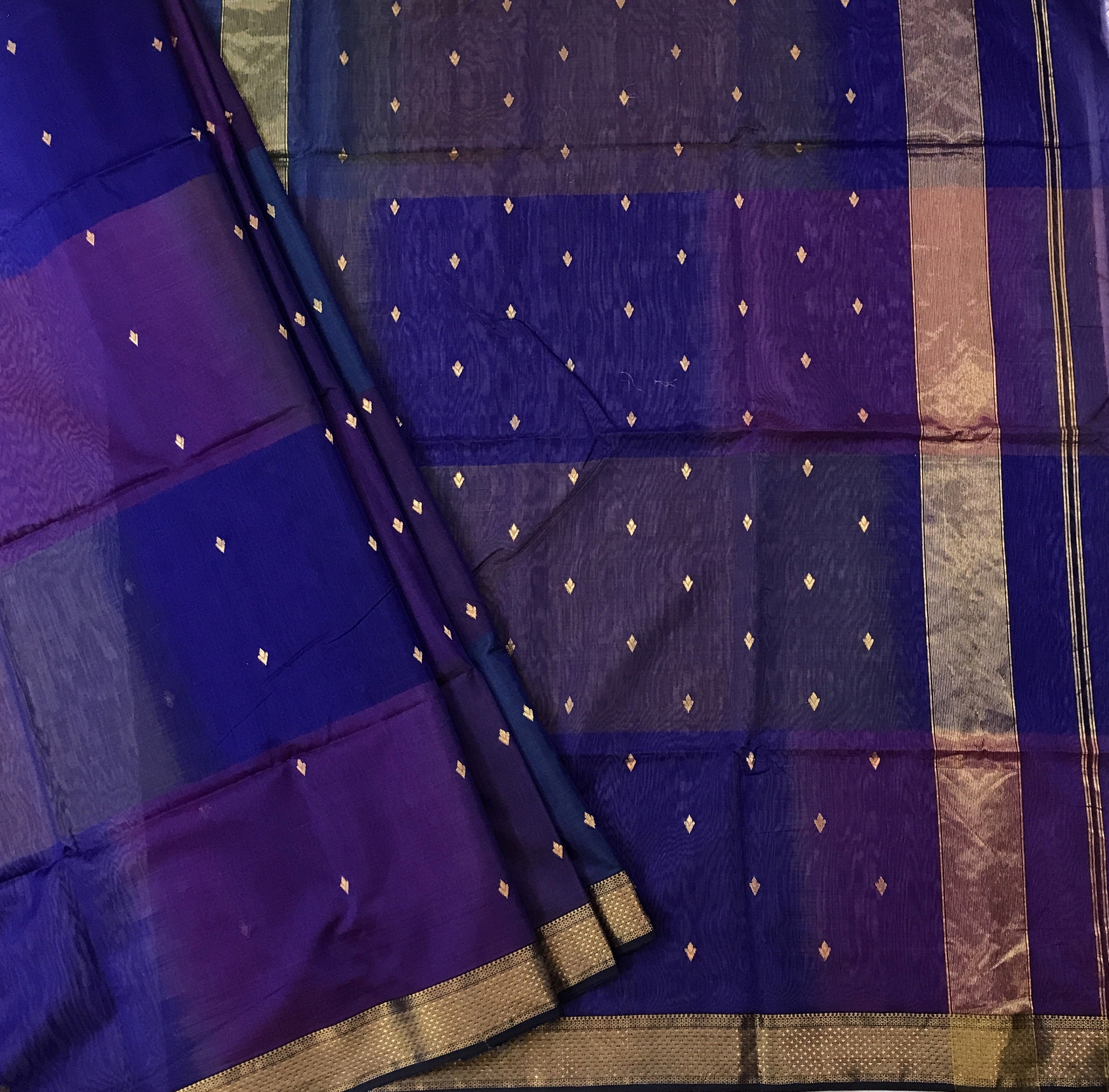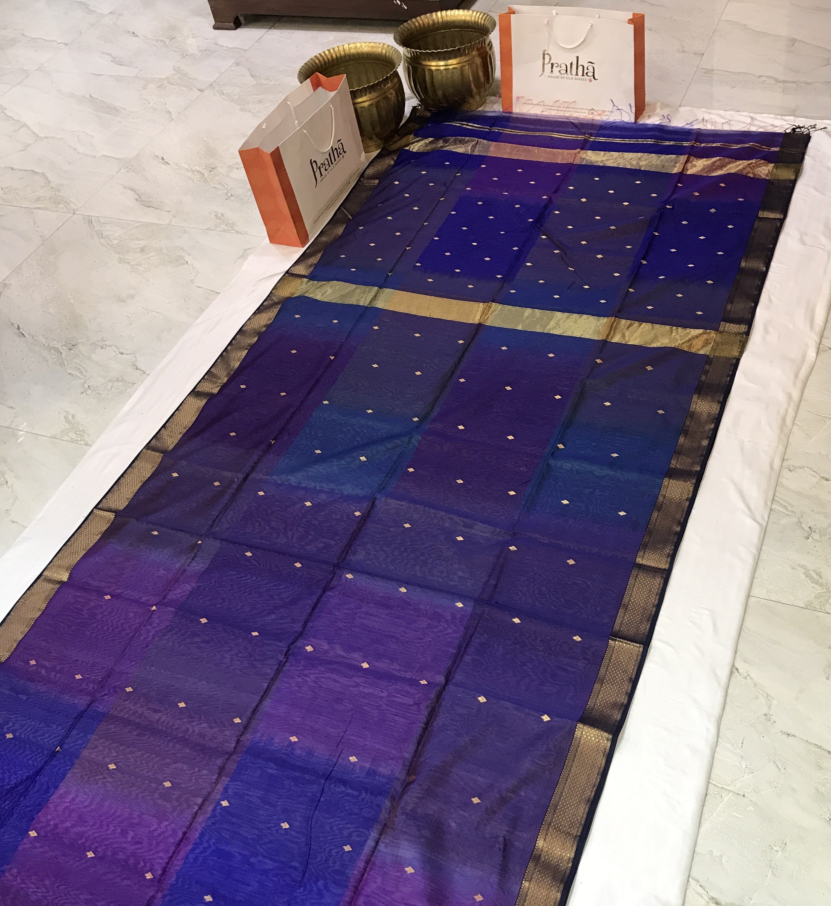 This elegant Maheshwari saree beautifully blends subtlety and sophistication. Its soothing combination of soft blue and purple creates a graceful, serene look, while the delicate gold buttis scattered across the body add just the right amount of shimmer. The finely woven golden zari border, enhancing the overall charm of the drape. Lightweight, airy, and effortlessly classy, this saree is perfect for festive occasions, daytime events, or any celebration where understated elegance is key.