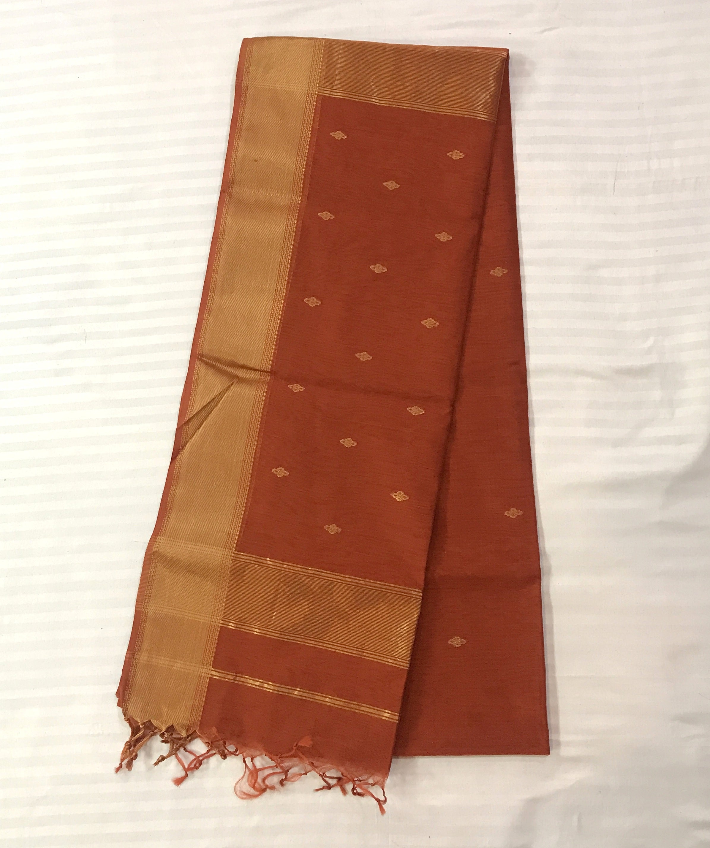 This stunning red Maheshwari saree radiates festive charm and traditional elegance. Adorned with beautifully woven golden floral buttis across the drape, it exudes a rich, graceful appeal that instantly captures attention. The lustrous golden zari border and pallu add a refined touch, perfectly balancing vibrance with sophistication. Lightweight, comfortable, and exquisitely crafted, this saree is an ideal choice for celebrations, special occasions, and timeless wardrobe classics.