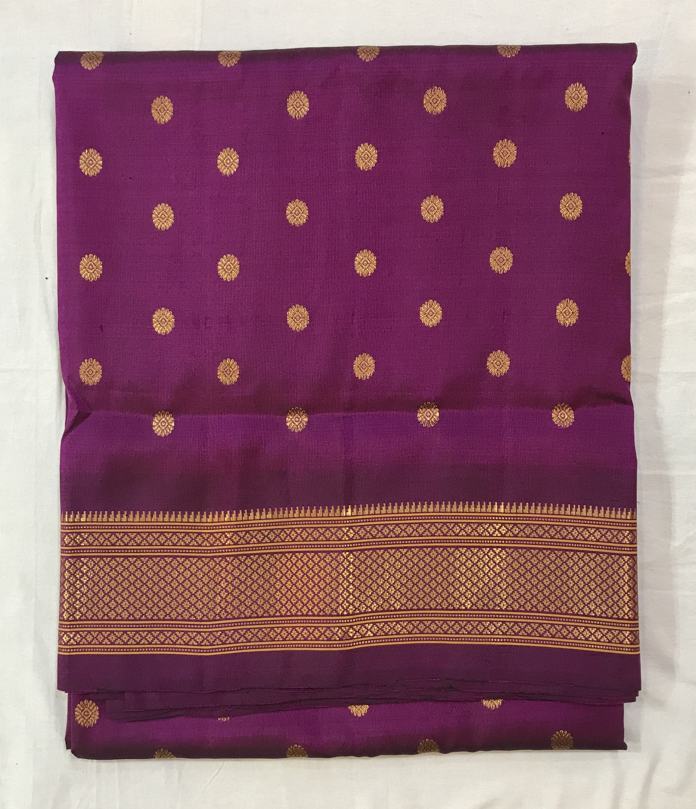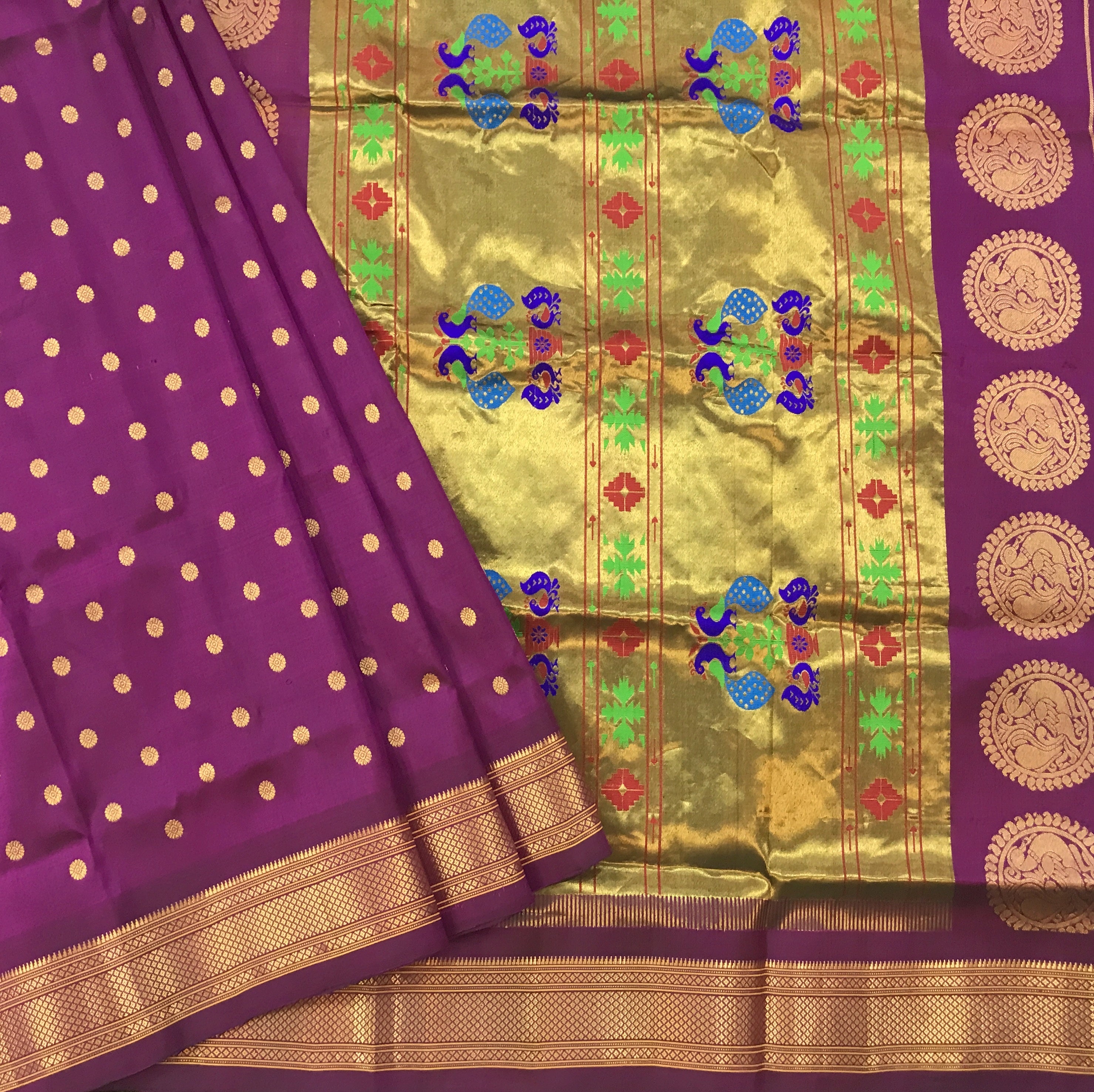 This shade of magenta-wine , a very popular and important colour in many Indian wedding traditions , in a handwoven Paithani with no contrasts as such ! This stunning Paithani flaunts beautiful butti and the classic peacock ( motifs ) zari pallu . Paithani's in one single colour are sought after! Pratha happily presents these in beautiful colours.