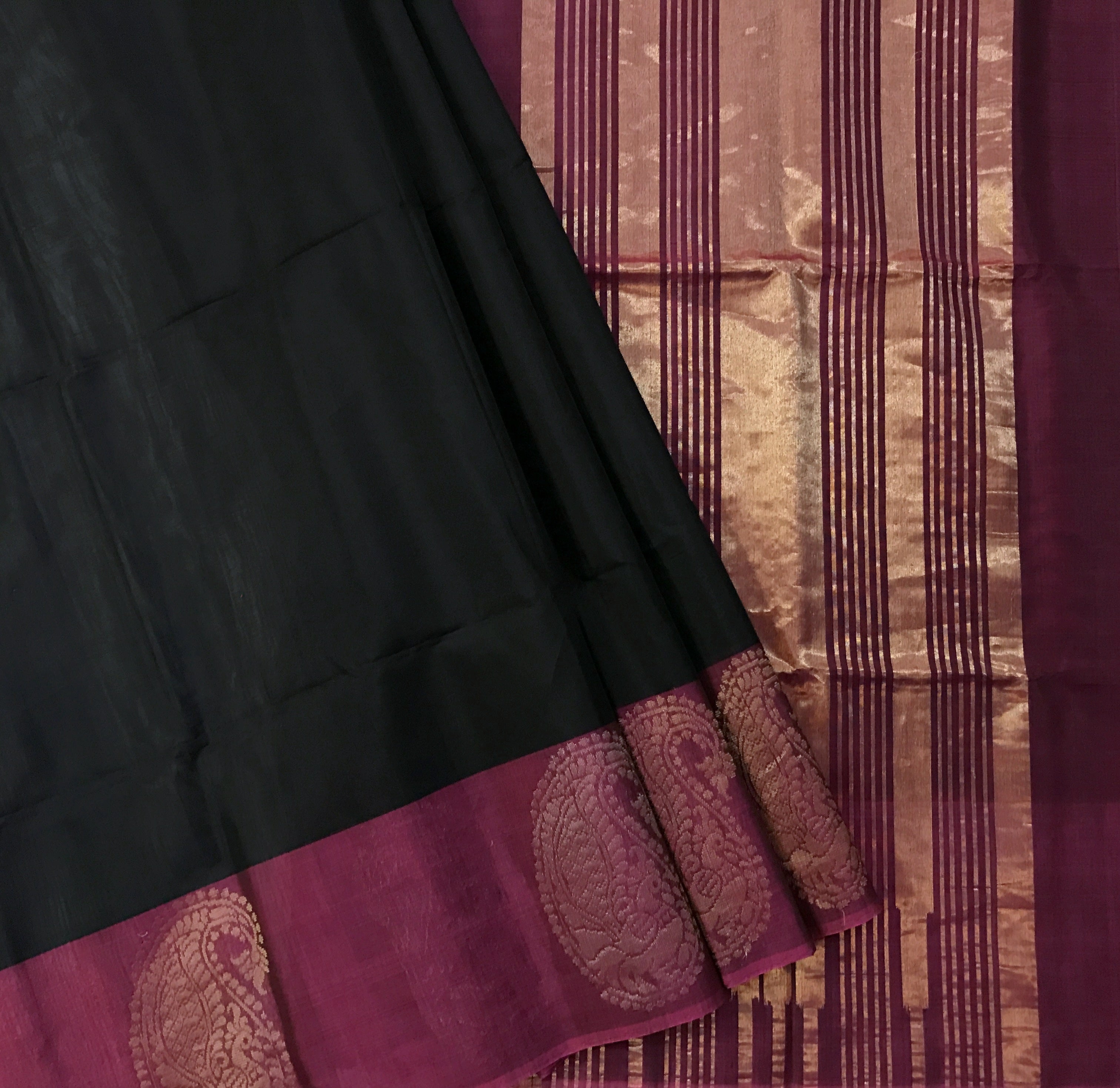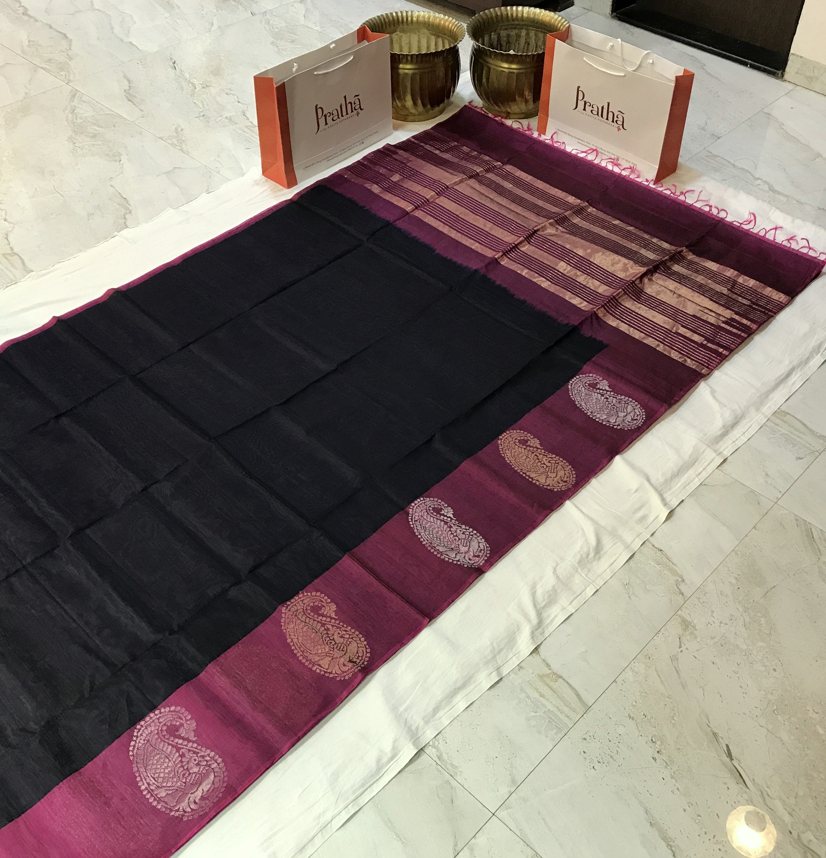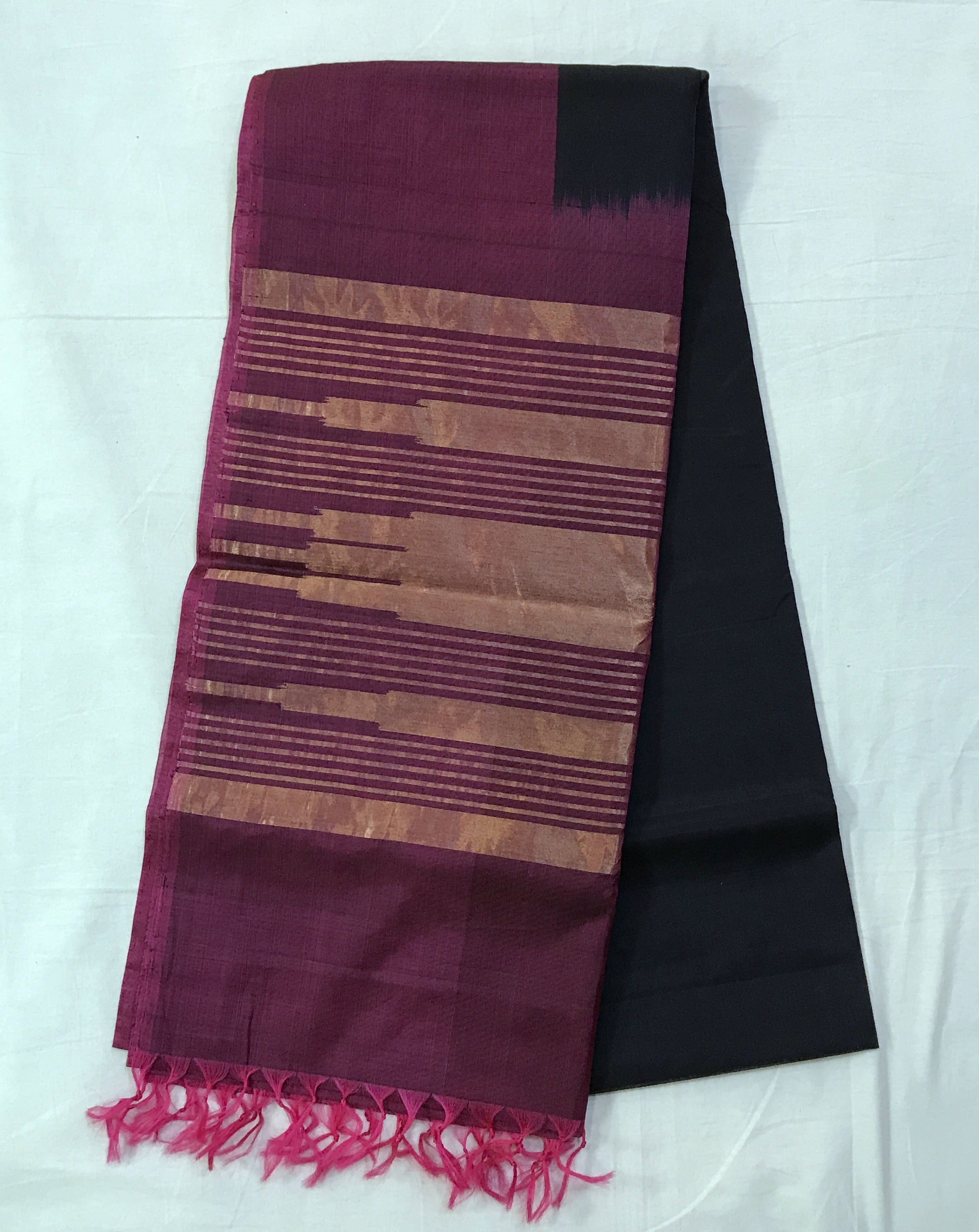 A very different type and plain black coloured Silk Cotton Traditional saree , perfect saree for summers! Do not miss that, this saree has very unique koyari ( motifs ) design on the border and pink golden zari pallu is looks outstanding . Light in weight and easy to drape.