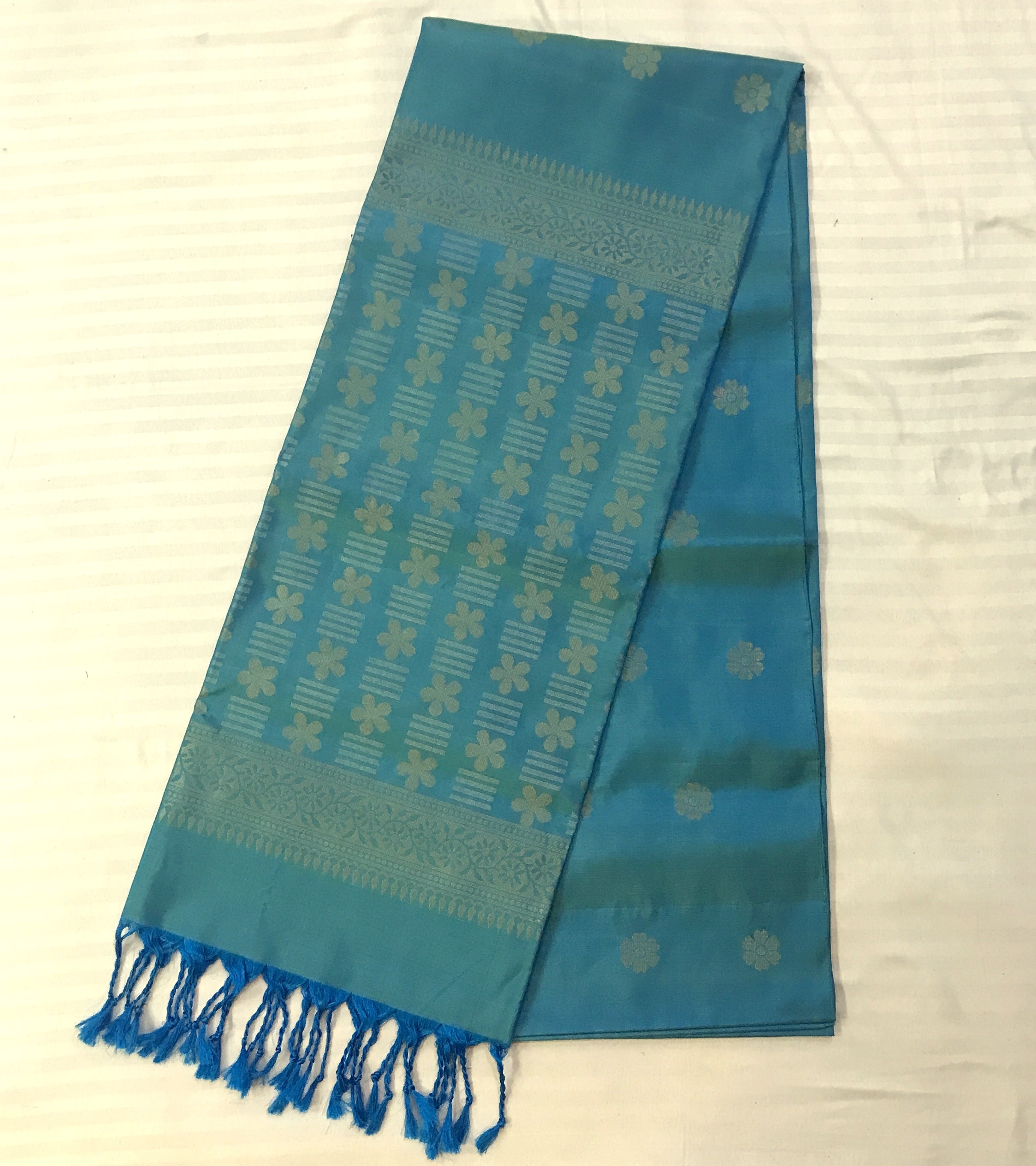 This elegant saree is crafted in a soothing aqua-blue shade, highlighted with delicate gold floral buttis across the body. The pallu is richly woven with traditional floral and striped motifs, framed by a finely detailed border that adds depth and charm. With its soft sheen and graceful drape, this saree is perfect for festive occasions and timeless traditional wear.